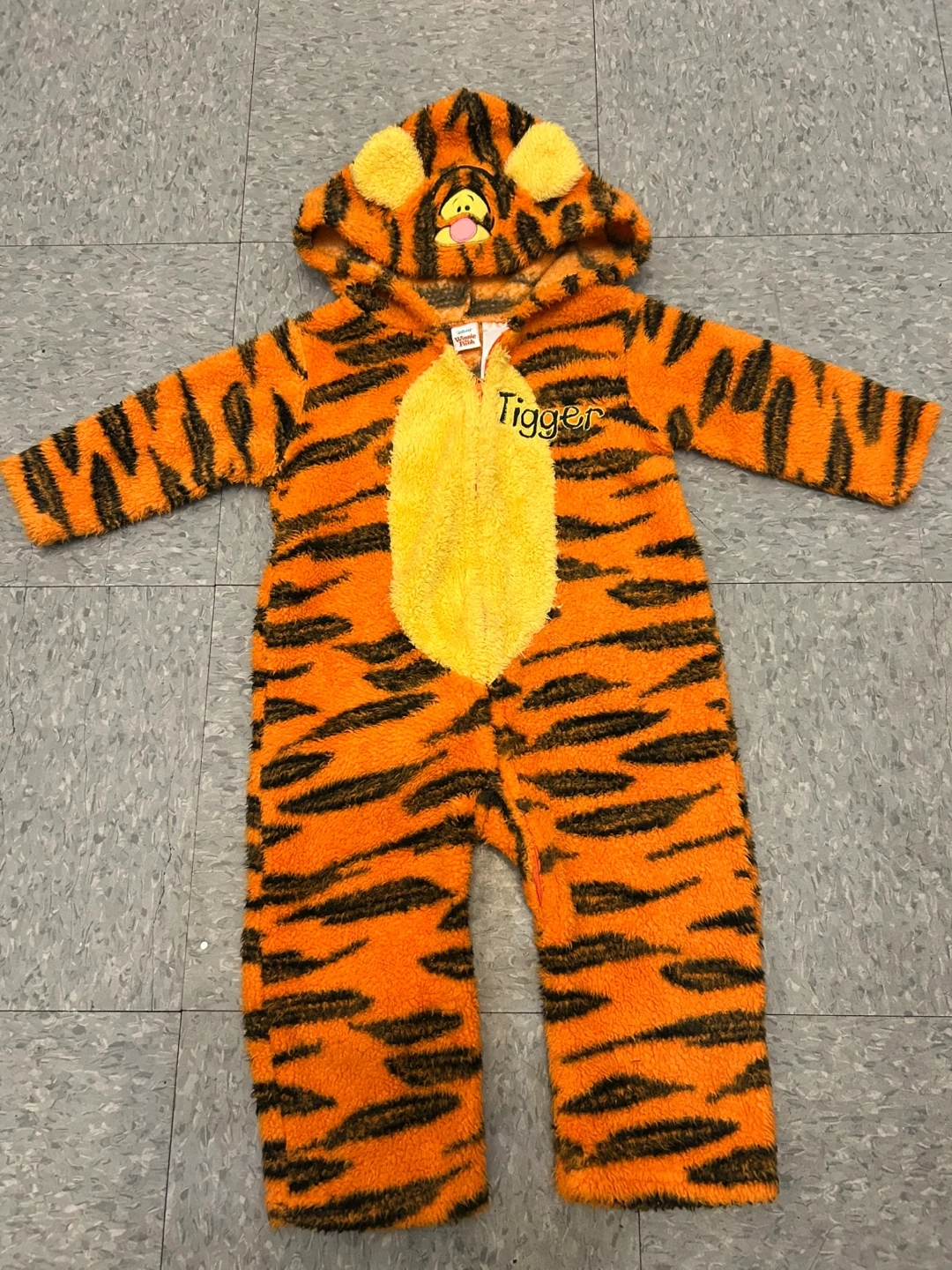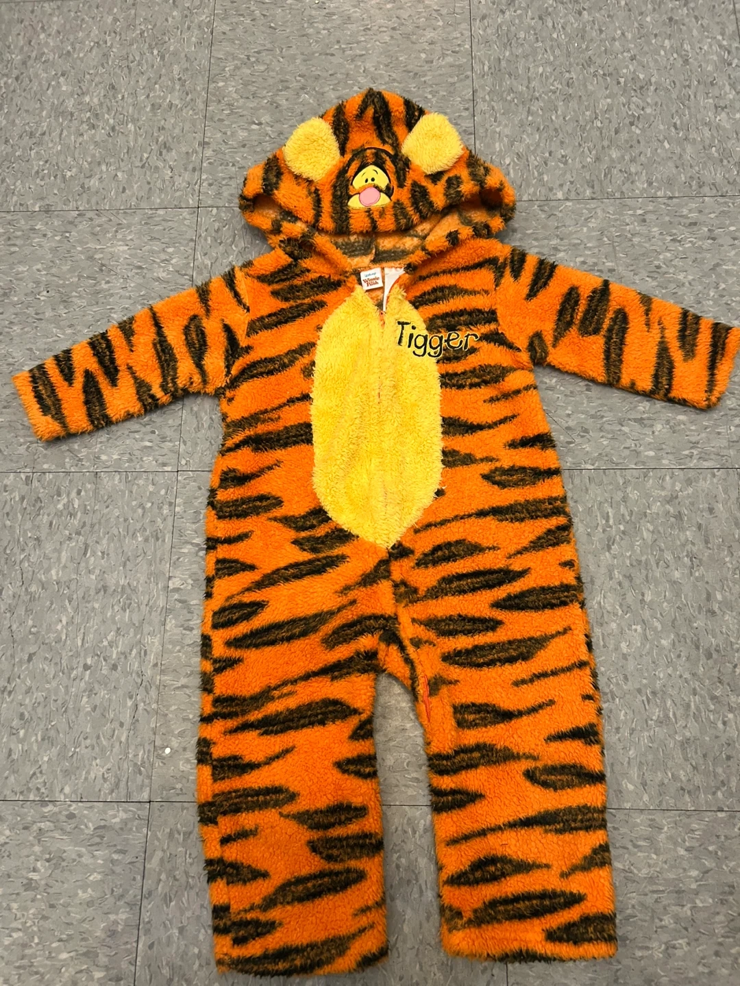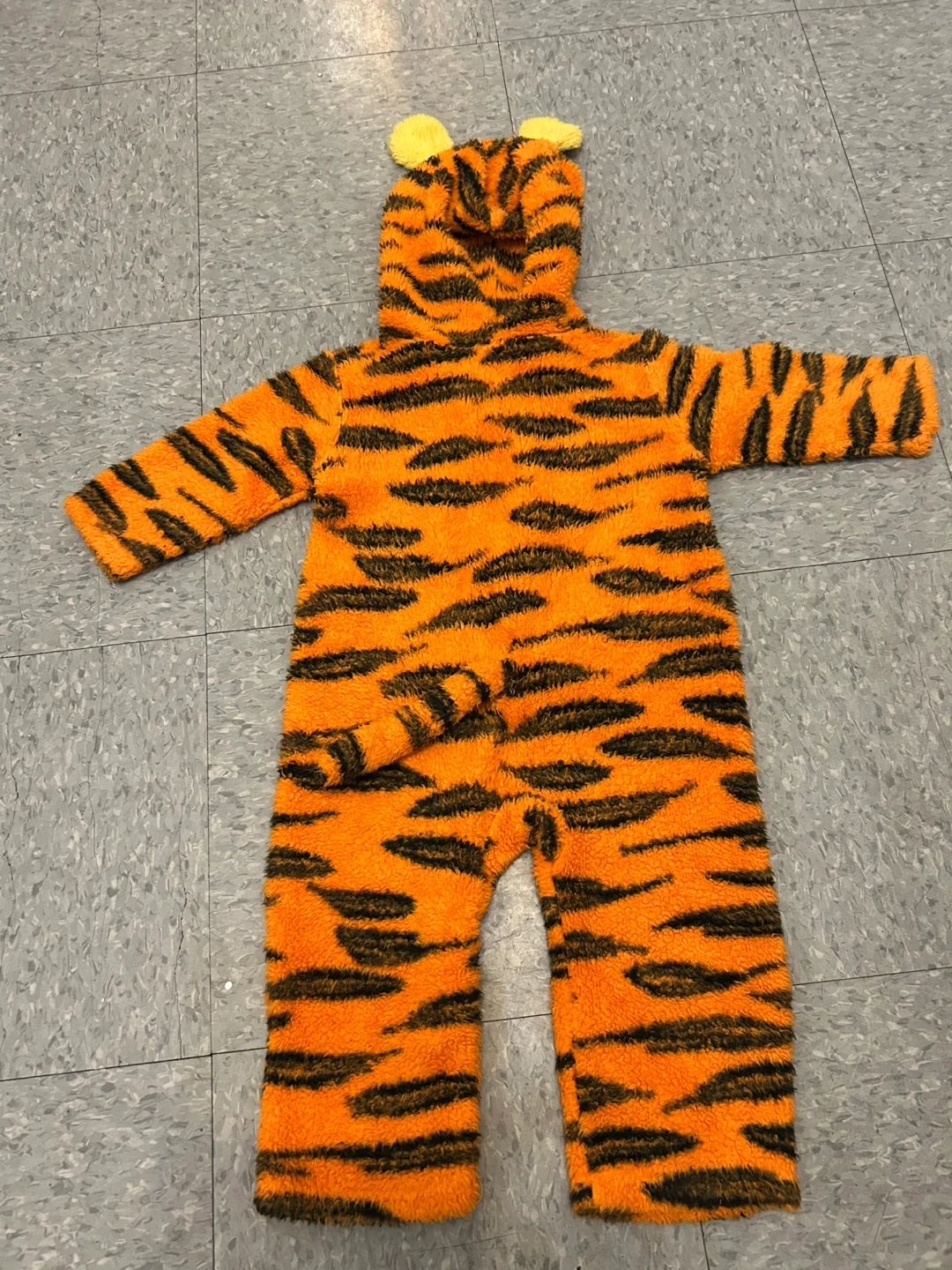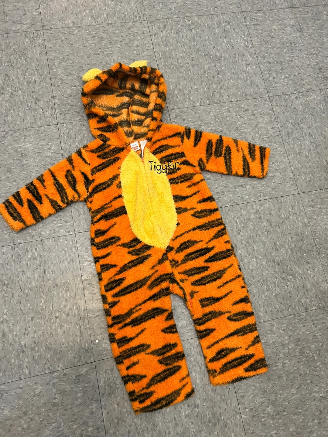 Super cute Tigger costume onesie! It's orange with black stripes and has a hood with Tigger's face on it. Perfect for a little one who loves Winnie the Pooh. It is 18 months old beautiful soft costume