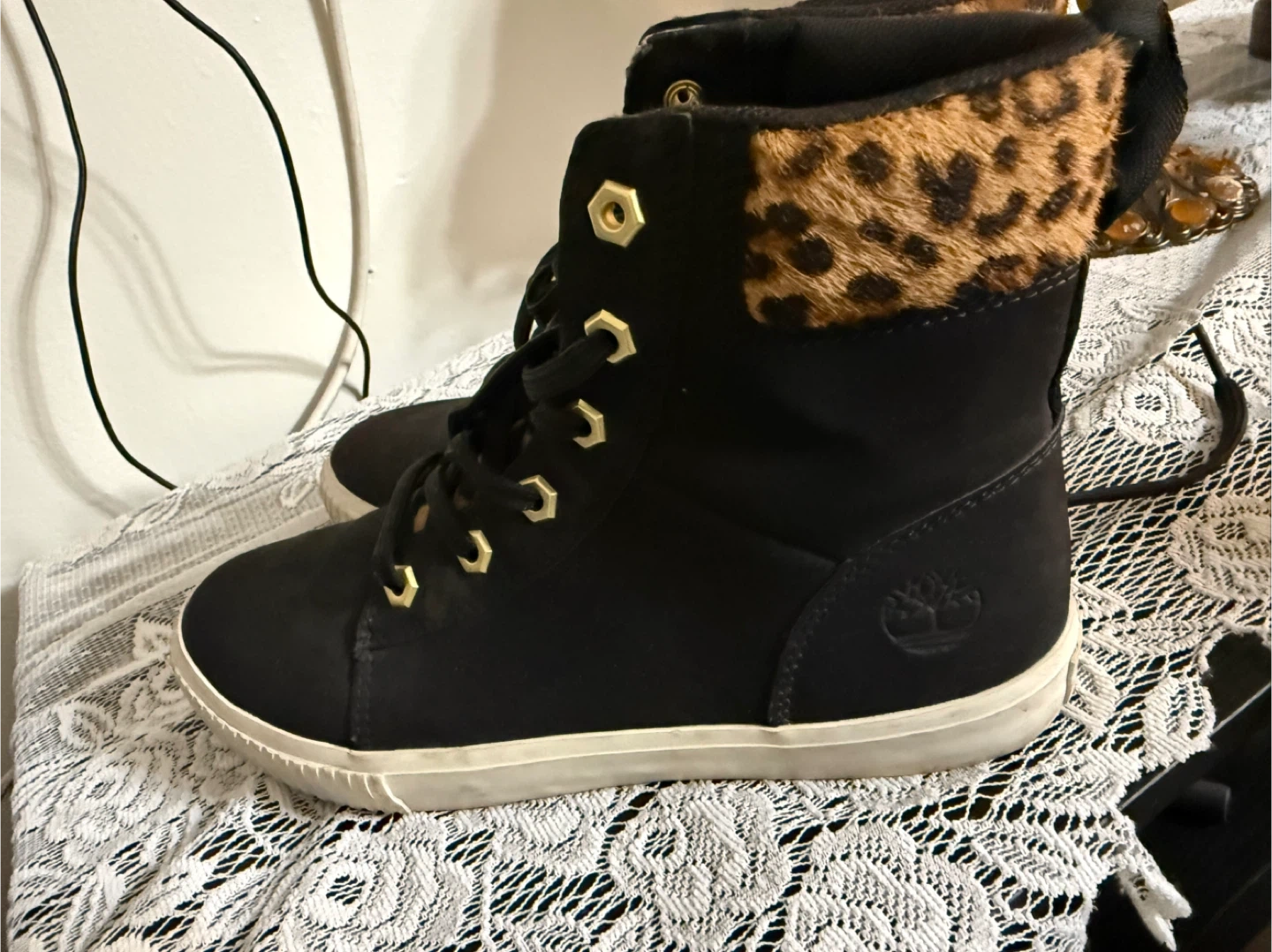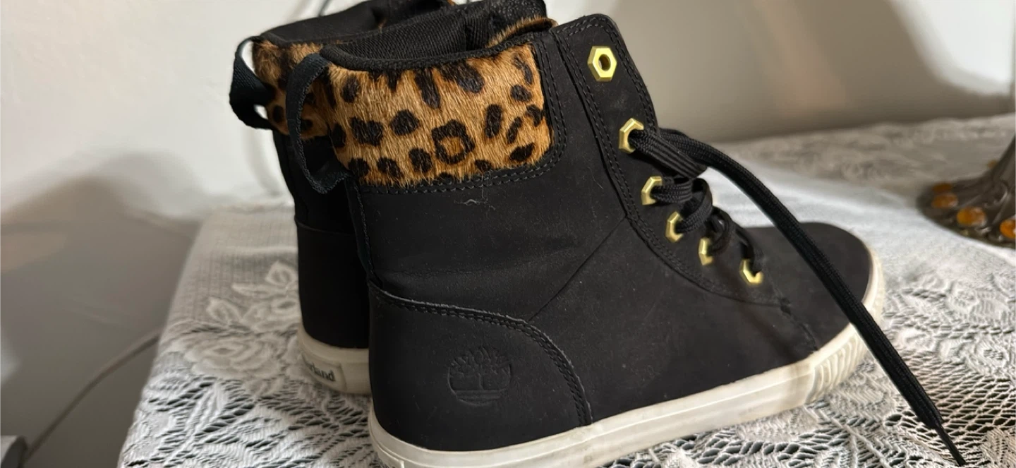 5Selling a pair of Timberland boots in black with a fun leopard print accent! They are in good condition and ready for a new home. The soles show some wear, but they still have plenty of life left in them. Great for adding a bit of style to your everyday look