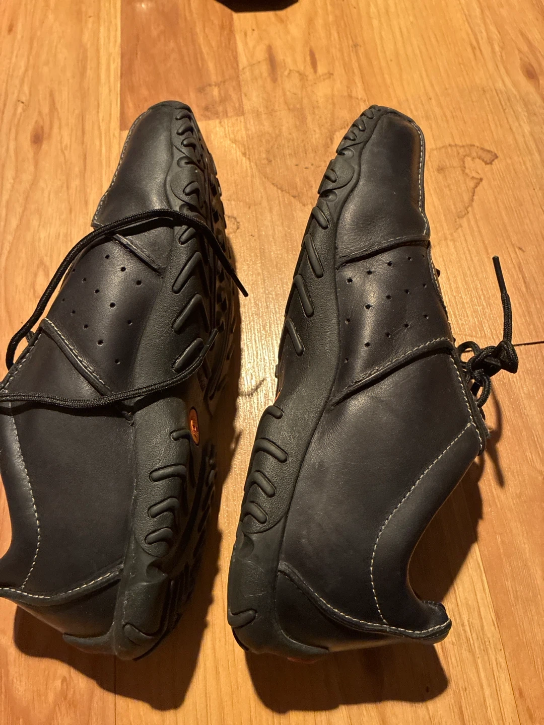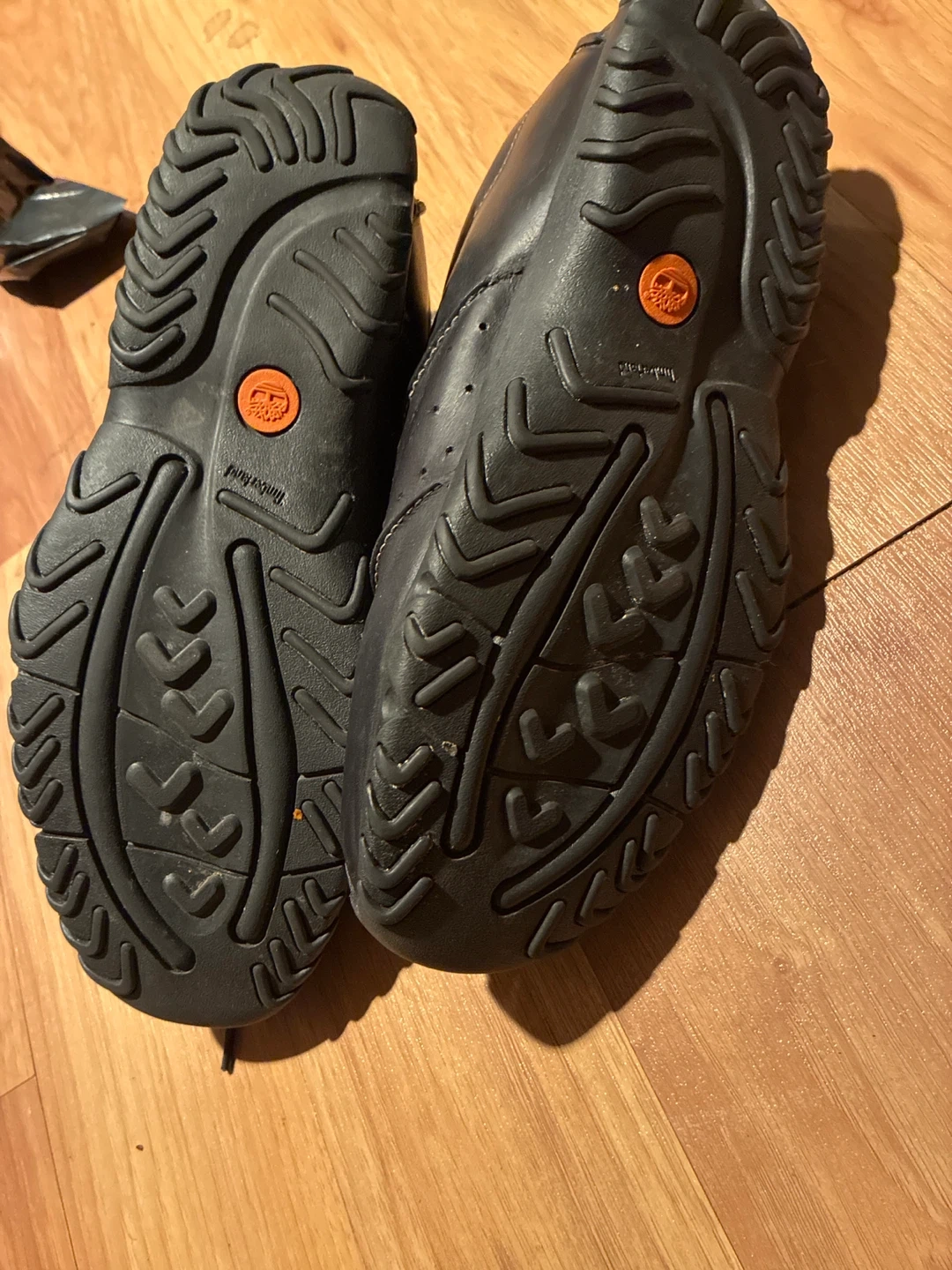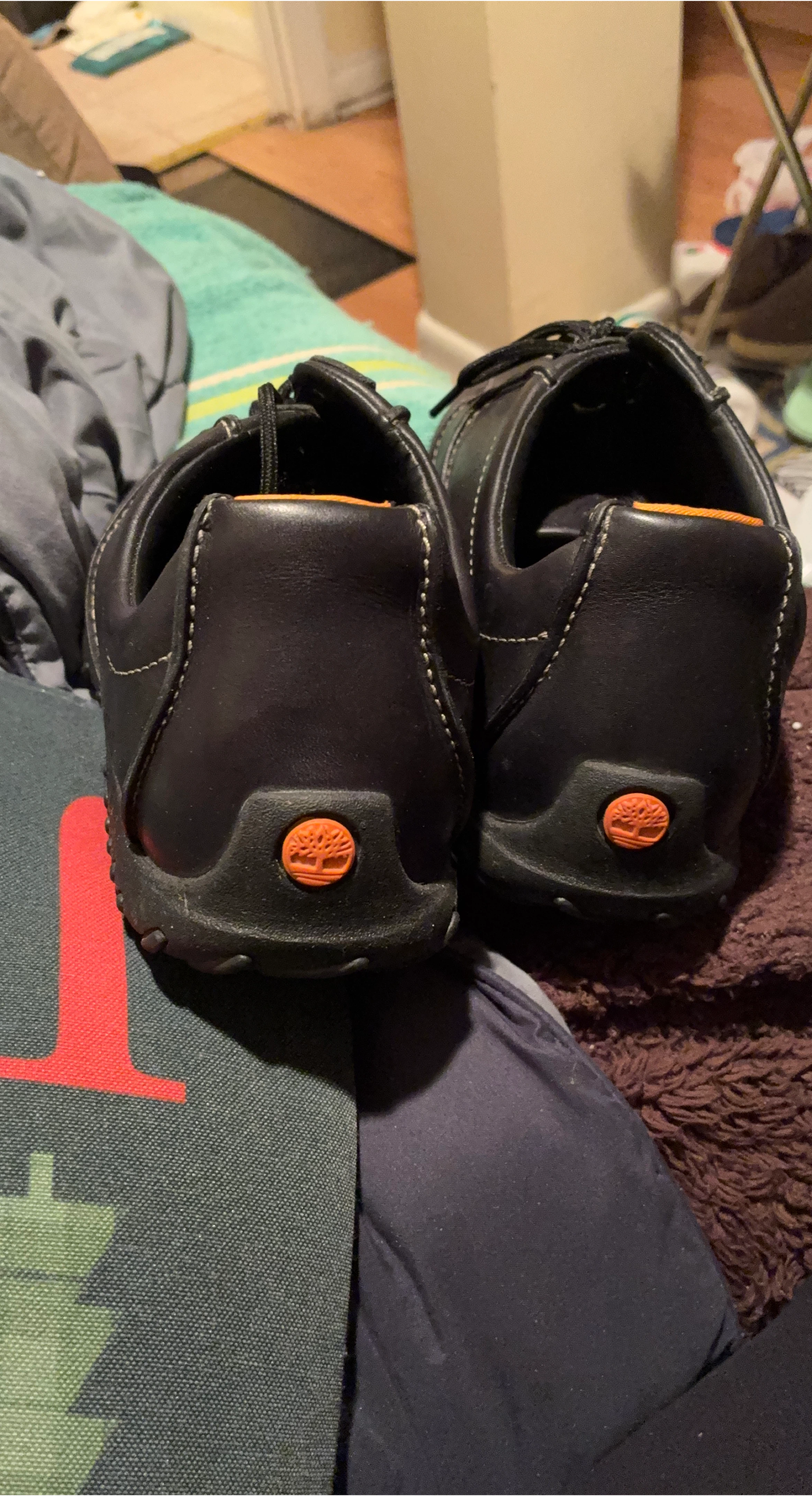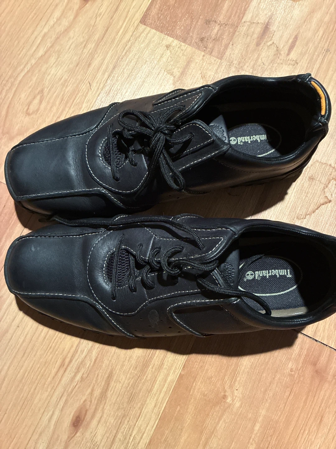 10Selling a pair of Timberland black leather dress casual shoes. They are in good condition and perfect for dressing up or down. The shoes feature a classic design with subtle white stitching and the Timberland logo on the heel and insole