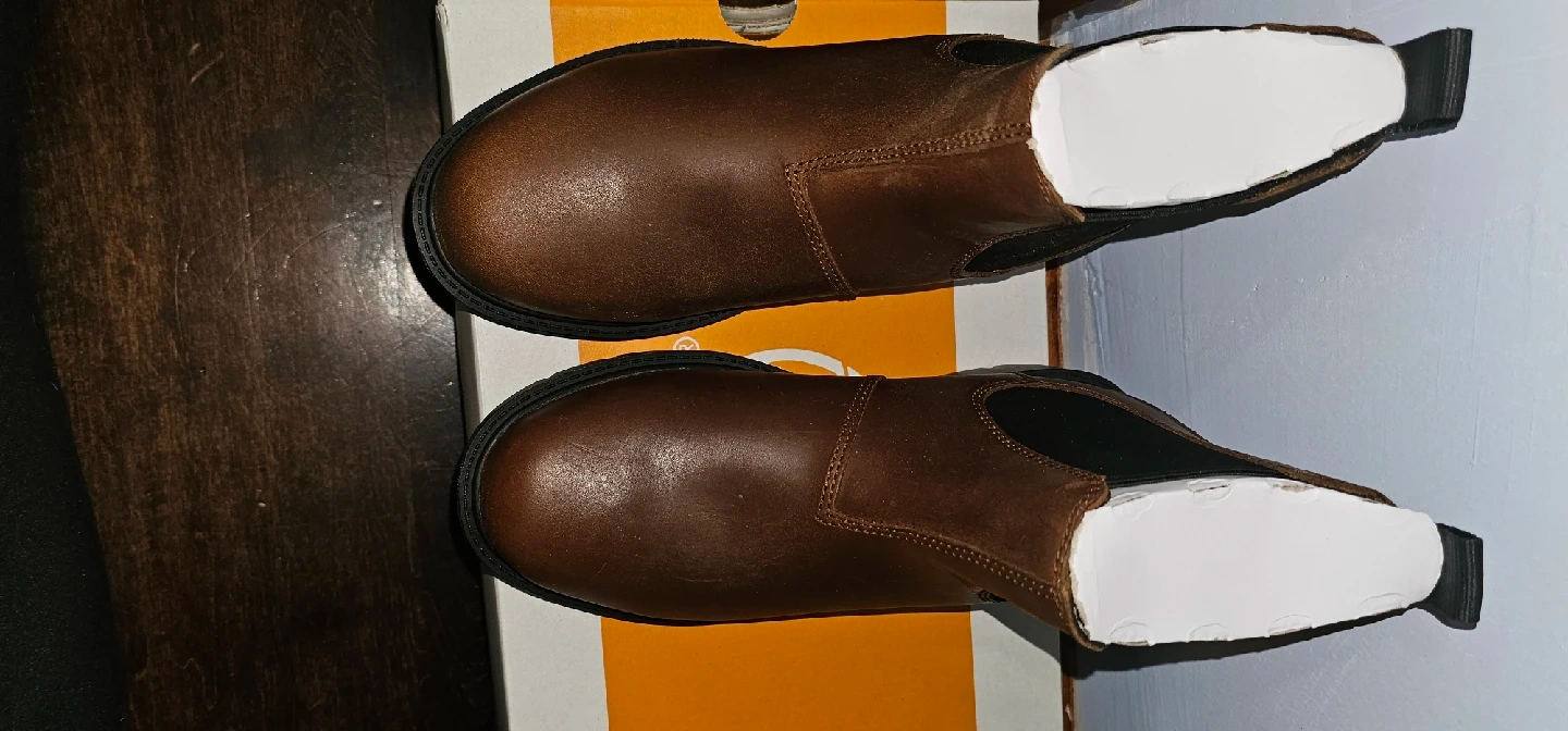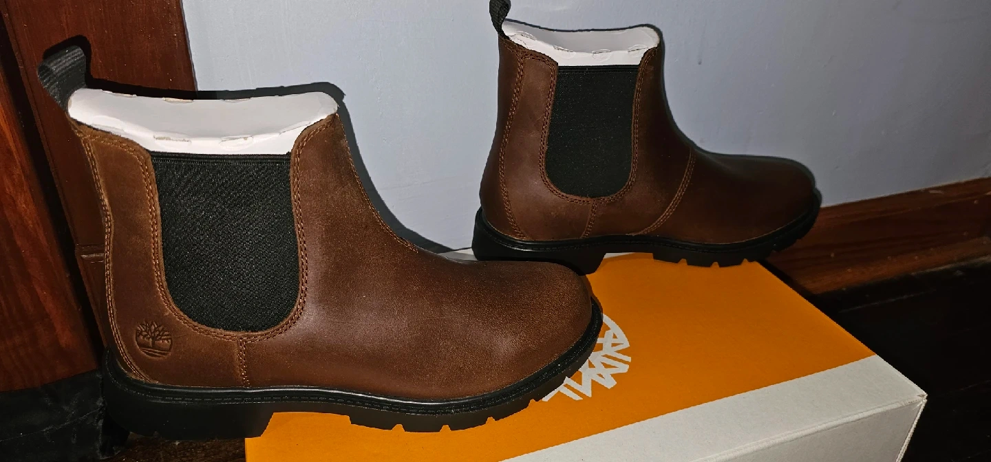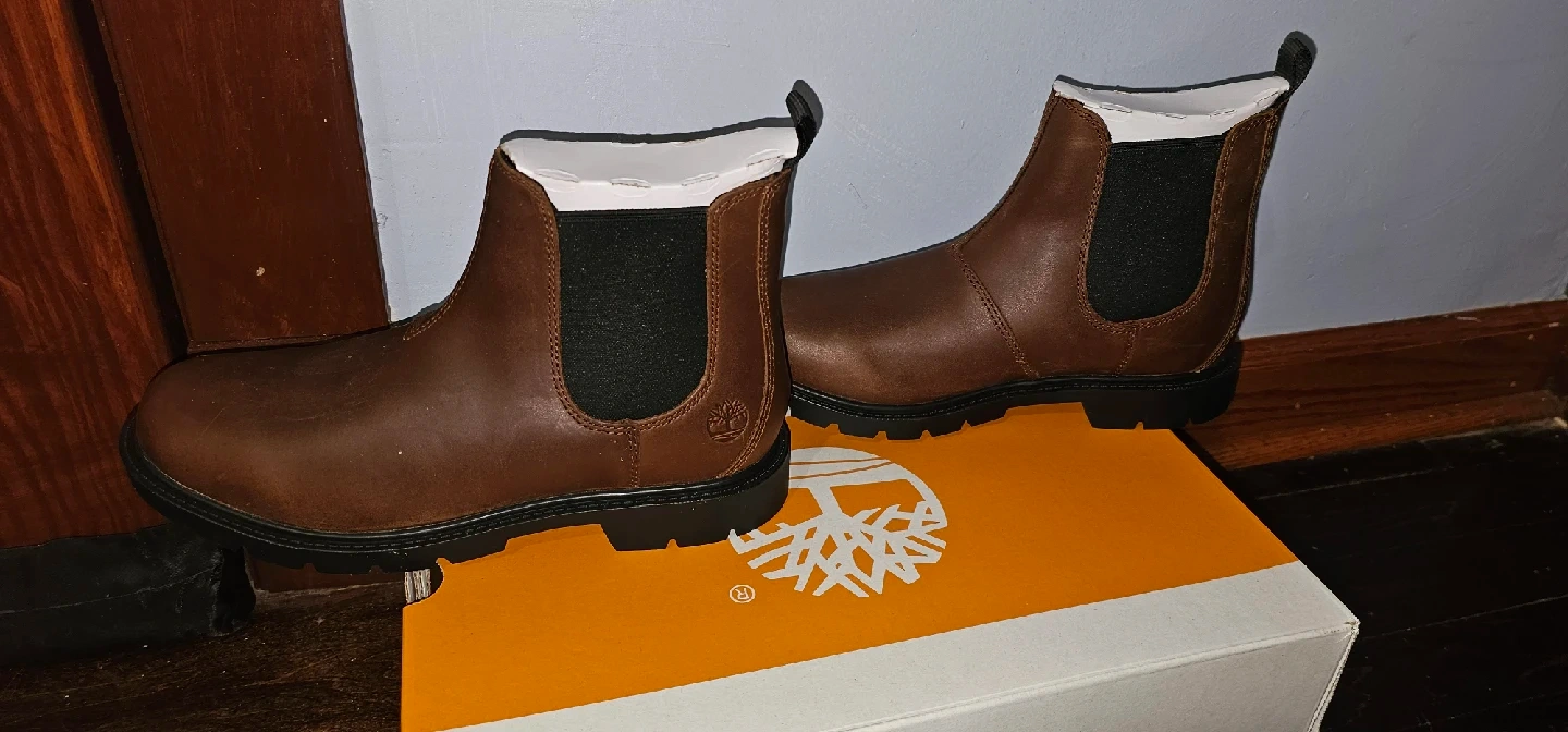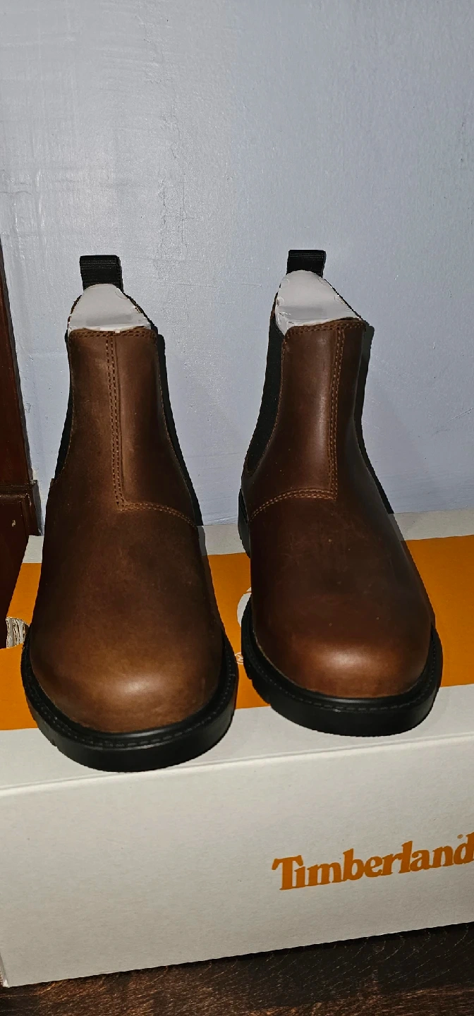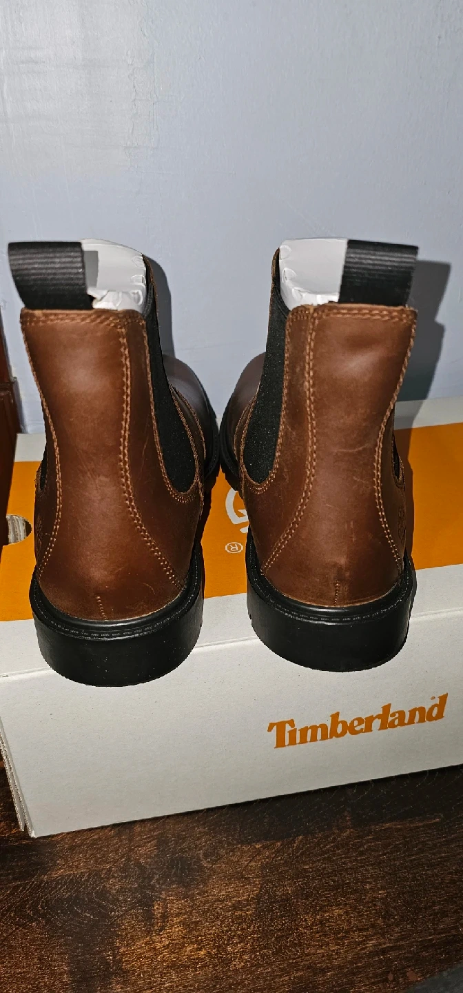 60These are a pair of Timberland Chelsea boots in brown leather. They come with the original box. They are in good condition and ready for a new home! •Brand New Never Worn •Upper made with Premium Timberland® Leather •ReBOTL™ fabric lining •OrthoLite® footbed •Convenient pull-on style •Rubber lug outsole •Imported