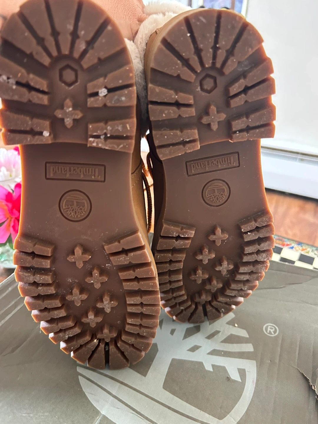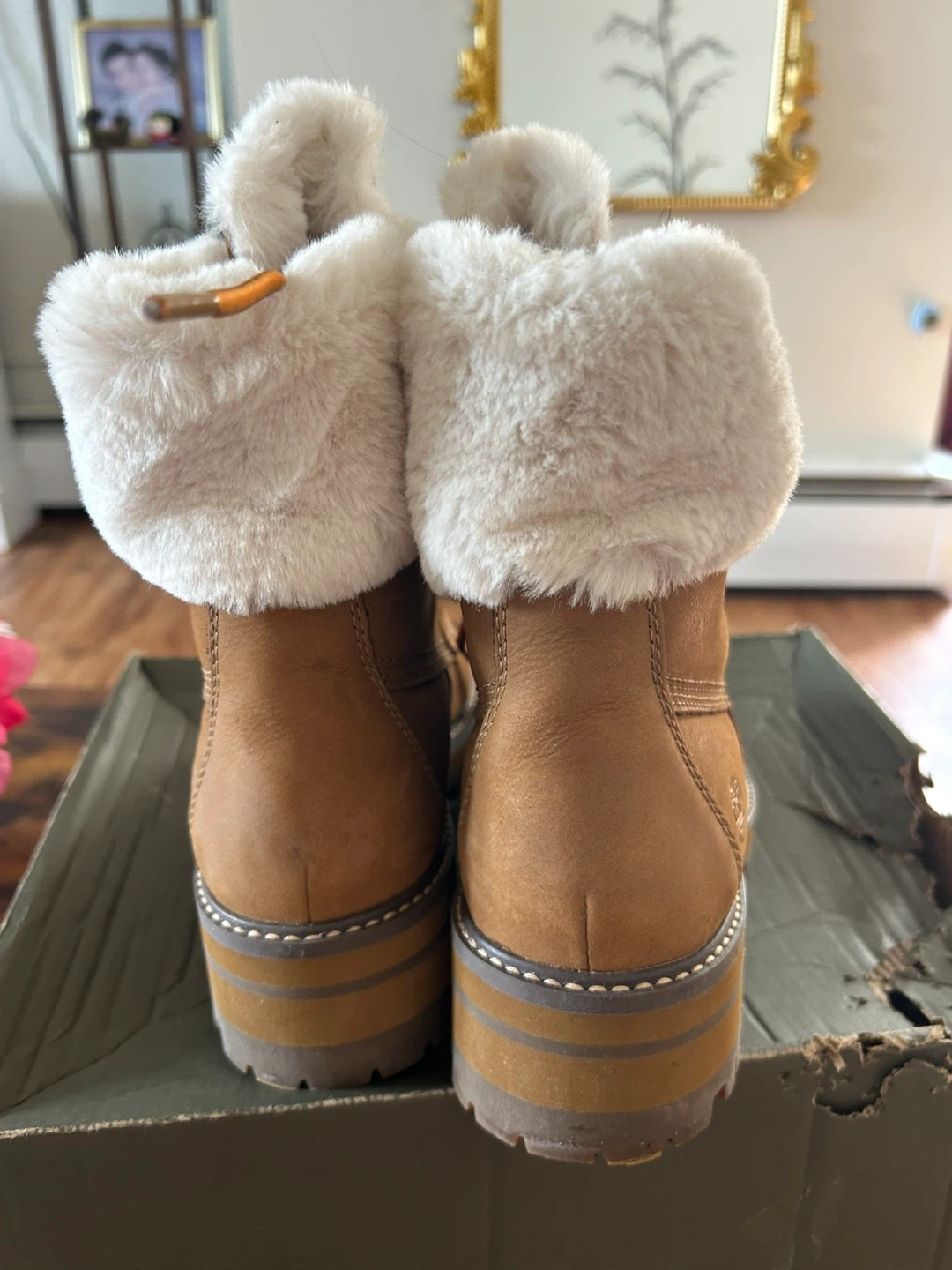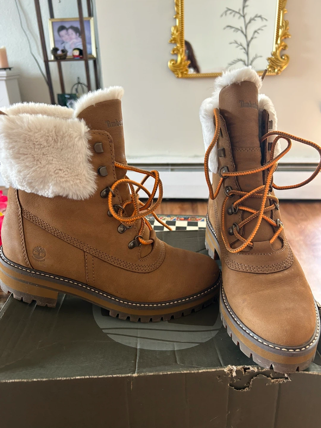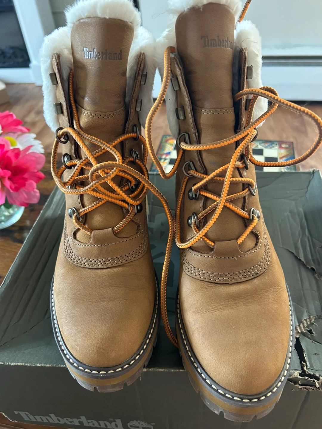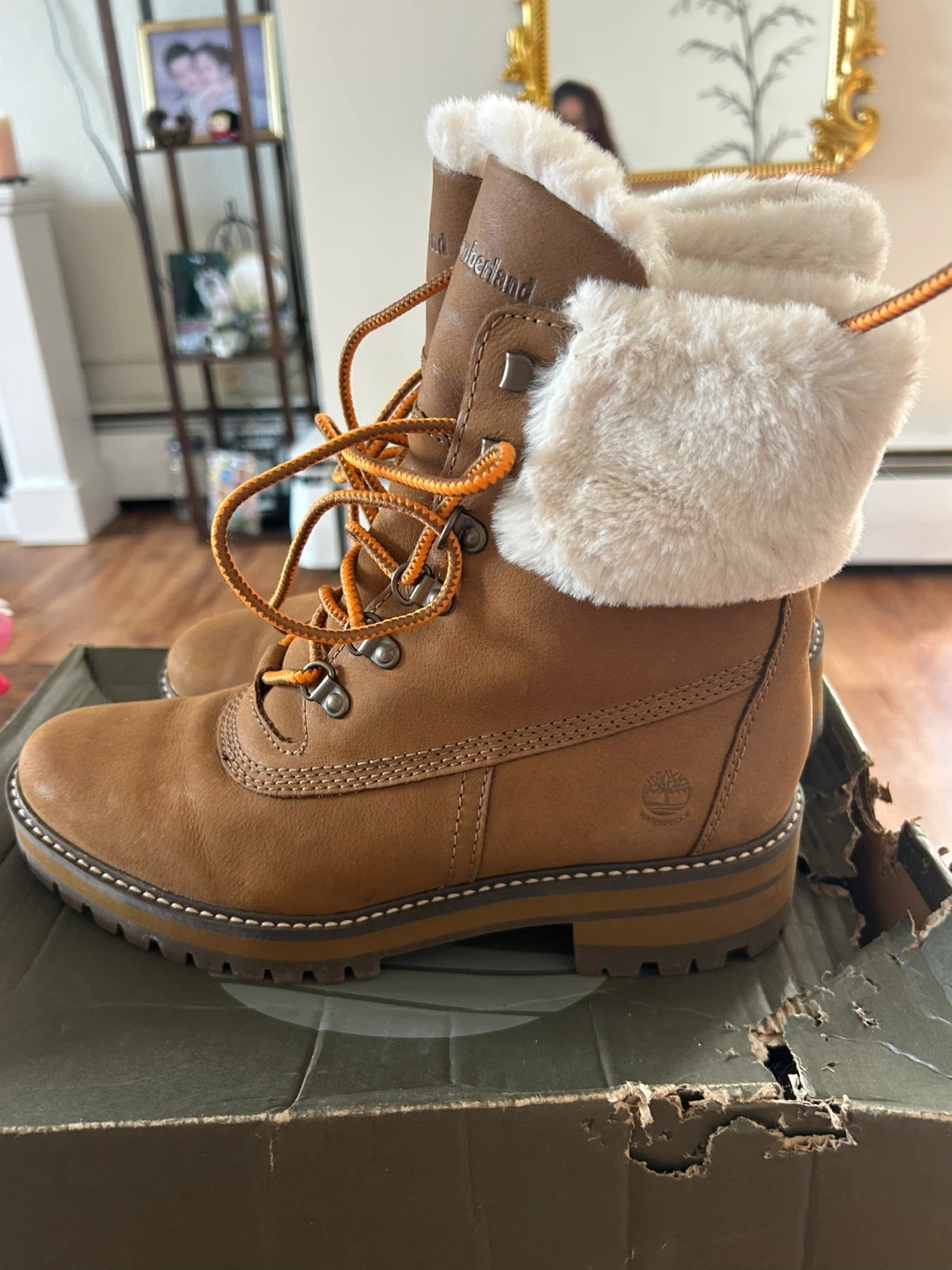 These Timberland boots are a stylish and cozy choice for colder weather! They feature a brown leather exterior with a soft, faux fur trim. The boots have orange laces and a sturdy sole, perfect for everyday wear. They come with their original box too