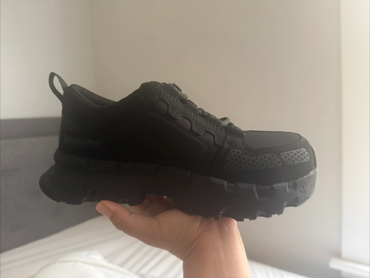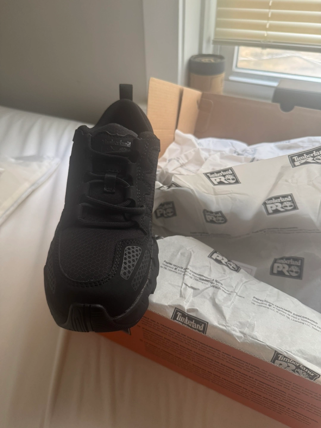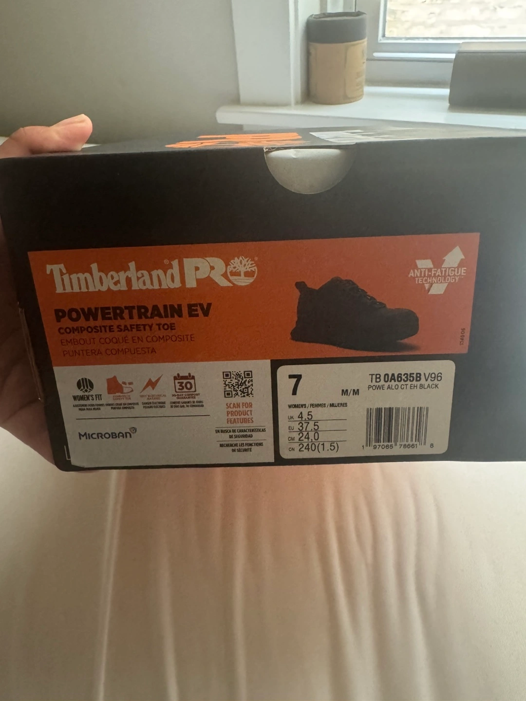 Selling a pair of Timberland Pro Powertrain EV composite toe work shoes in size 7. They are black and come with the original box. The shoes feature Anti-Fatigue Technology.