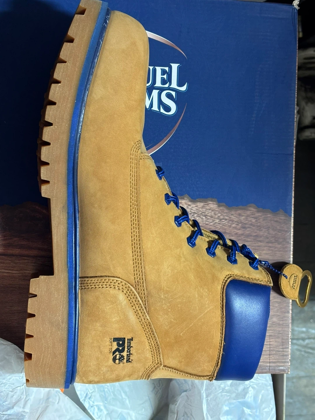 65Selling a Timberland PRO soft toe work boot. It features a tan color with blue accents. Comes with the original box! Rare collection item.