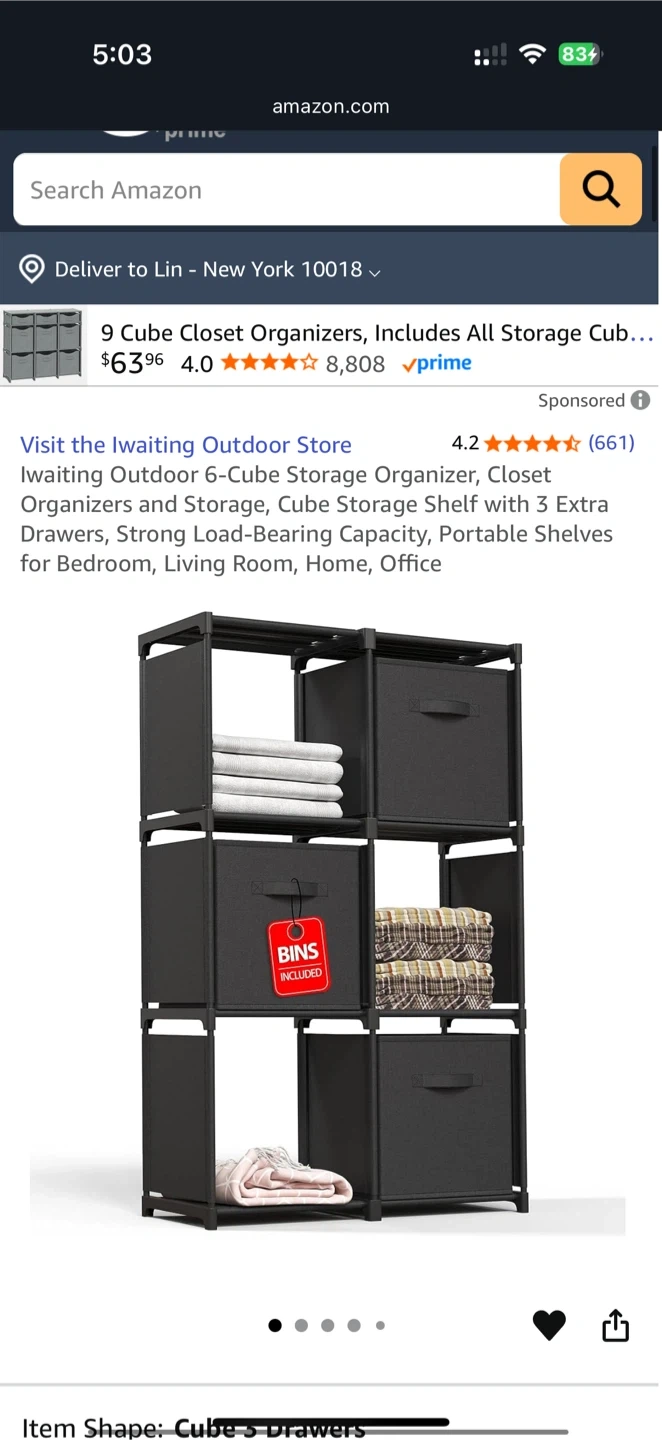 6-cube storage organizer https://www.amazon.com/Iwaiting-Outdoor-Storage-Organizer-Cube/dp/B0BQR27BT8 This is real good as a partition and to keep things stored It is easy to assemble and can be dissembled for storage and includes three black fabric cabinets Current sales price: $30+tax2.5=$32.5 Selling price: $24