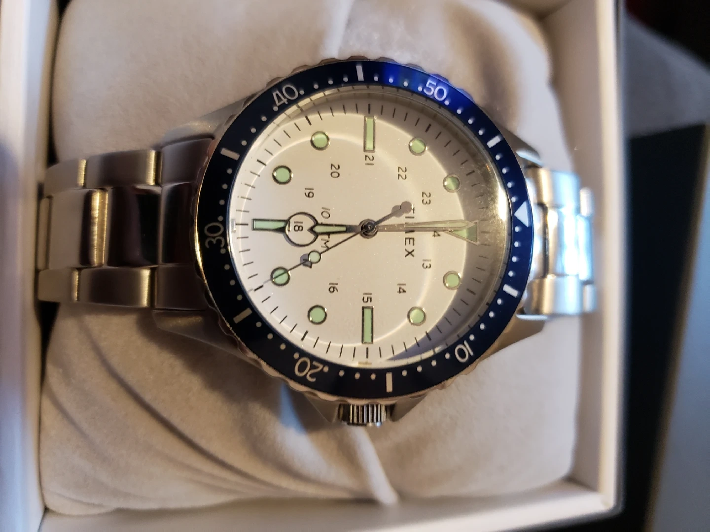 Selling a Timex watch! It's in great condition and comes with the original box. The watch features a silver band and a white face with blue accents. A stylish and reliable timepiece!