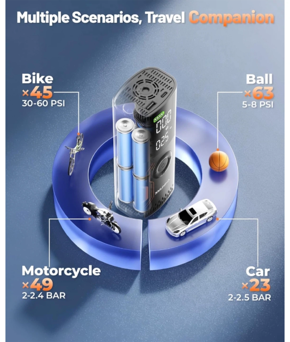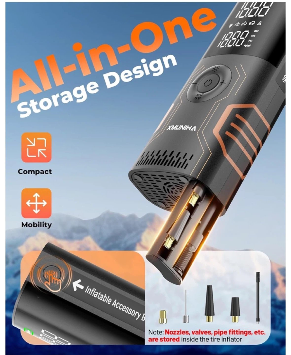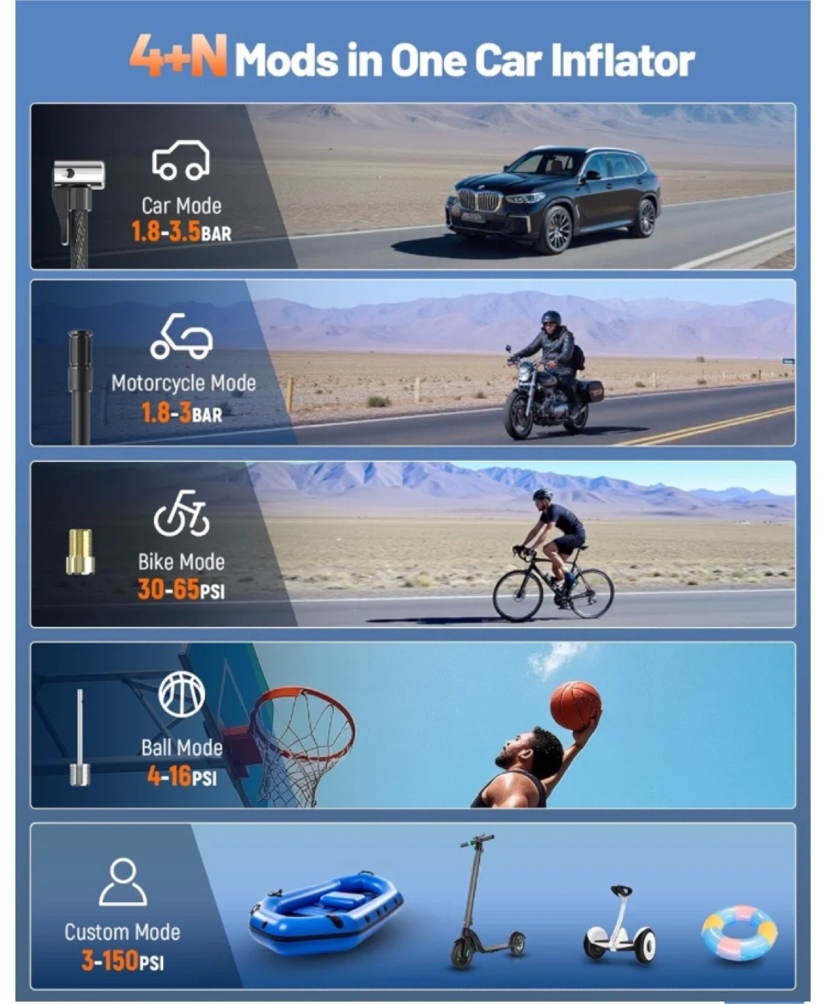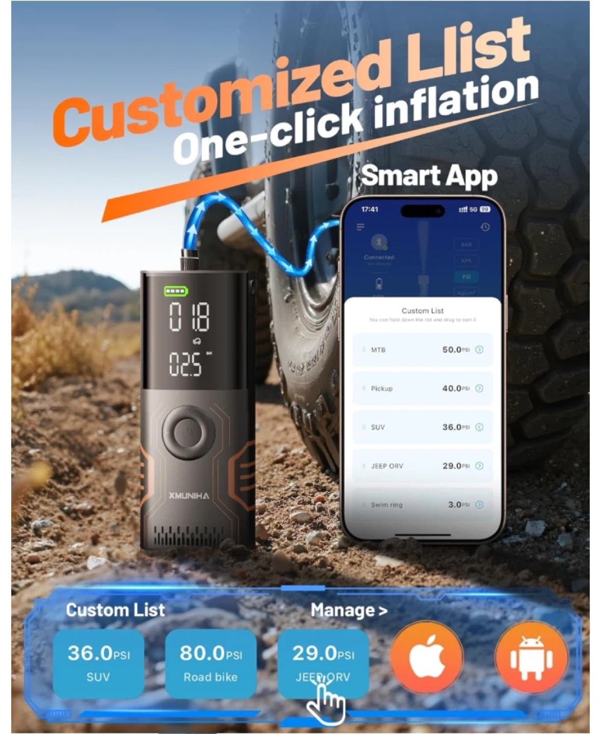 60Tire Inflator Portable Air Compressor - Smart APP Control Bike Pump, All-in-One Storage Air Pump for Car Tires, 150PSI Tire Pump with Digital Gauge, Cordless Pump for Car, Motorcycles, Bikes, Balls