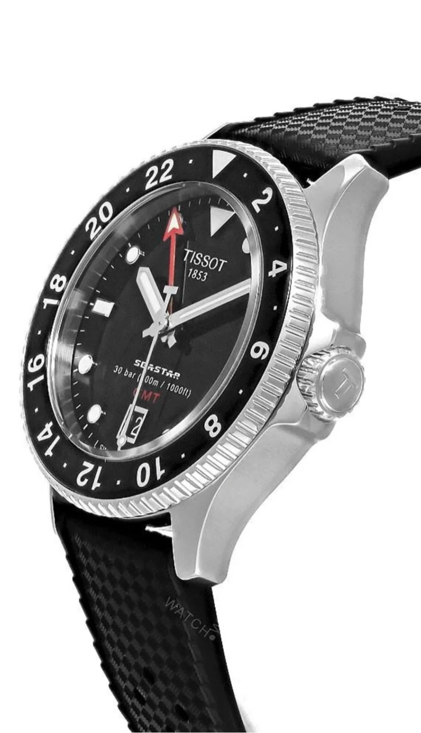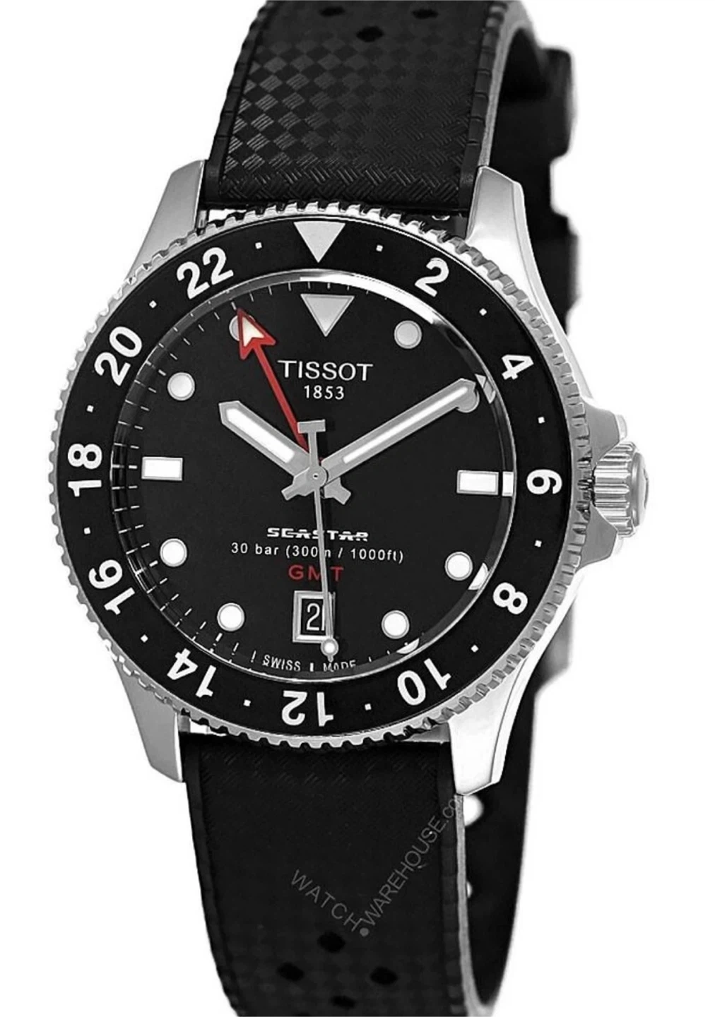 Selling a Tissot Seastar 1000 GMT watch with a black dial. The watch is in great condition and features a stainless steel case and sapphire crystal. It's water-resistant to 30 bar (300m/1000ft). The GMT function is perfect for tracking multiple time zones