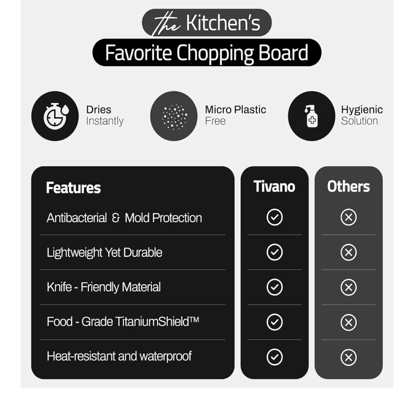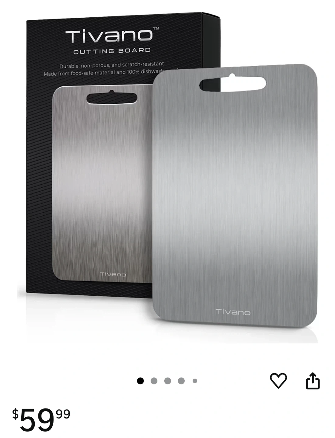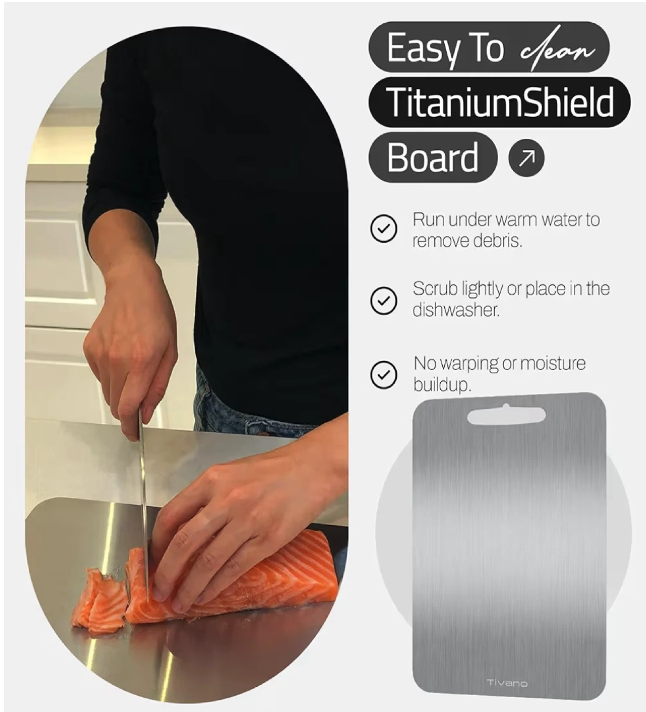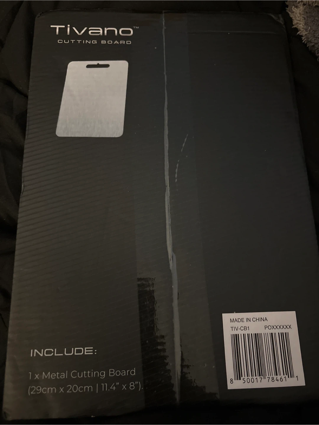 1000+Selling a brand new Tivano Titanium cutting board! It's still in the box and has never been used. - Durable, non-porous, and scratch-resistant - Made from food-safe material - 100% dishwasher safe - Includes 1 metal cutting board (29cm x 20cm | 11.4" x 8") - Orderless and antibacterial