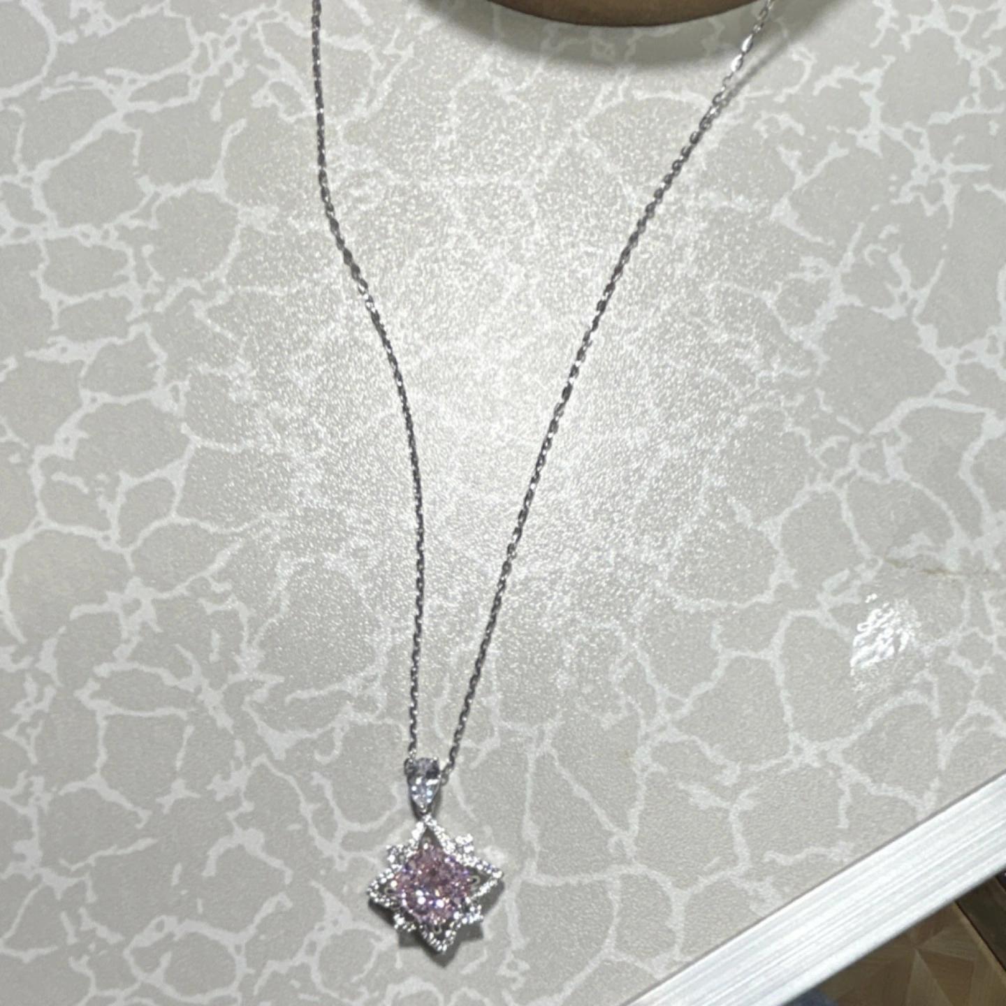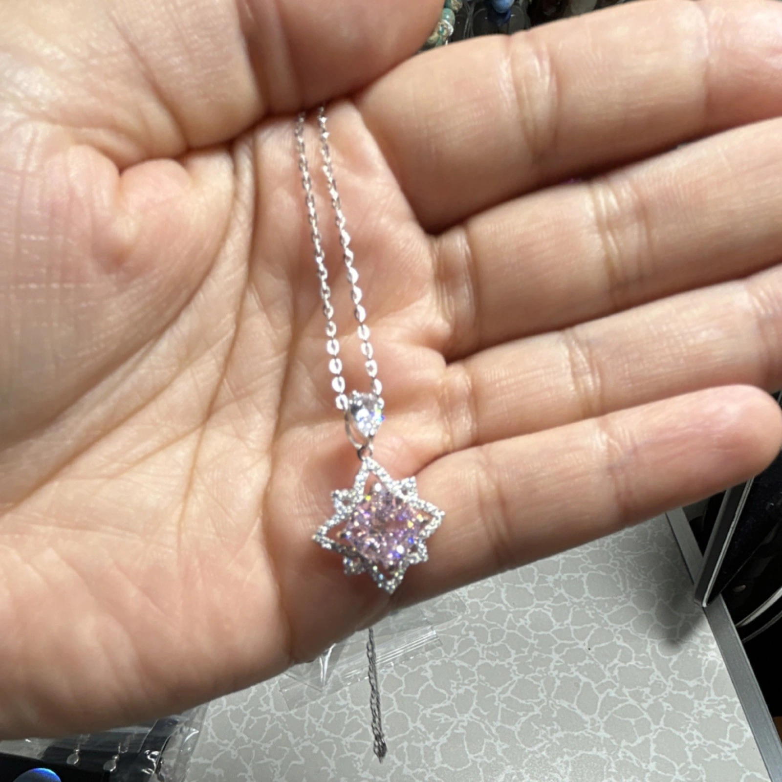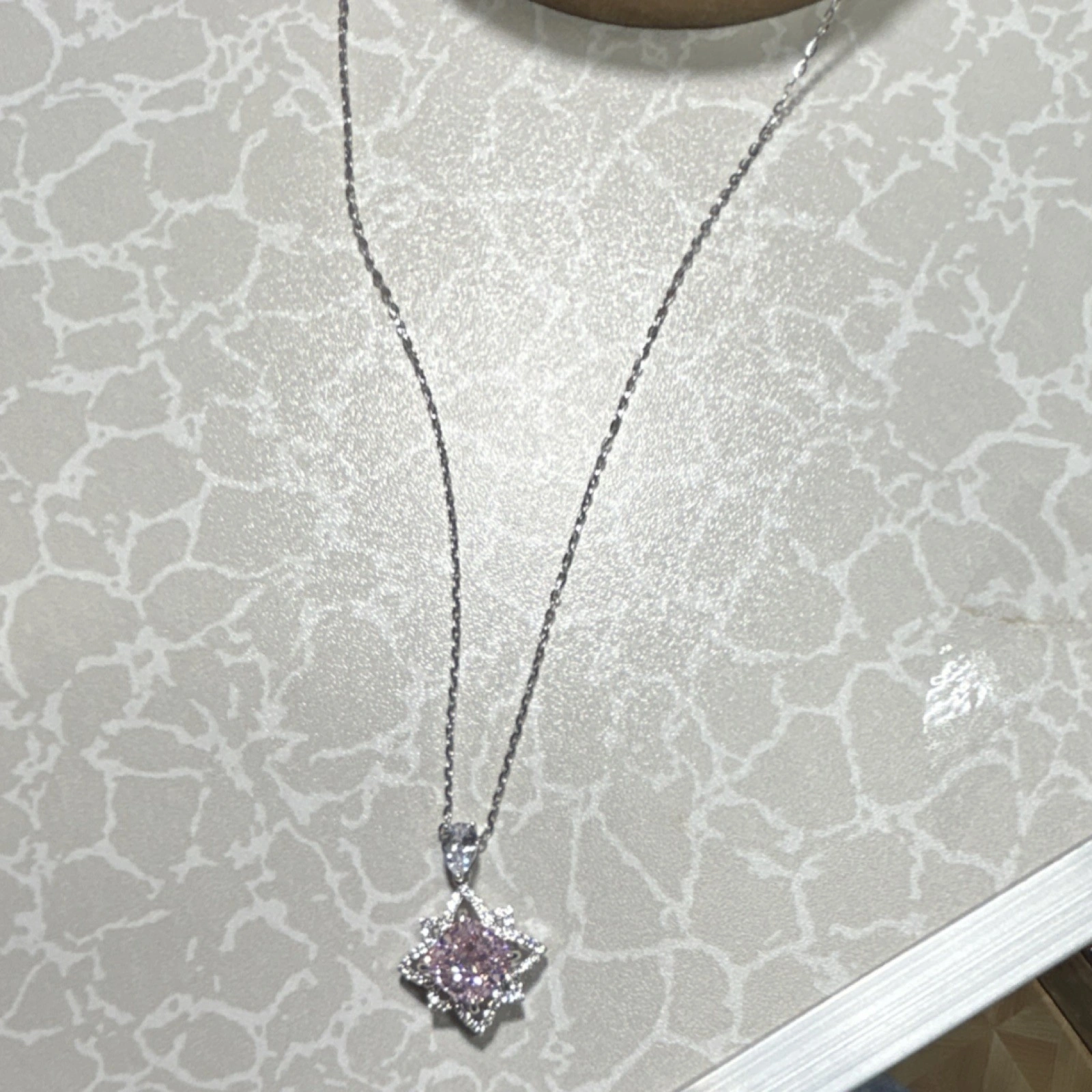 New with packaging. Star-shaped pendant necklace. Silver 925 metal. Pink and silver color. Features a diamond accent. Theme: Beauty. Style: Pendant, Chain.