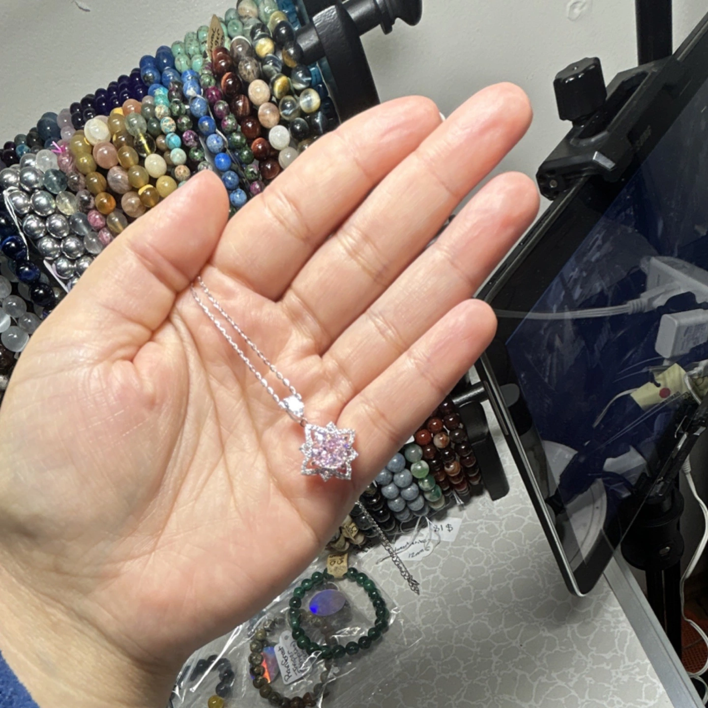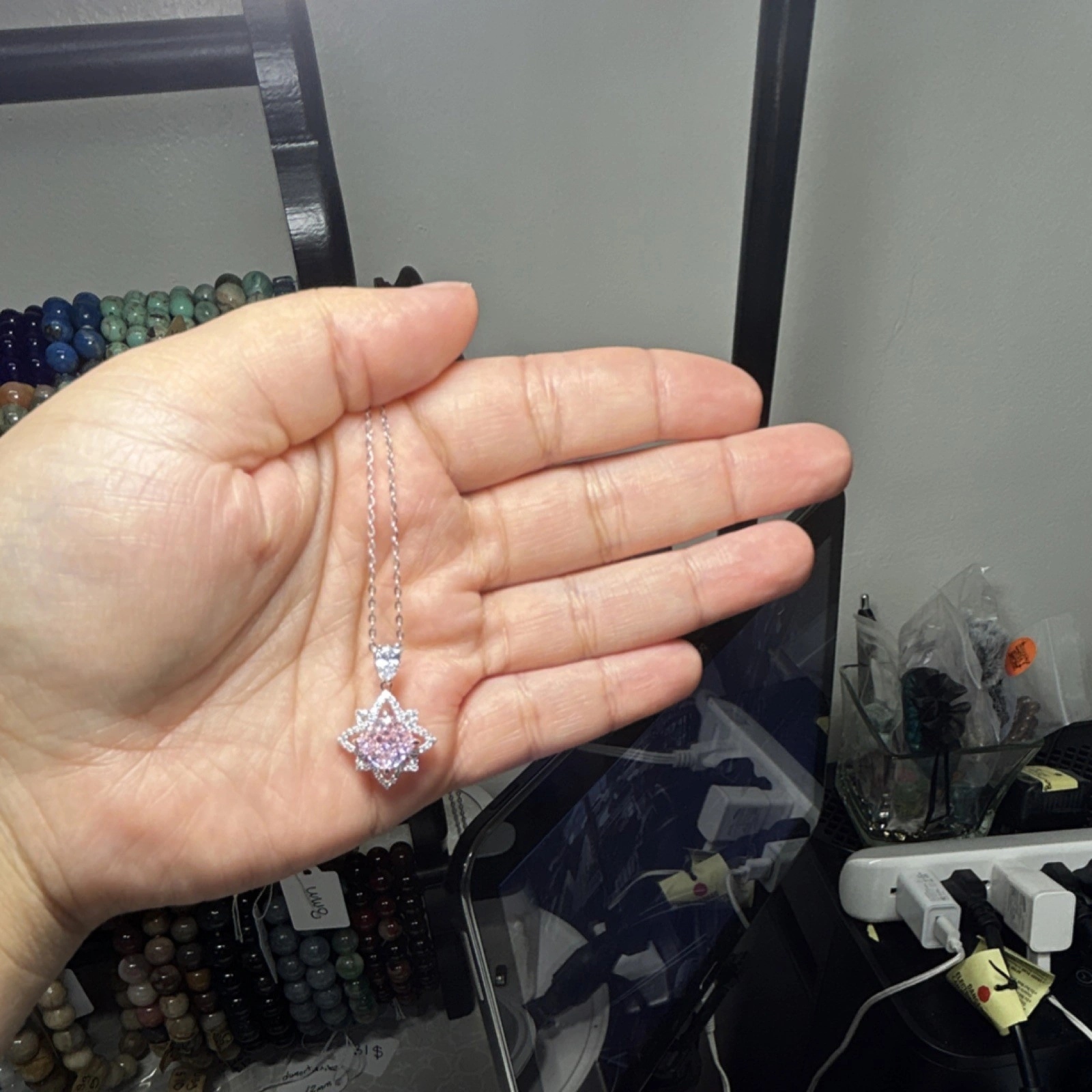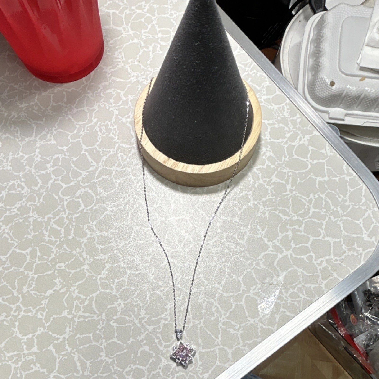 New with packaging. Star-shaped pendant necklace. Silver 925 metal. Pink and silver color. Features a diamond accent. Theme: Beauty. Style: Pendant, Chain.
