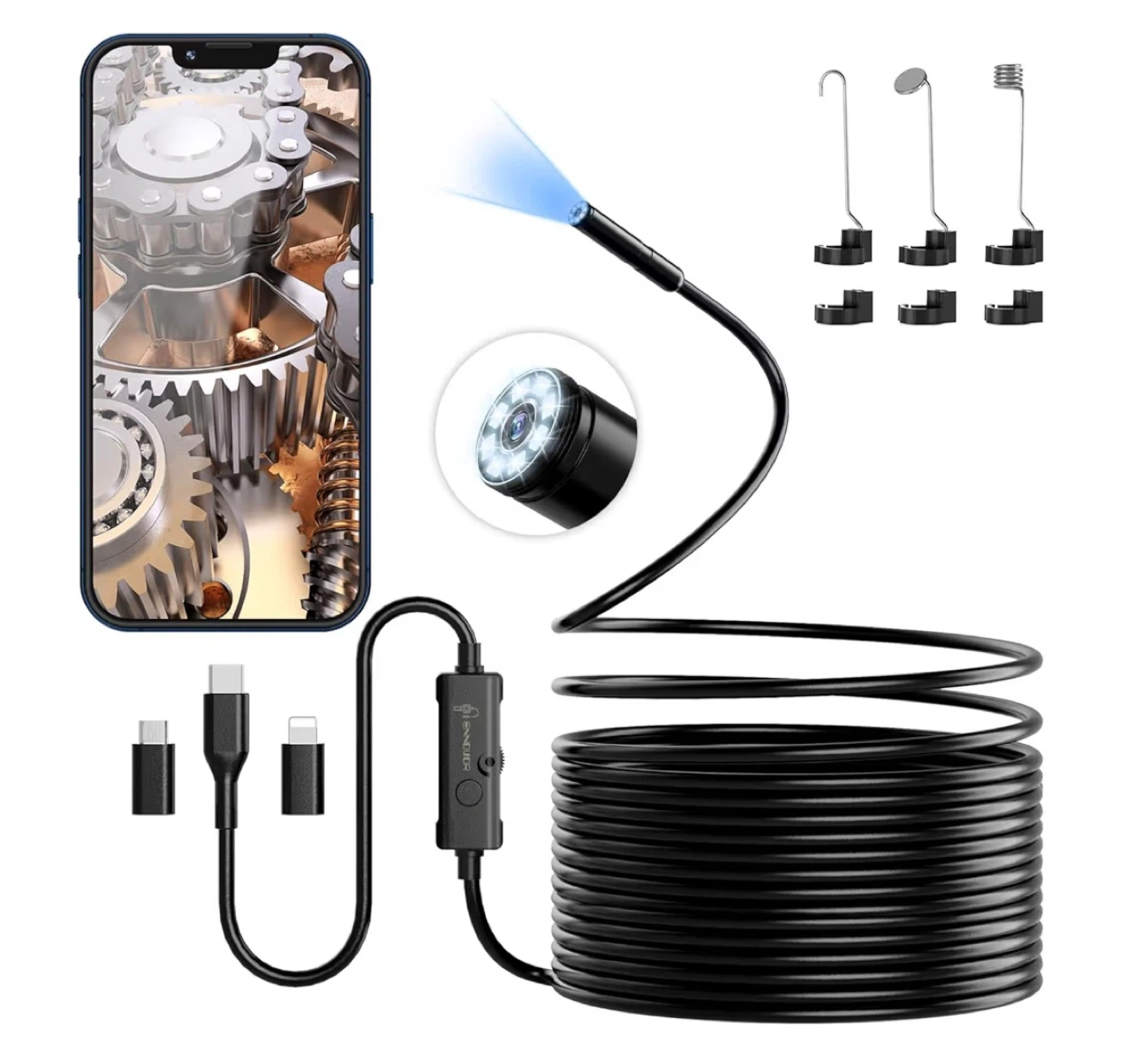 Endoscope Camera with Light, 1920P HD Borescope Camera with 8 Adjustable LED Lights, 16.4ft Semi-Rigid Snake Camera with Light, IP67 Waterproof 7.9mm Inspection Camera for iOS and Android