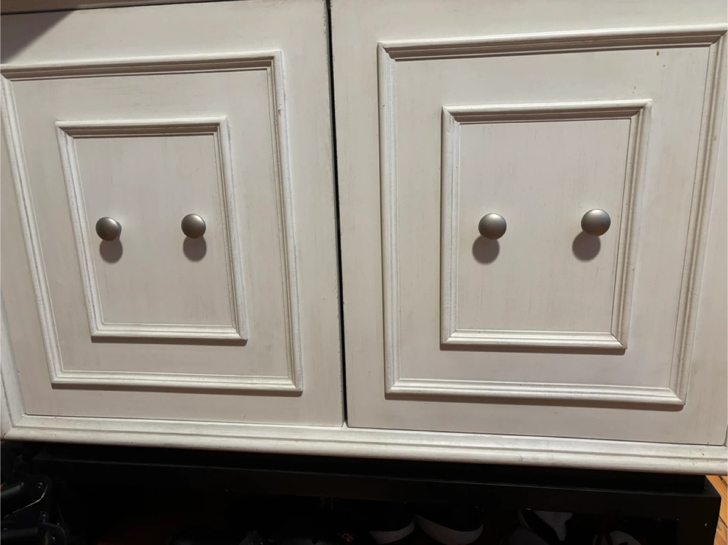 I'm selling a white painted wood cabinet. Dark walnut base. Grey knobs can be changed of your choice post purchase bc are removable! Extremely sturdy! Greta quality!