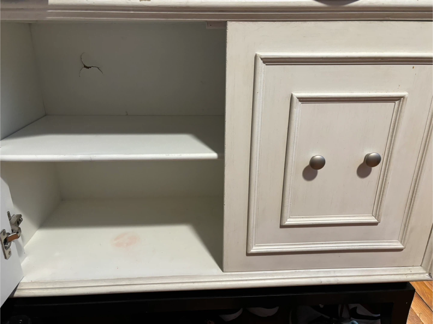 I'm selling a white painted wood cabinet. Dark walnut base. Grey knobs can be changed of your choice post purchase bc are removable! Extremely sturdy! Greta quality!