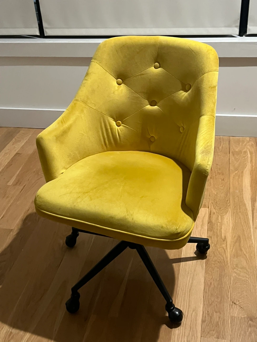 This is a cute and comfy yellow velvet office chair. It features a swivel base with wheels, making it easy to move around your workspace. The velvet material adds a touch of luxury and comfort. Perfect for a home office or study space!