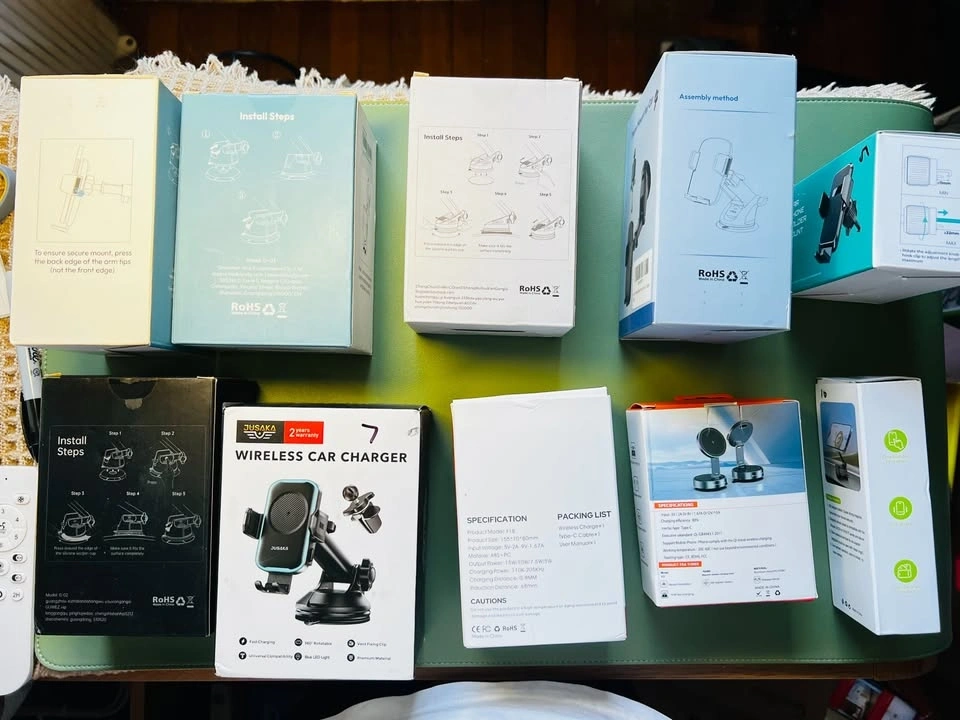 Great selection of car phone mounts and wireless chargers. Have different kinds of car phone mounts, like 3-in-1 universal ones and mounts for dashboard, windshield, or air vent. Also have wireless car chargers and magnetic wireless charging stands. Some have fast charging and 360-degree rotation. All new in box.