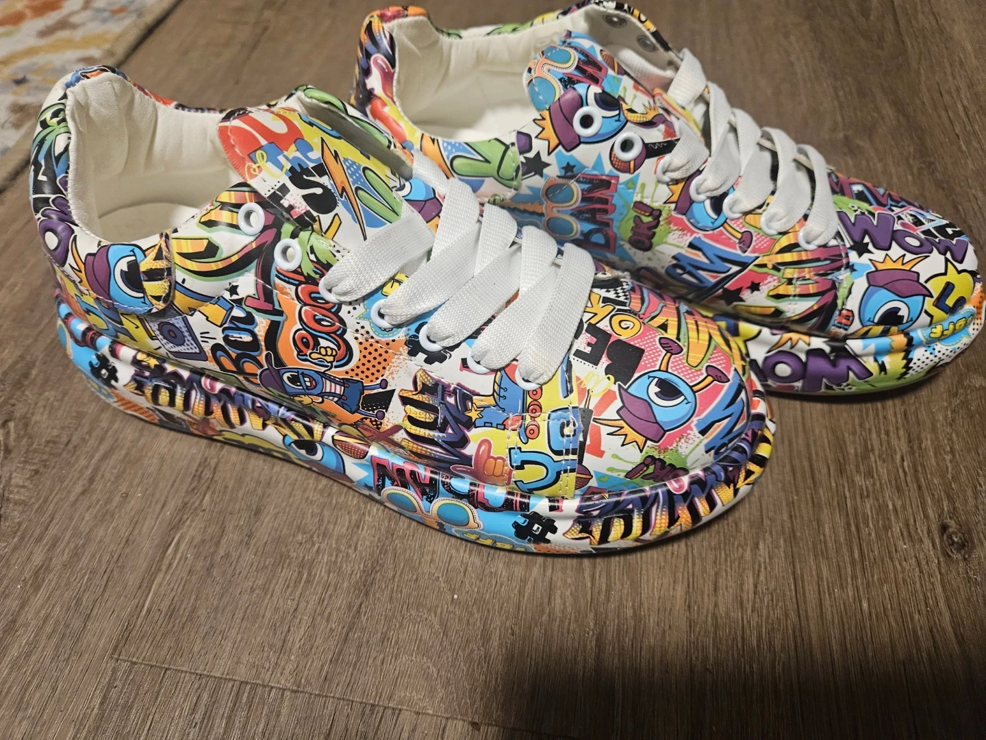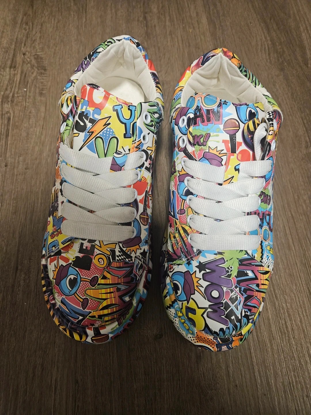 These fun sneakers feature a vibrant graffiti-style print all over. They have white laces and a comfortable design. Perfect for adding a pop of color to any casual outfit!