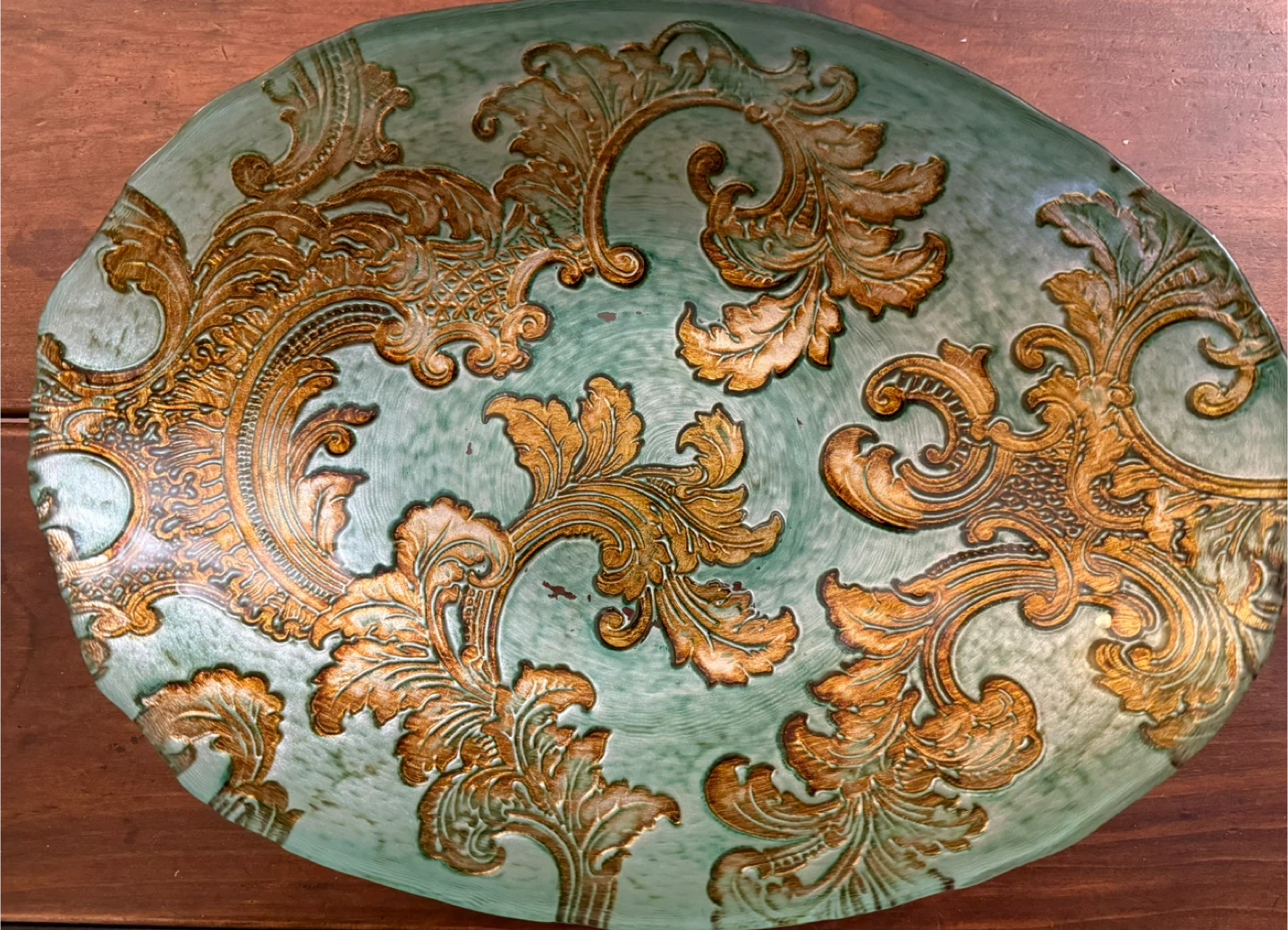 Selling this as I need the cash! This beautiful gold bowl with turquoise backsplash and leaf pattern!