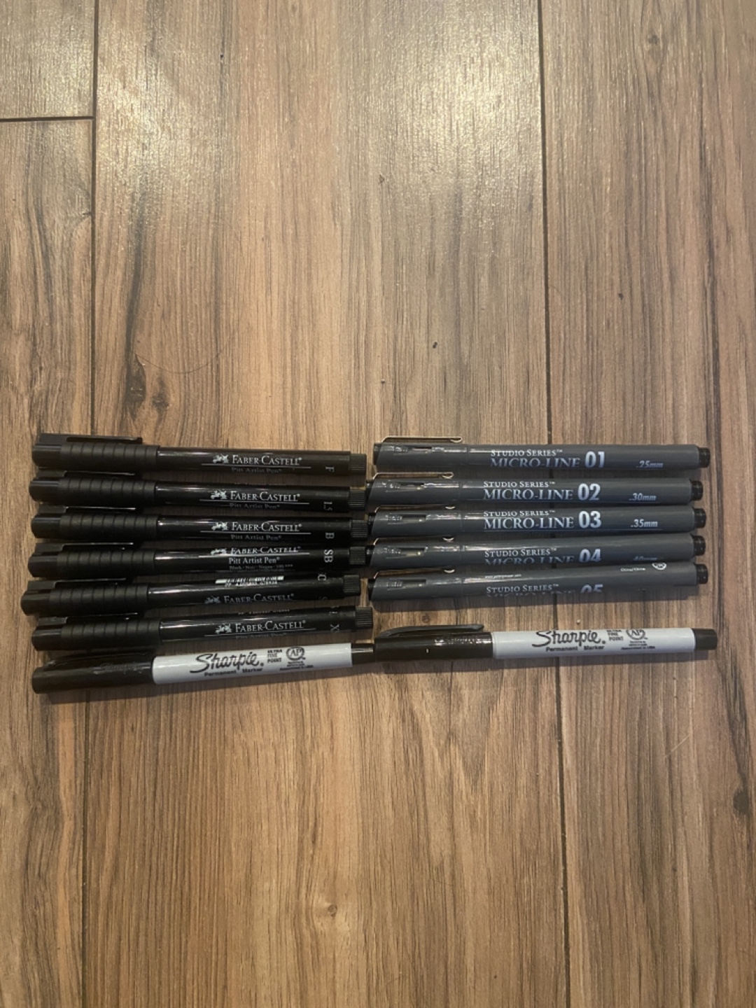Selling a collection of Faber-Castell Pitt Artist Pens and Studio Series Micro-Line pens. Perfect for artists and hobbyists! Includes various sizes and tips for different drawing and writing needs. Also includes Sharpie permanent markers.
