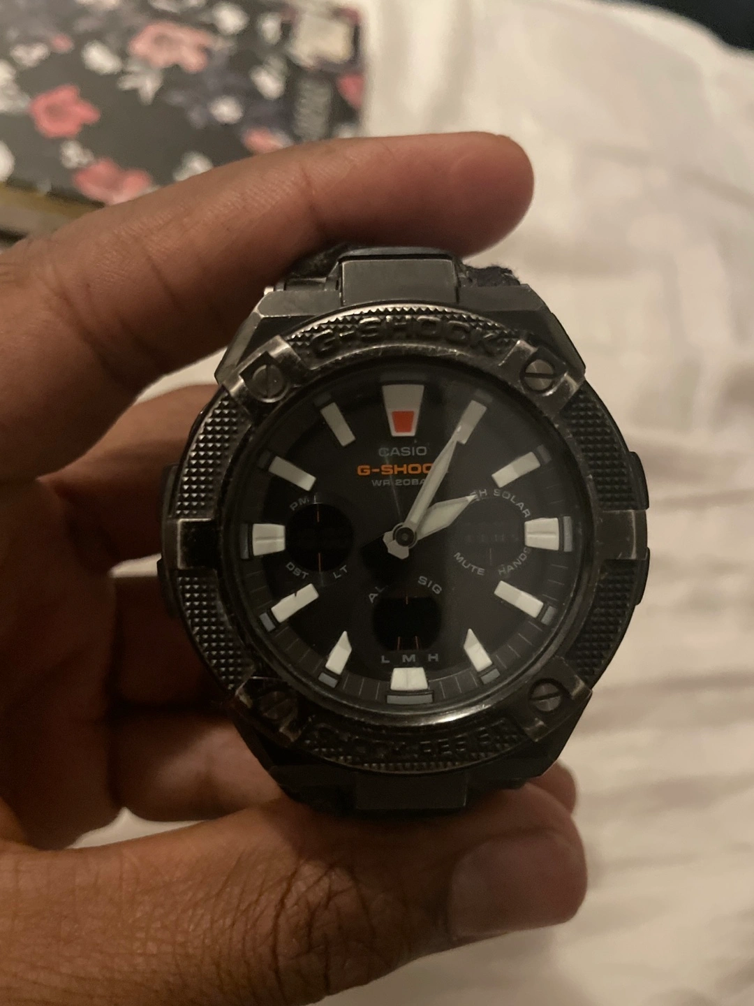 Selling a Casio G-Shock watch! It features WR 20BAR water resistance and is solar powered. The watch has DST, LT, SIG, LMH, and MUTE HANDS functions