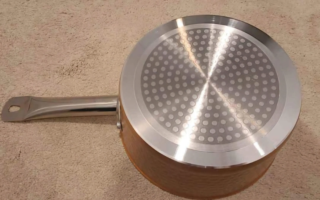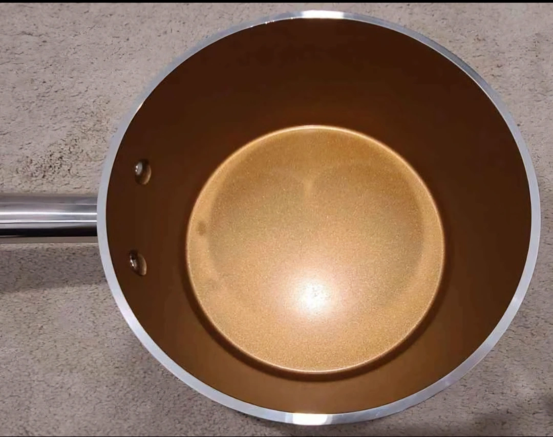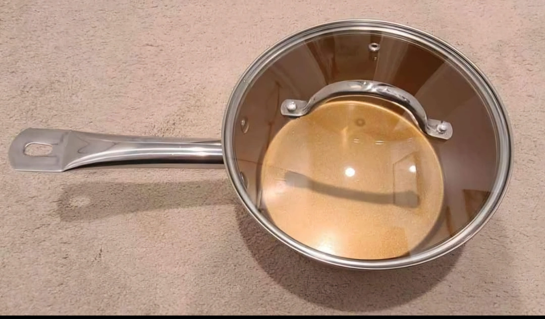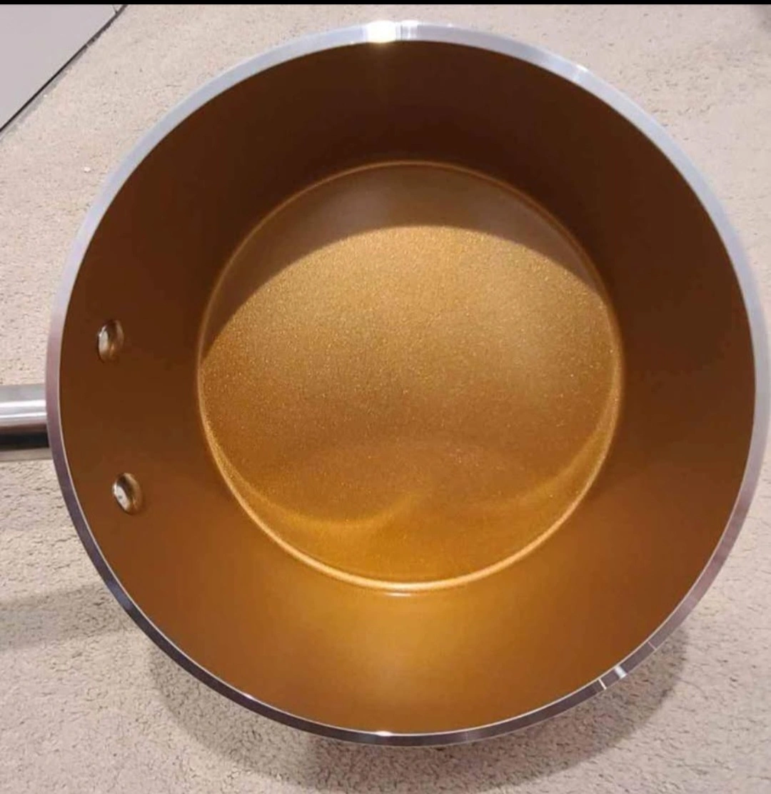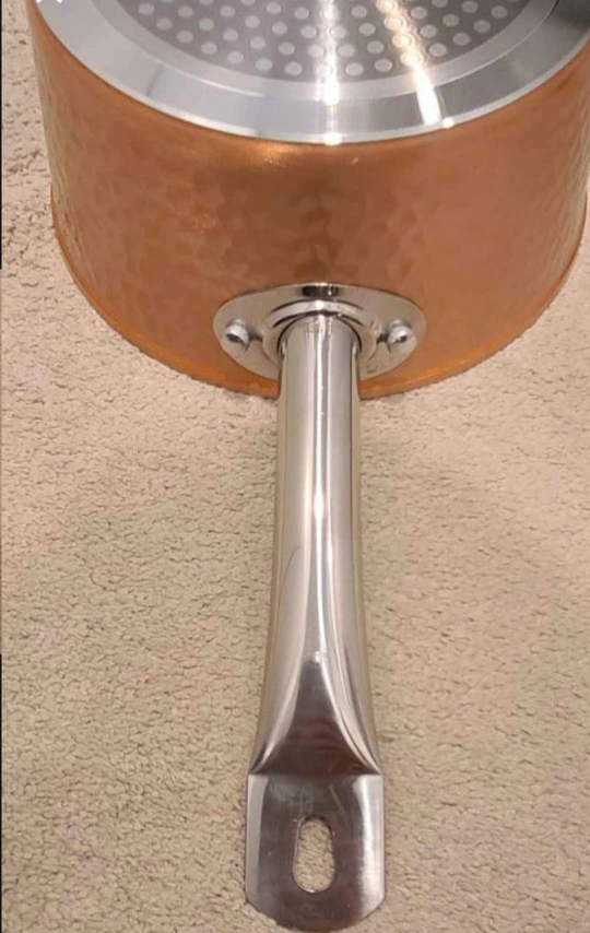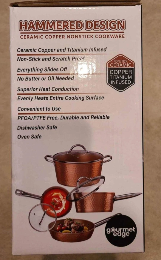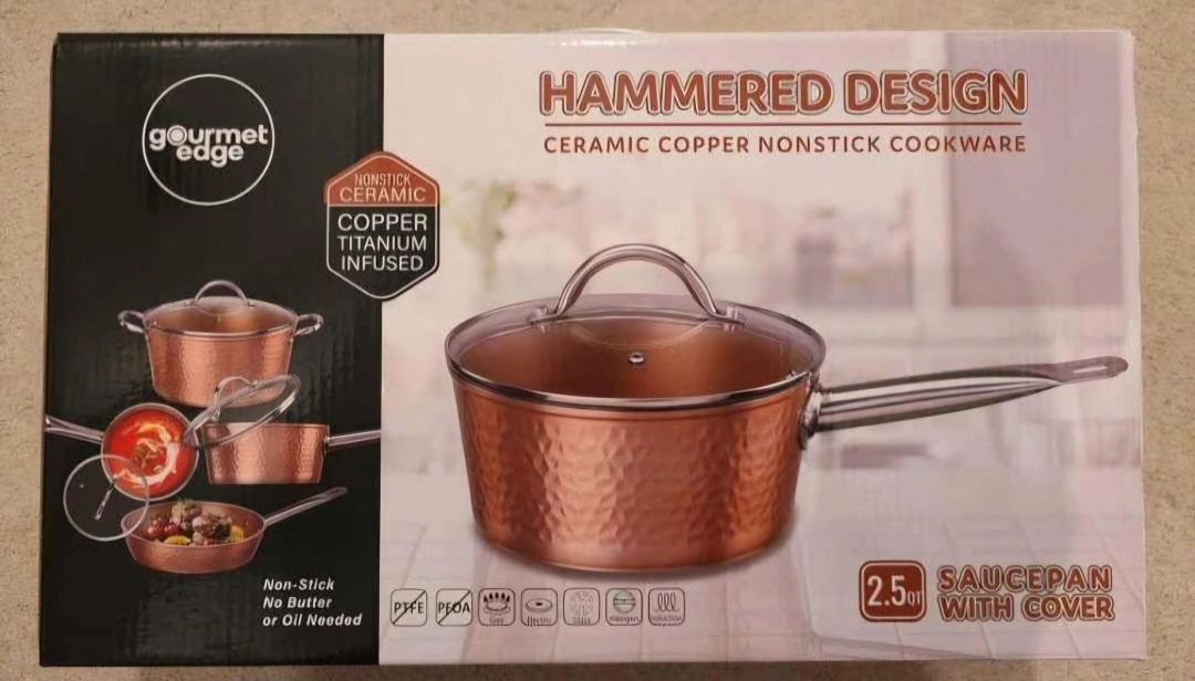2.5 quart copper saucepan. Ceramic copper nonstick cookware. Hammered design. Oven safe up to 550°F. PFOA/PTFE free. Non-stick. Includes lid. Stainless steel bottom. Induction capable.