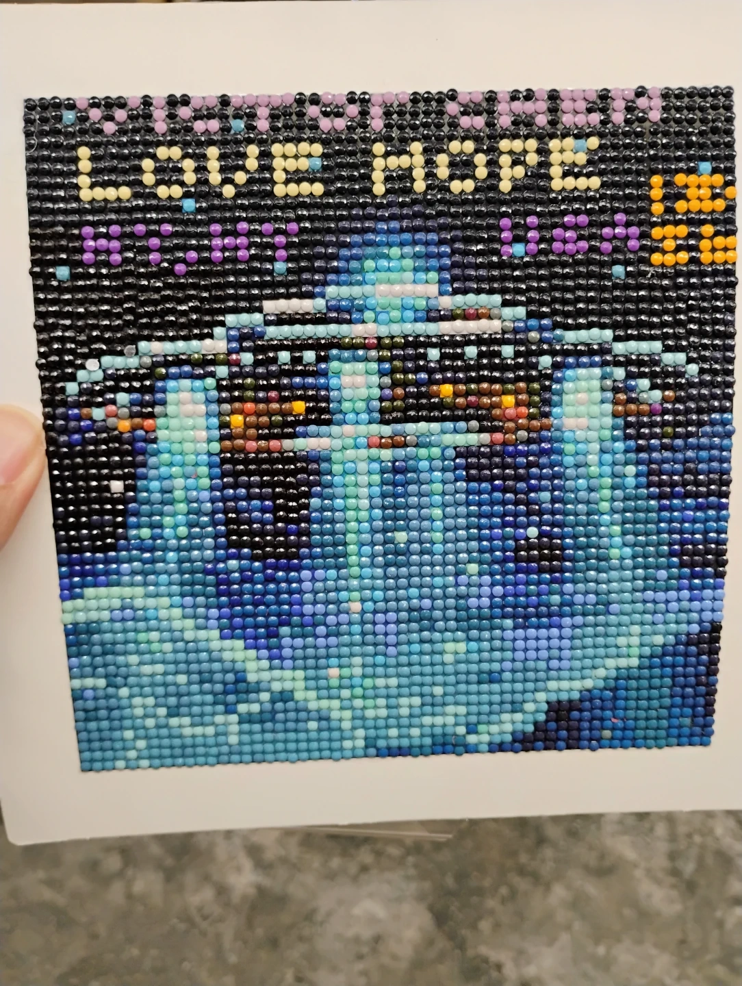 This diamond painting kit features a colorful depiction of a lit-up building at night with the words 'LOVE HOPE' at the top. It's a fun craft project for anyone who enjoys detail work. The canvas shows a vibrant scene with blues, purples, and yellow accents. Completed painting measures approximately 8x8 inches.