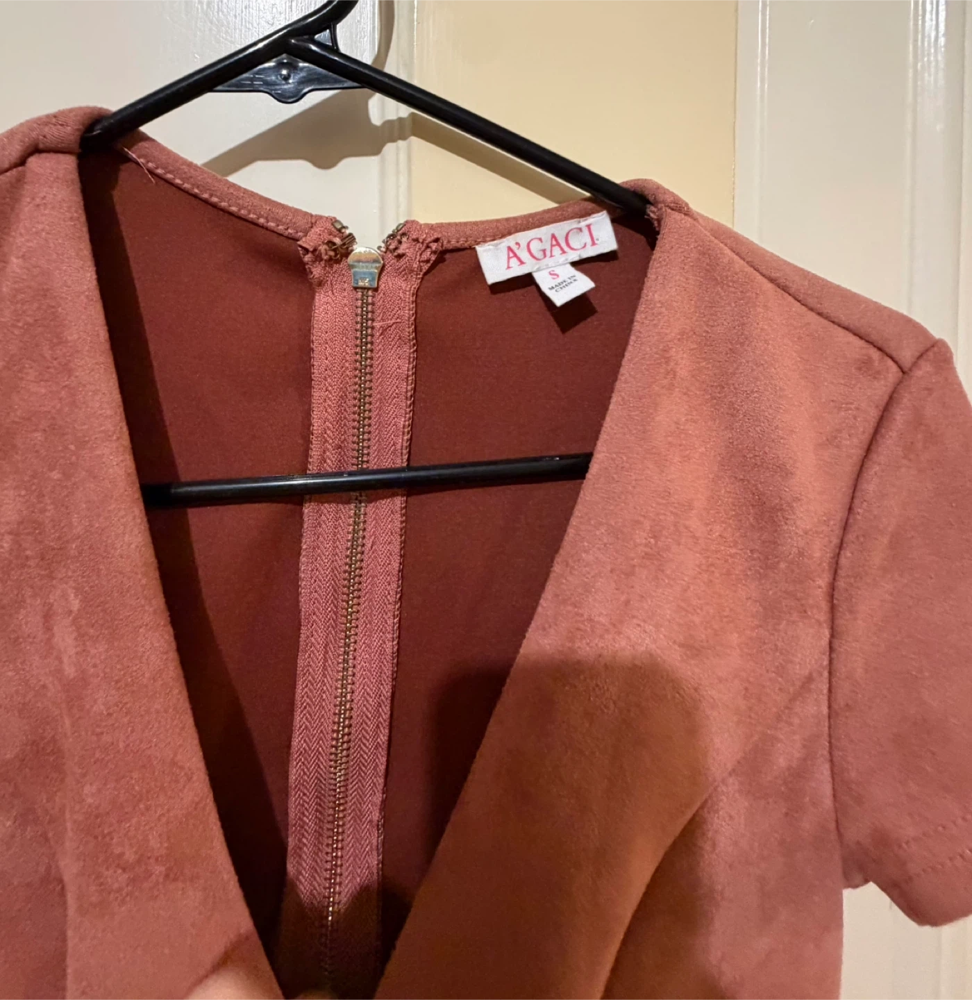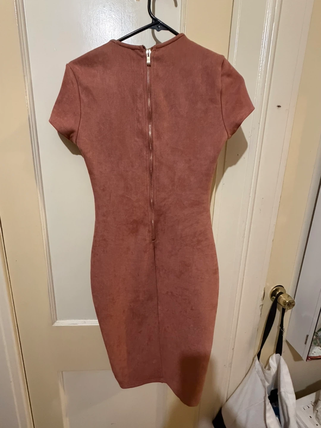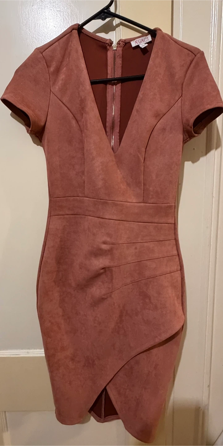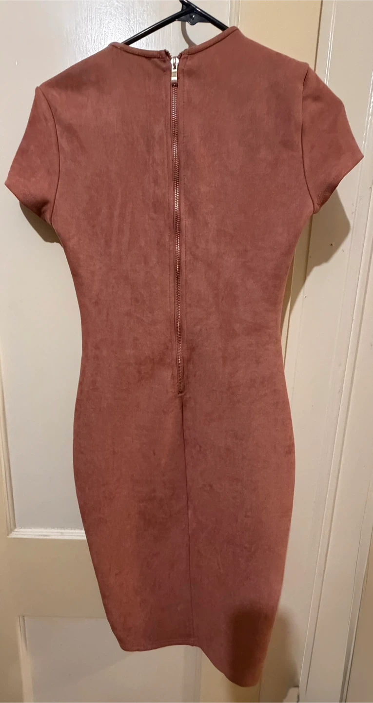 Dusty rose colored suede-like dress from A'GACI. It features short sleeves and a zipper closure in the back. This dress has a mock neck and a bodycon fit with ruched detailing on the front. pit to pit 15 in waist 14 in . Run small. The model has a similar dress to show fit .