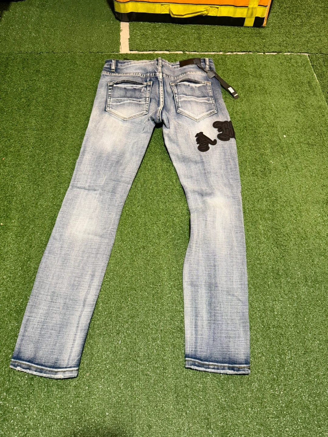Light wash distressed denim jeans with Amiri branding. Features a slim fit and unique patch details. Cotton blend material.