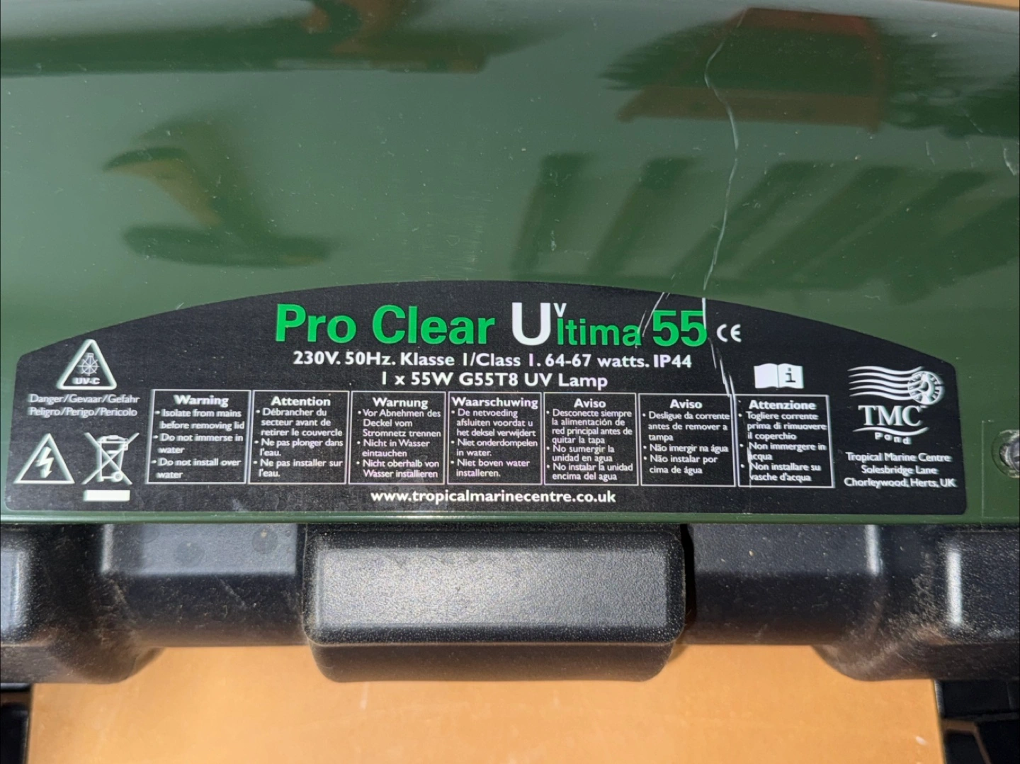 Selling a TMC Pro Clear Ultima 55 UV Lamp. It's a 230V, 50Hz, Klasse I/Class 1, 64-67 watts, IP44 and 1 x 55W G55T8 UV Lamp.