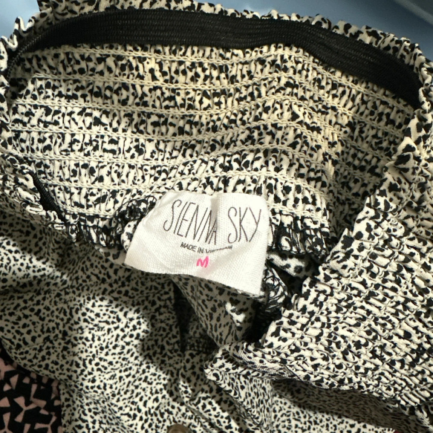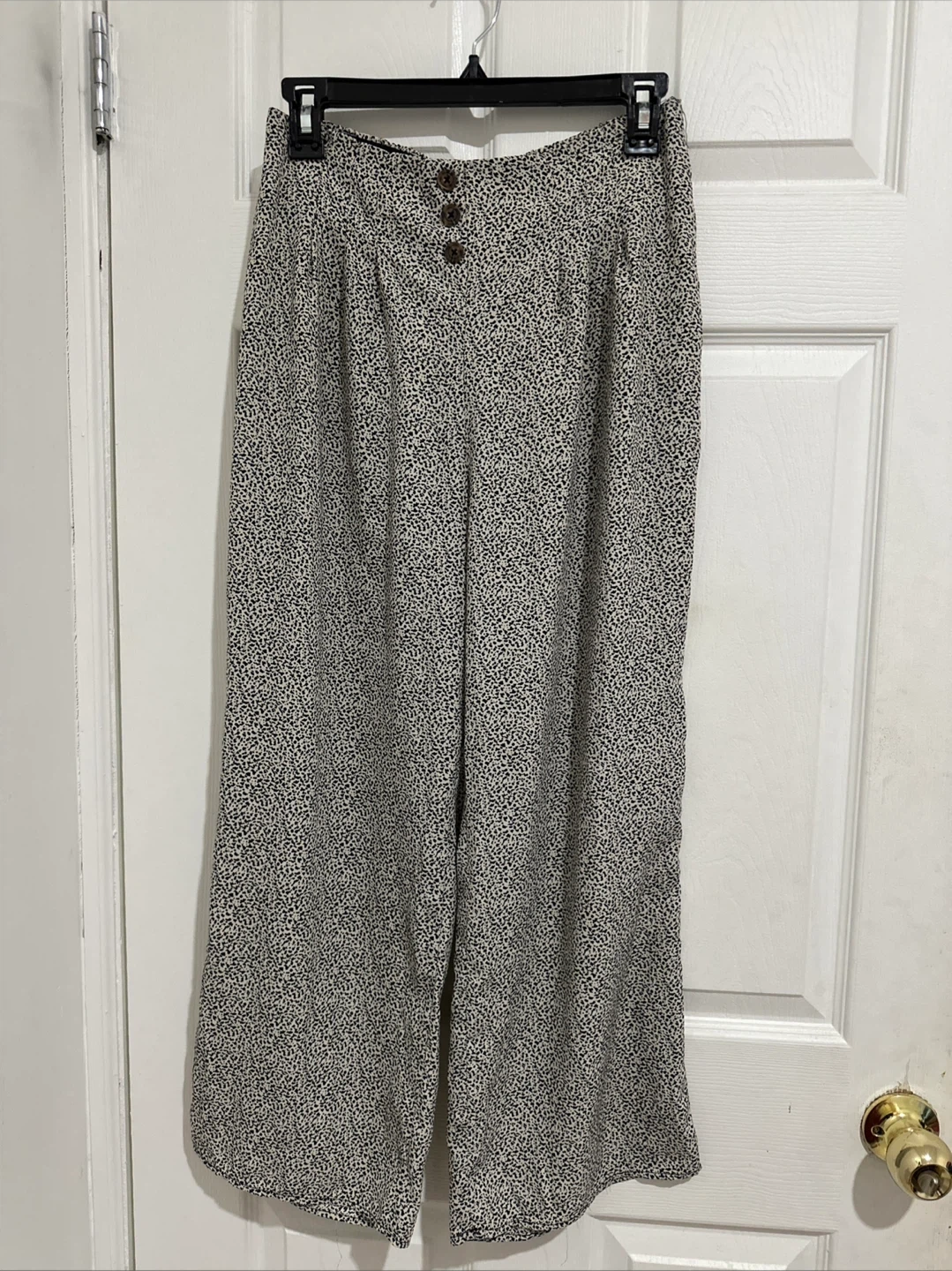 These Sienna Sky wide leg cropped pants feature a black and white speckled print. They're a size medium with a button and zipper closure. Made in Vietnam.