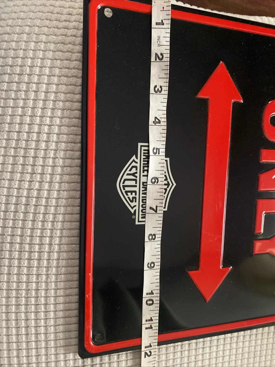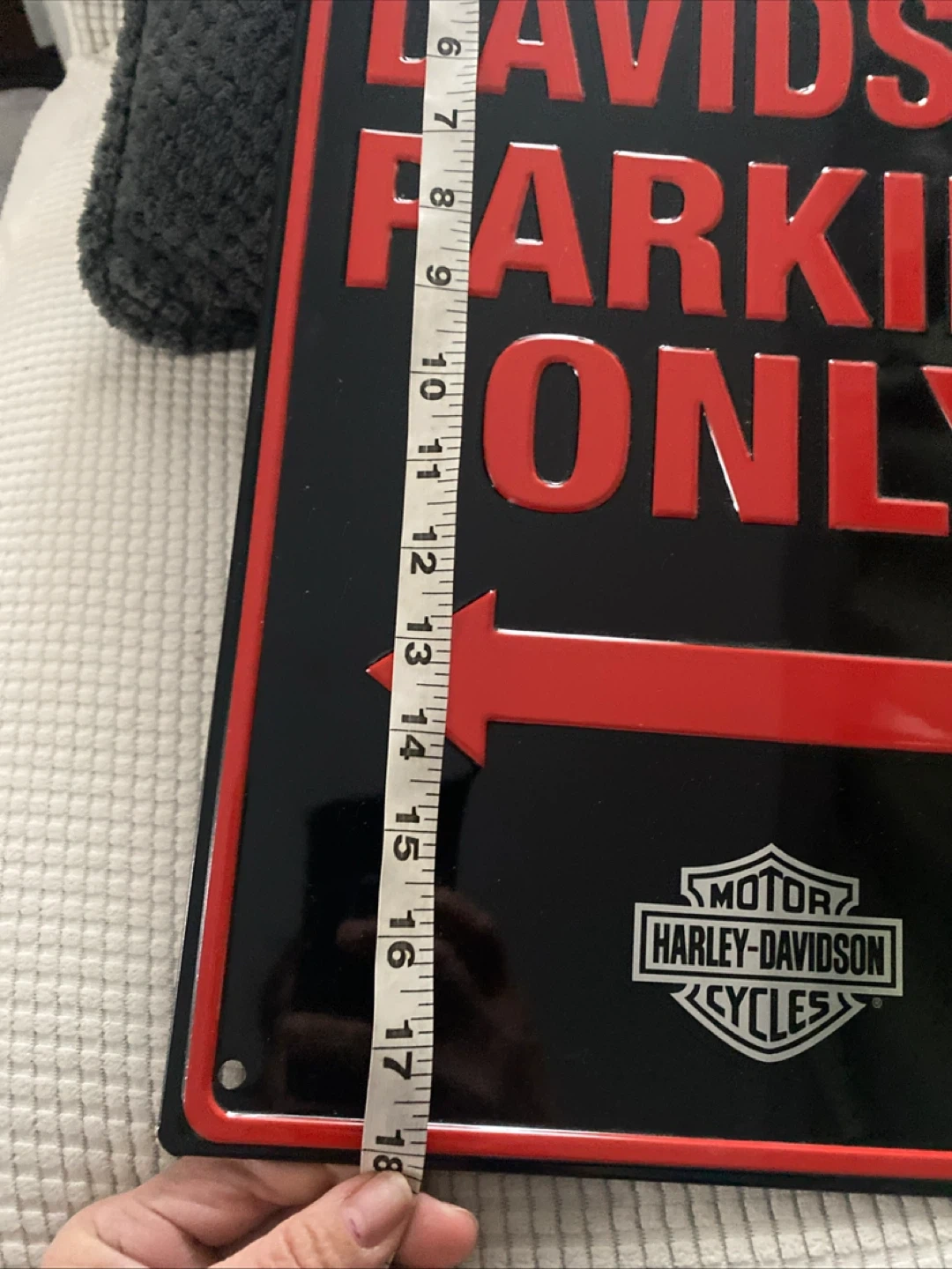 Selling a Harley-Davidson parking only sign! It's black with red lettering and the Harley-Davidson logo. The sign measures approximately 12 inches wide and 18 inches tall.