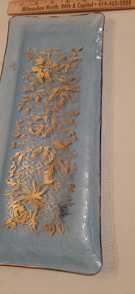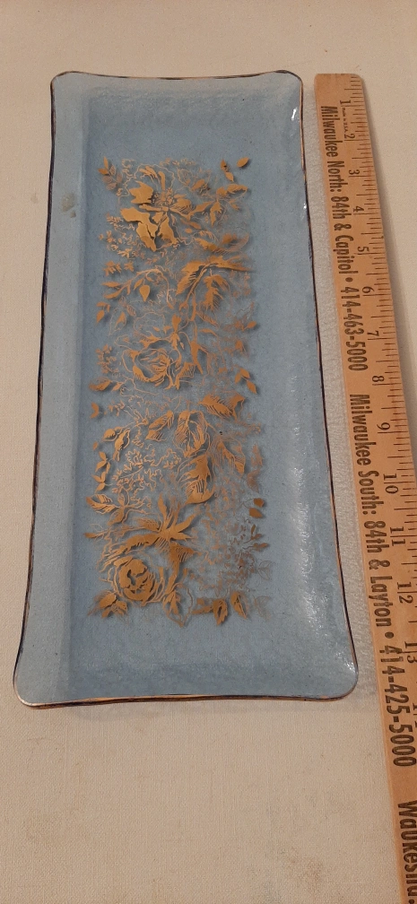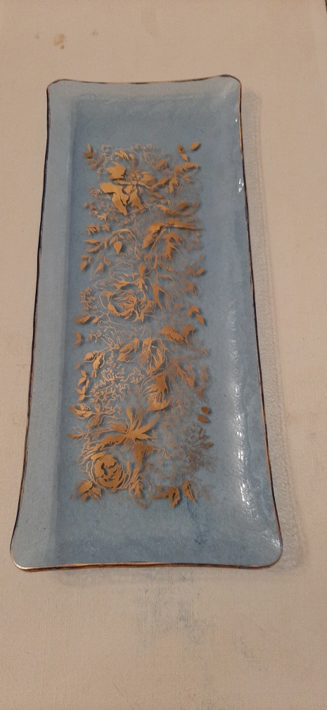 Selling a decorative blue glass tray with a gold floral design. It's in good condition and would look great as a centerpiece or accent piece in your home. The tray is rectangular in shape