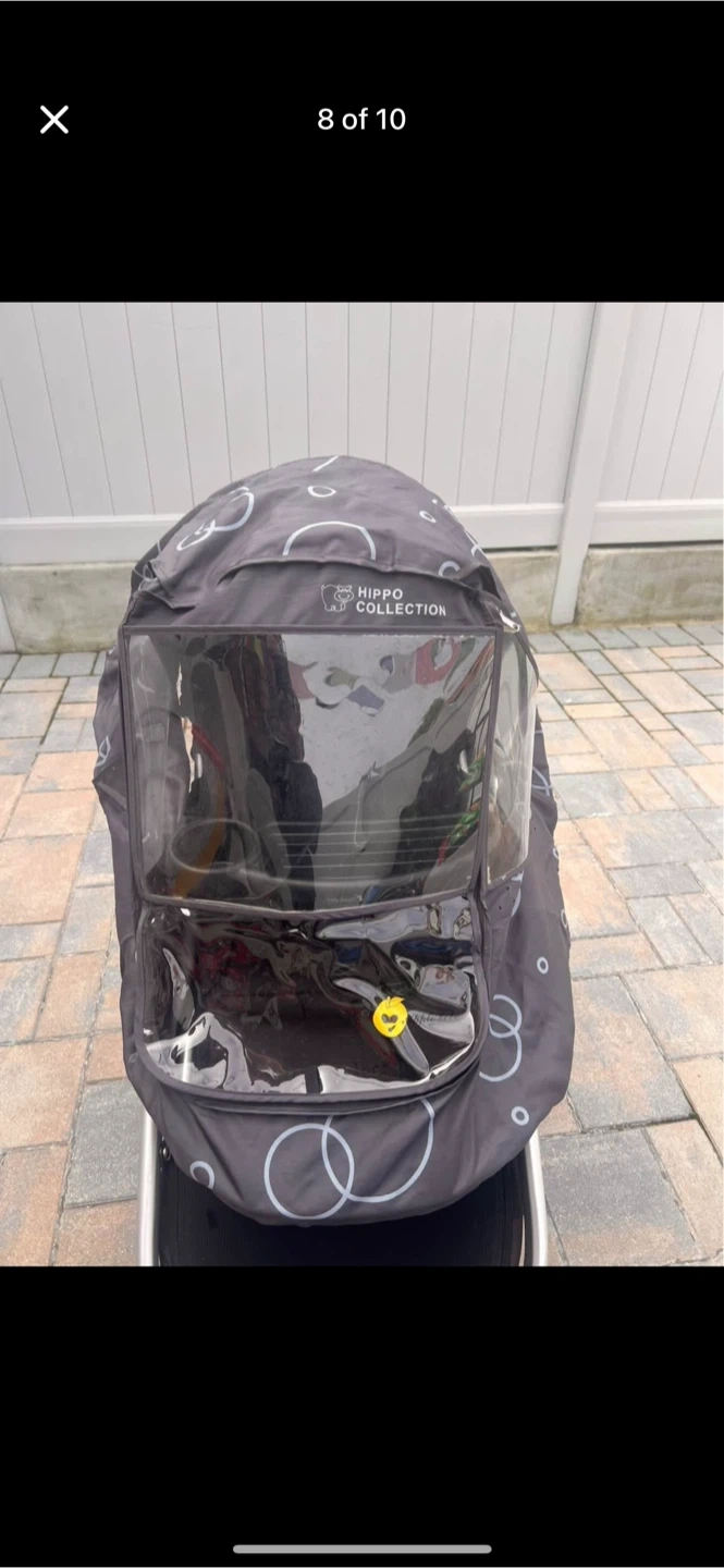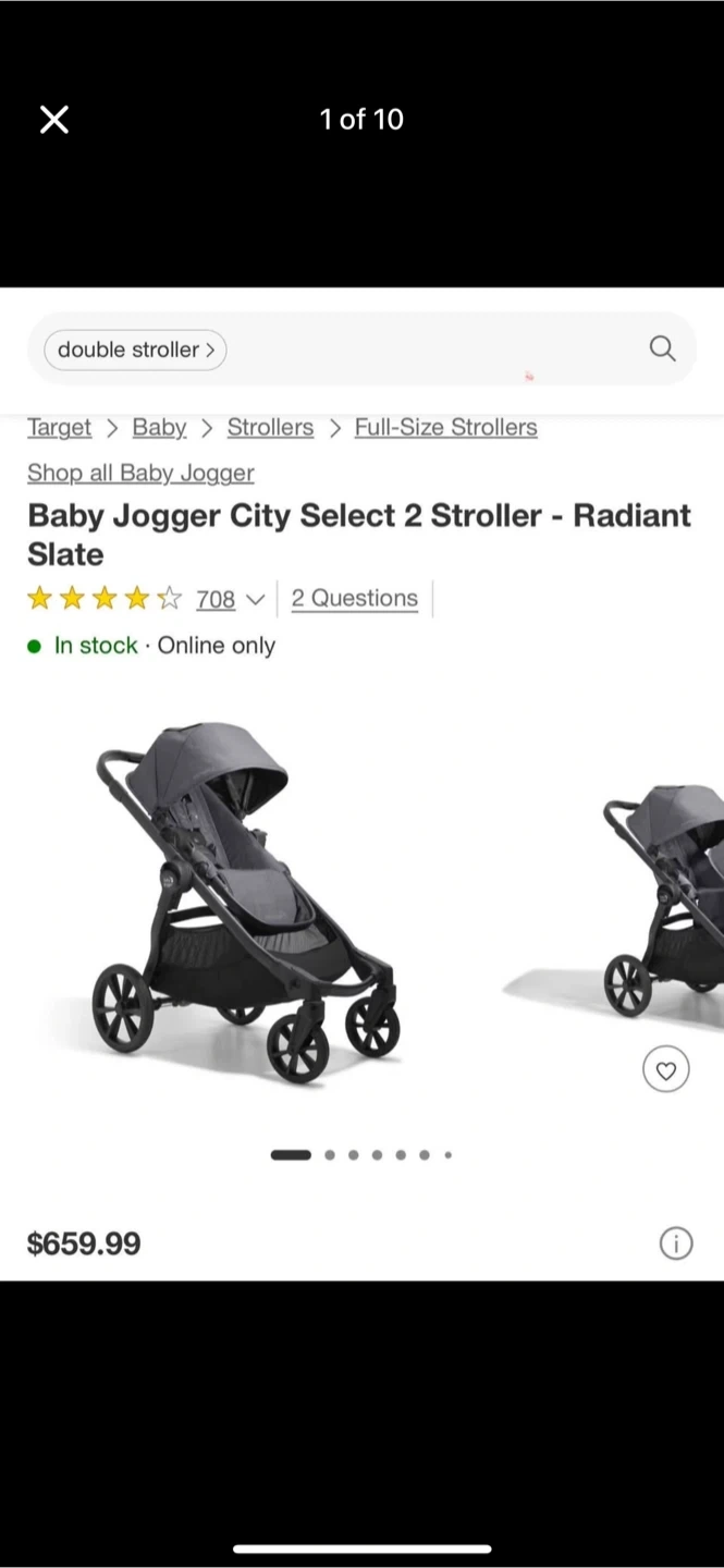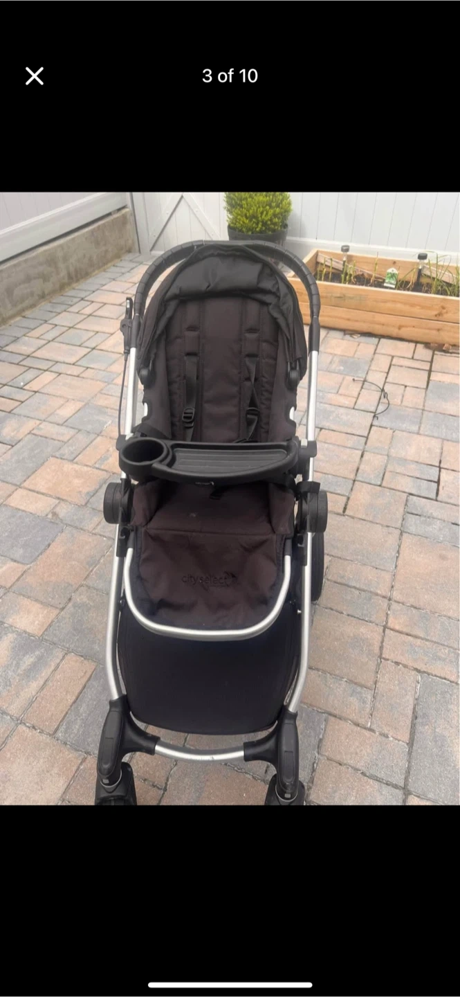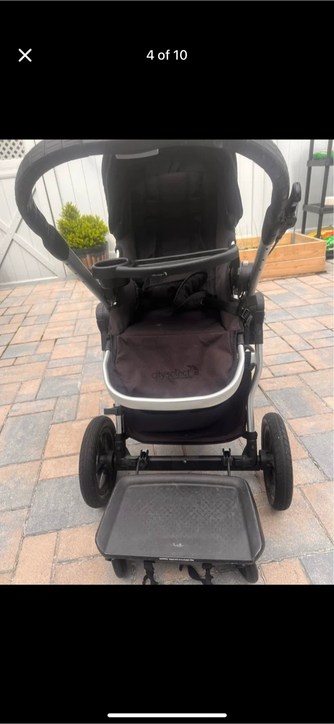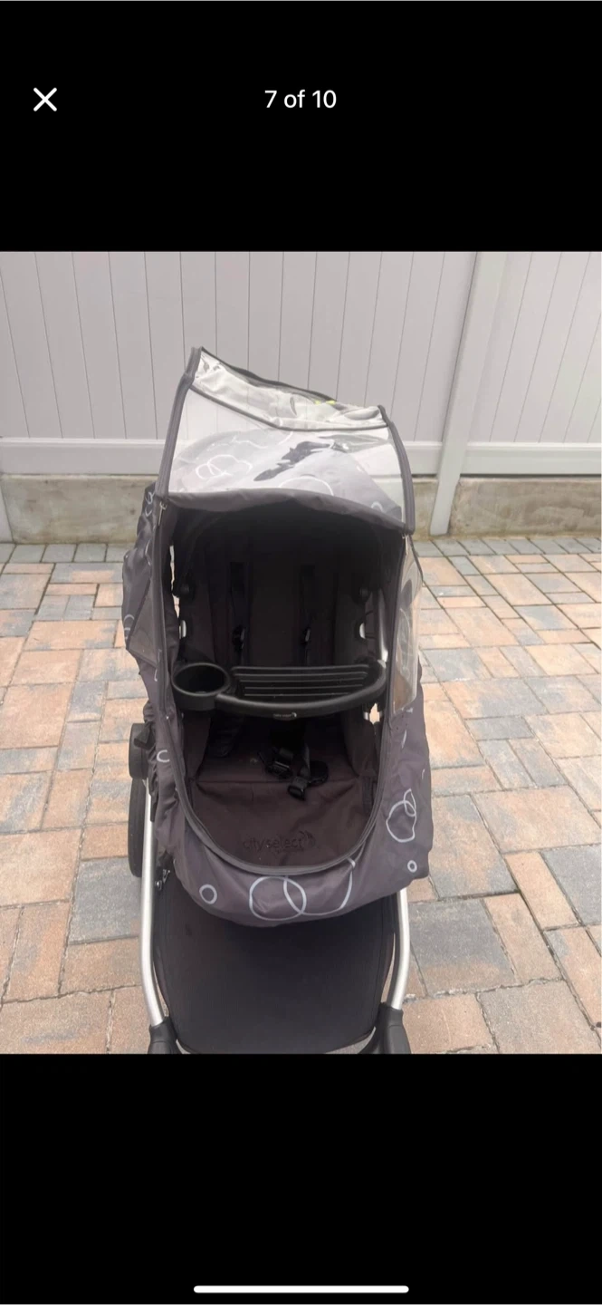 This is the Baby Jogger City Select 2 stroller in Radiant Slate. It includes a built-in cup holder and a parent console. A stroller board is attached, and a rain cover is also included. It's a versatile stroller for multiple children.