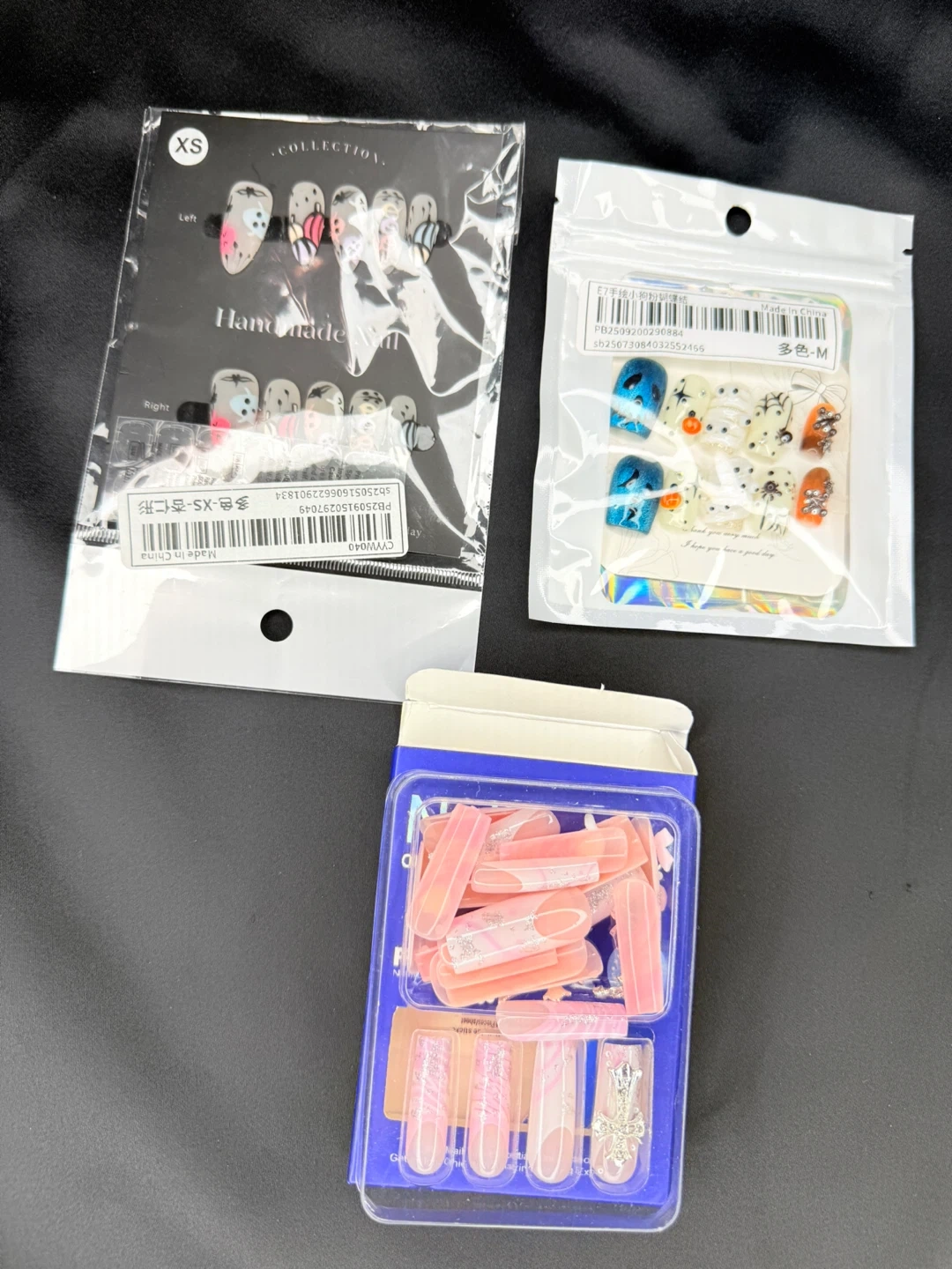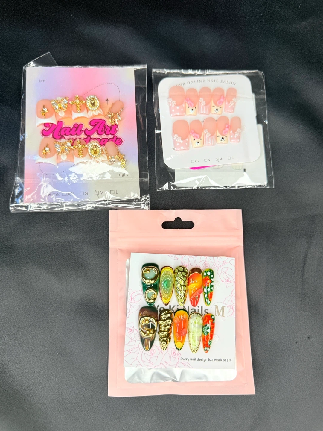 Includes two sets of full-cover press-on nails with intricate designs and one set of nail art charms. Various styles and decorations are included for a unique look. Get a salon-quality manicure at home!