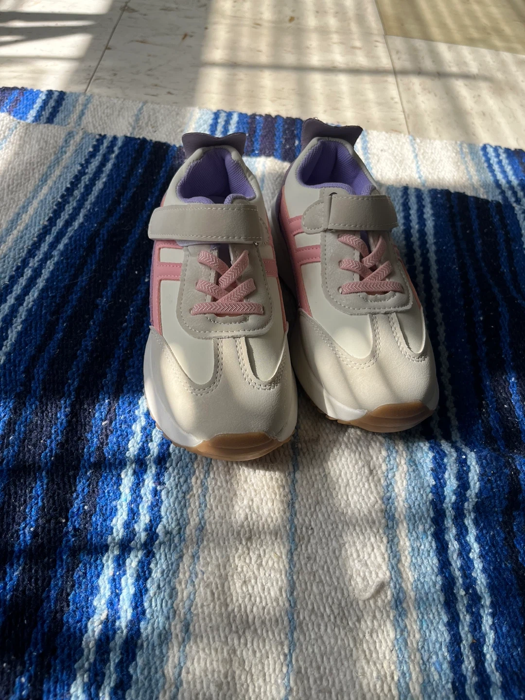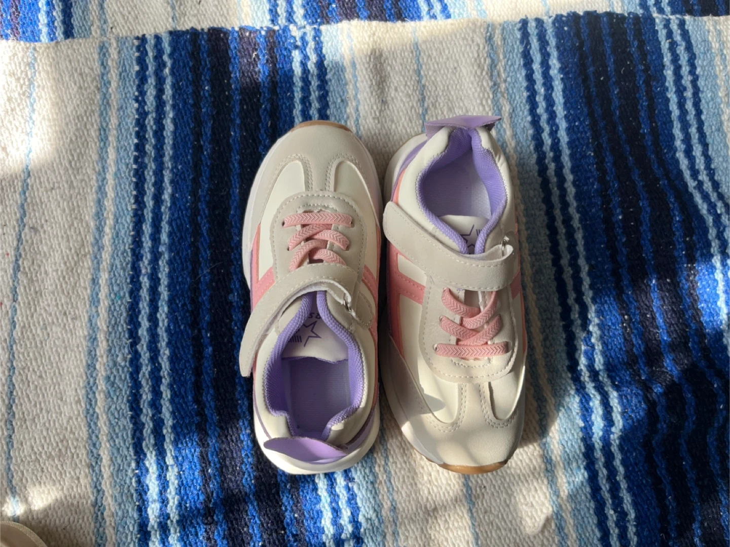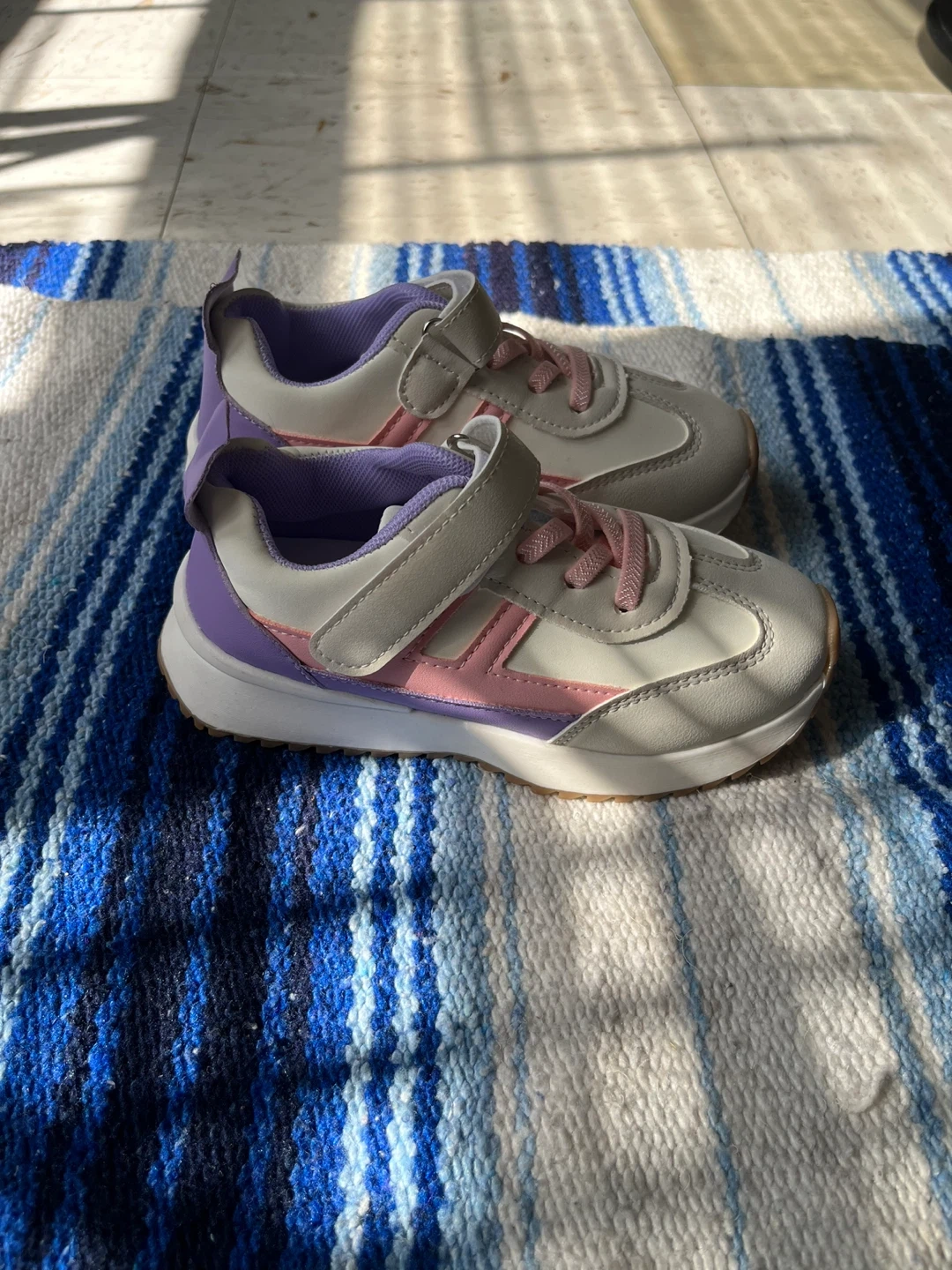 These toddler girl's sneakers are in great condition and ready for a new home! They feature a cute white and purple color scheme with pink laces and a velcro strap for easy on and off. Perfect for your little one's adventures! Size 12