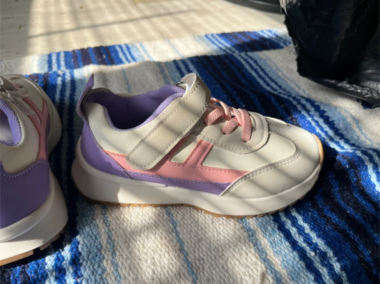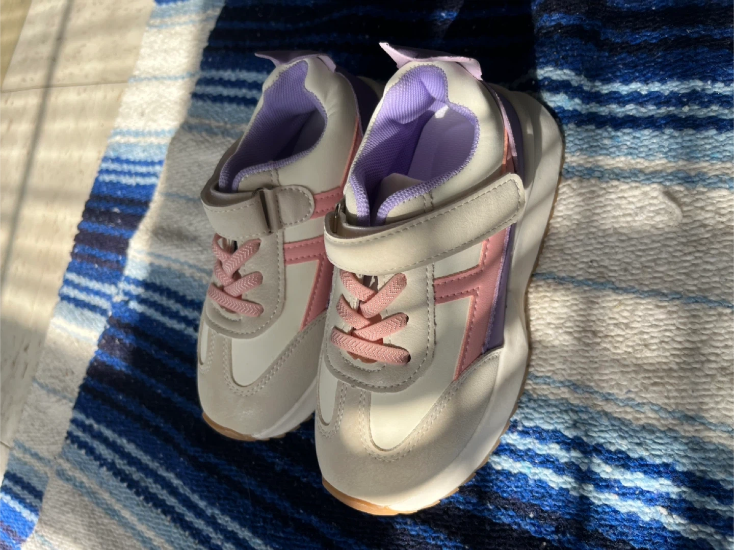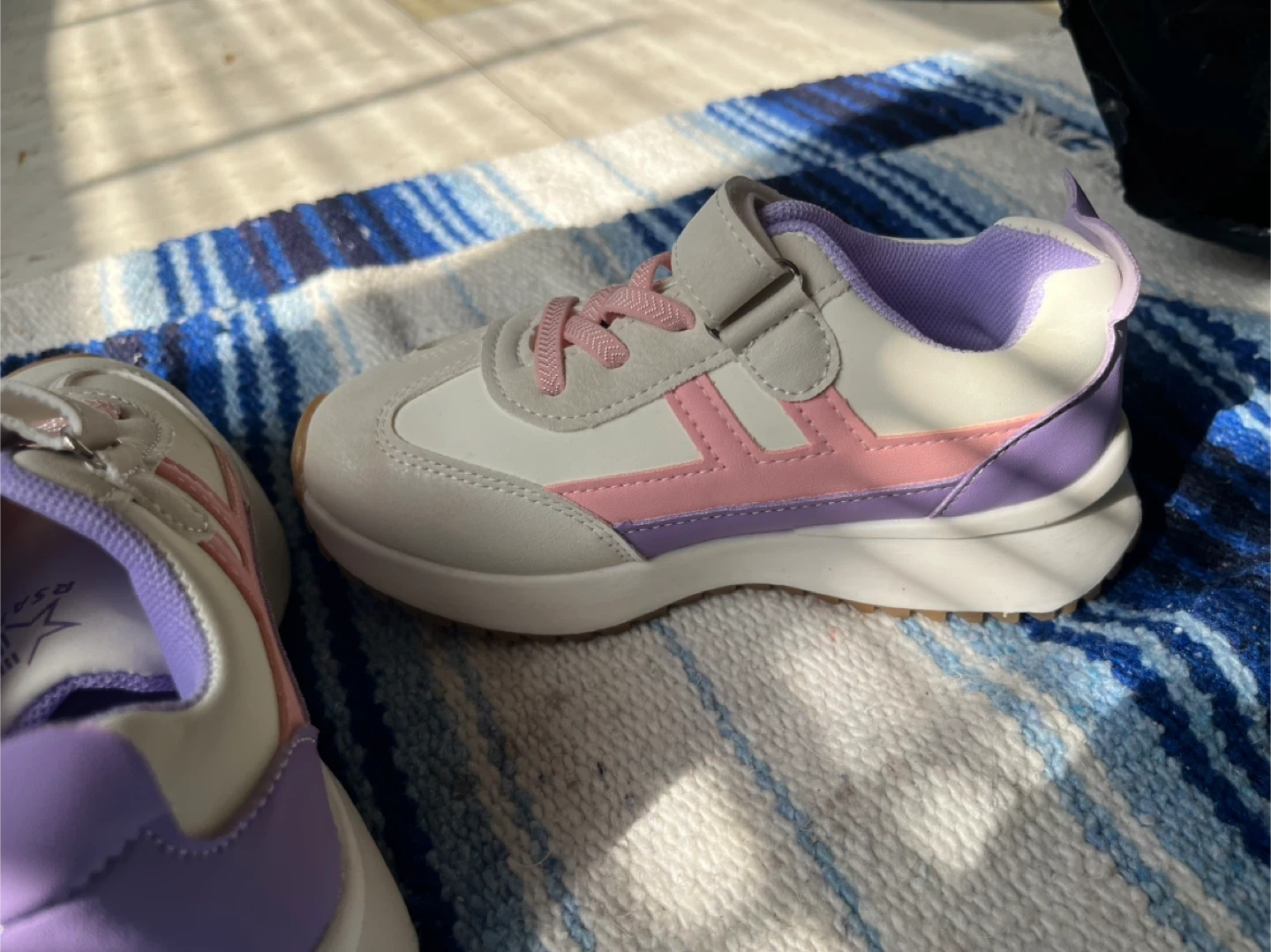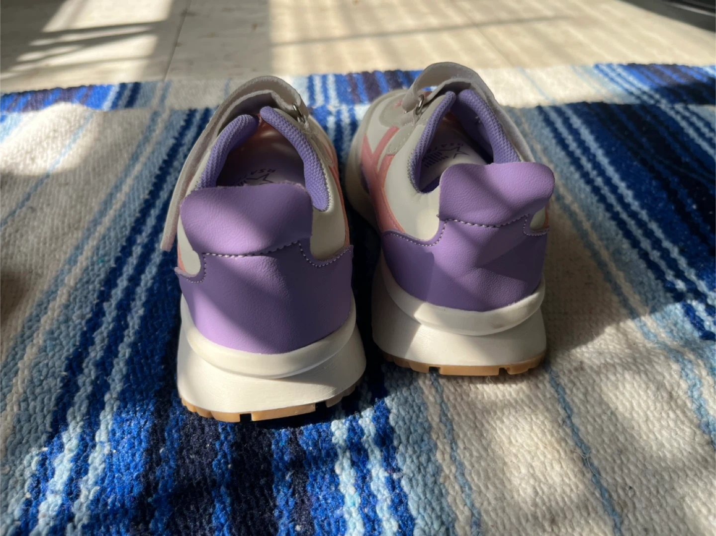 These toddler girl's sneakers are in great condition and ready for a new home! They feature a cute white and purple color scheme with pink laces and a velcro strap for easy on and off. Perfect for your little one's adventures! Size 12