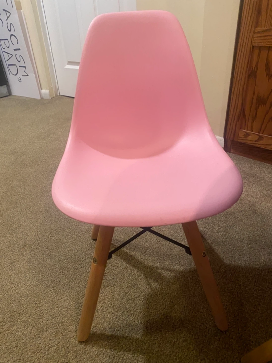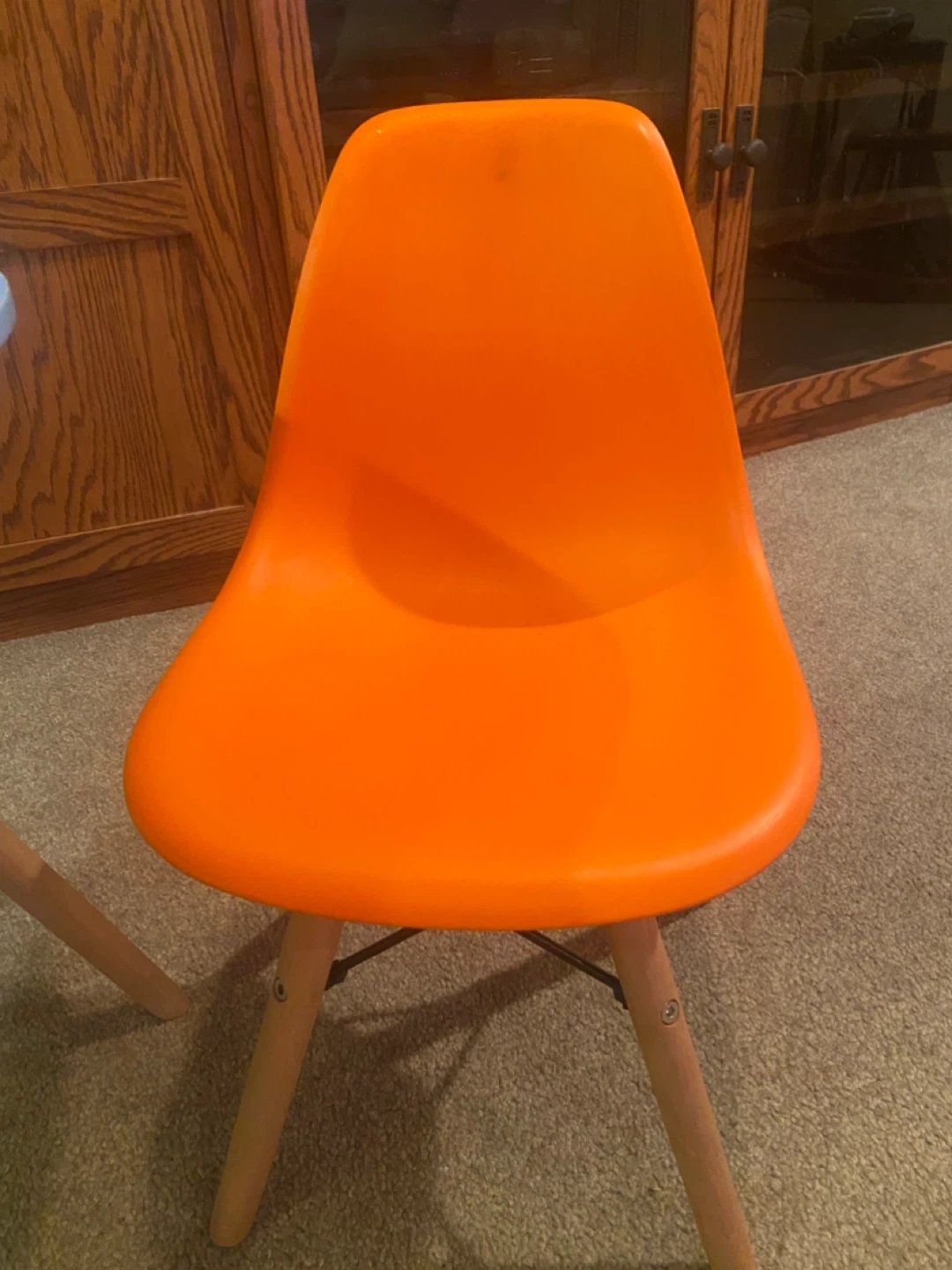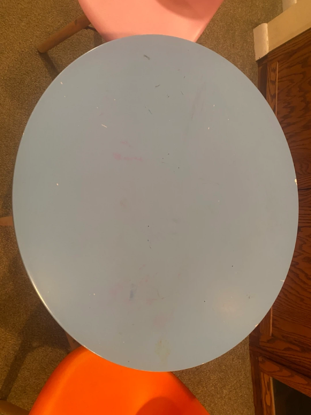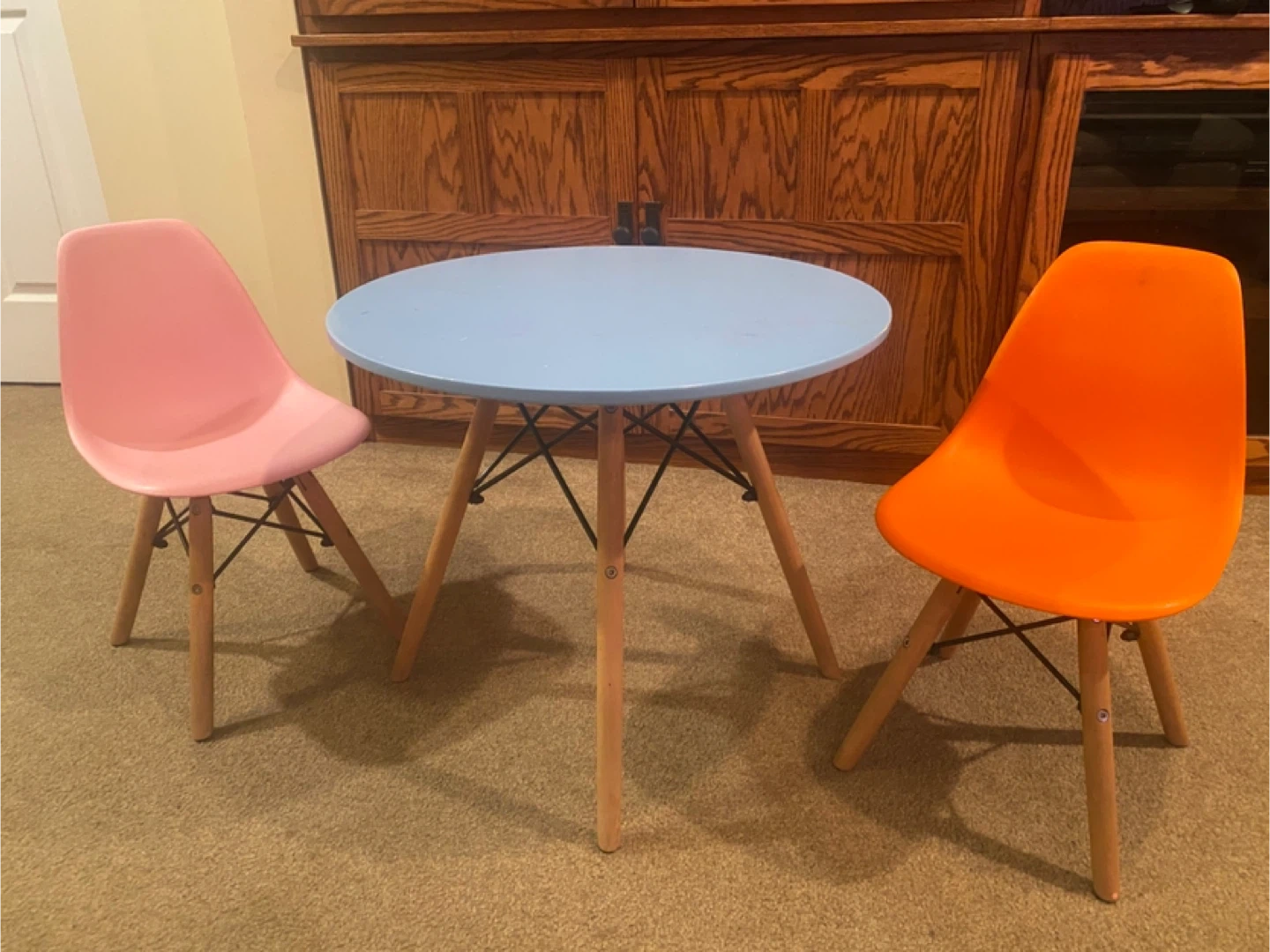 125Selling a cute kids' table and chairs set. Was used as a craft table, so there are some paint and marker stains. You may be able to remove some, I only gave it a quick wipe down. The table has a light blue top with wooden legs. One chair is pink and the other is orange.