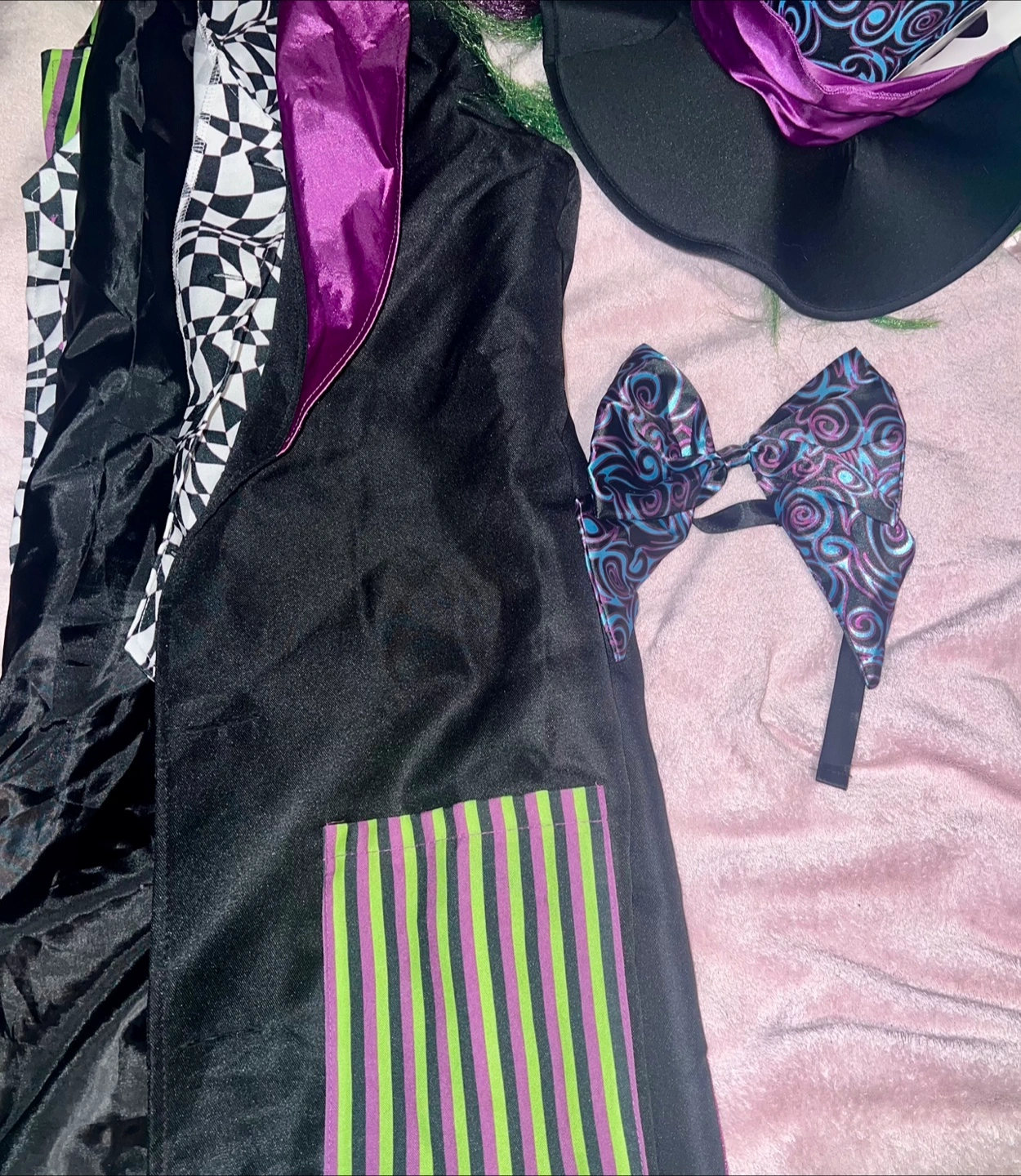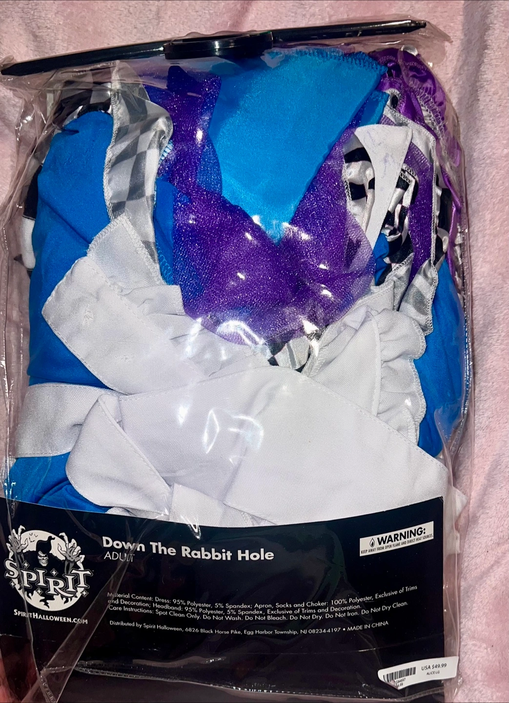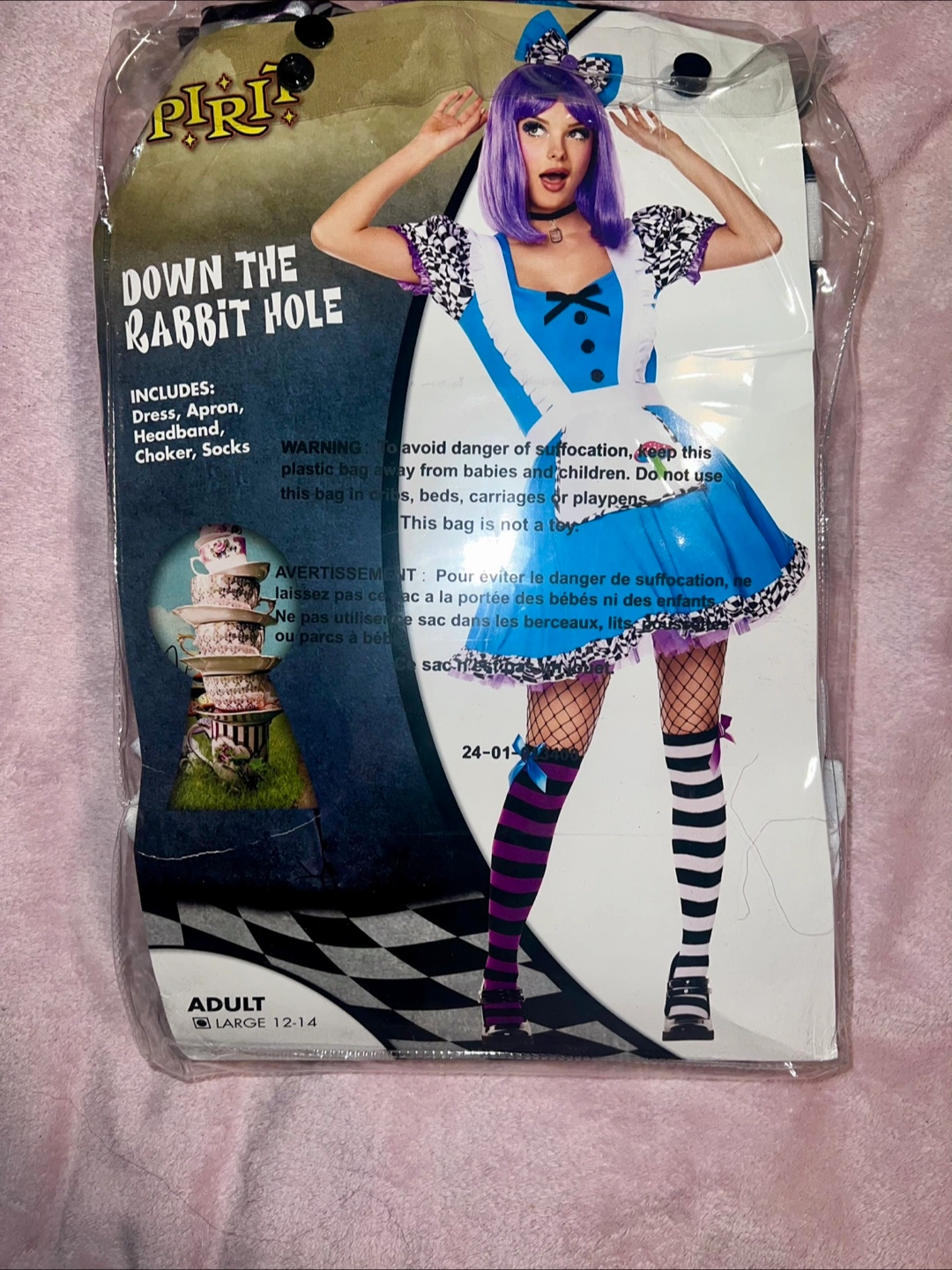 60Selling a Spirit Halloween "Down the Rabbit Hole" and Mad Hatter costumes! It's an adult size large (12-14) and includes the dress, apron, headband, choker, and socks. Also Mad Hatter’s Hat, bow tie, and jacket. The material is 95% polyester and 5% spandex. This costume is perfect for parties or Halloween especially for couples comes together.