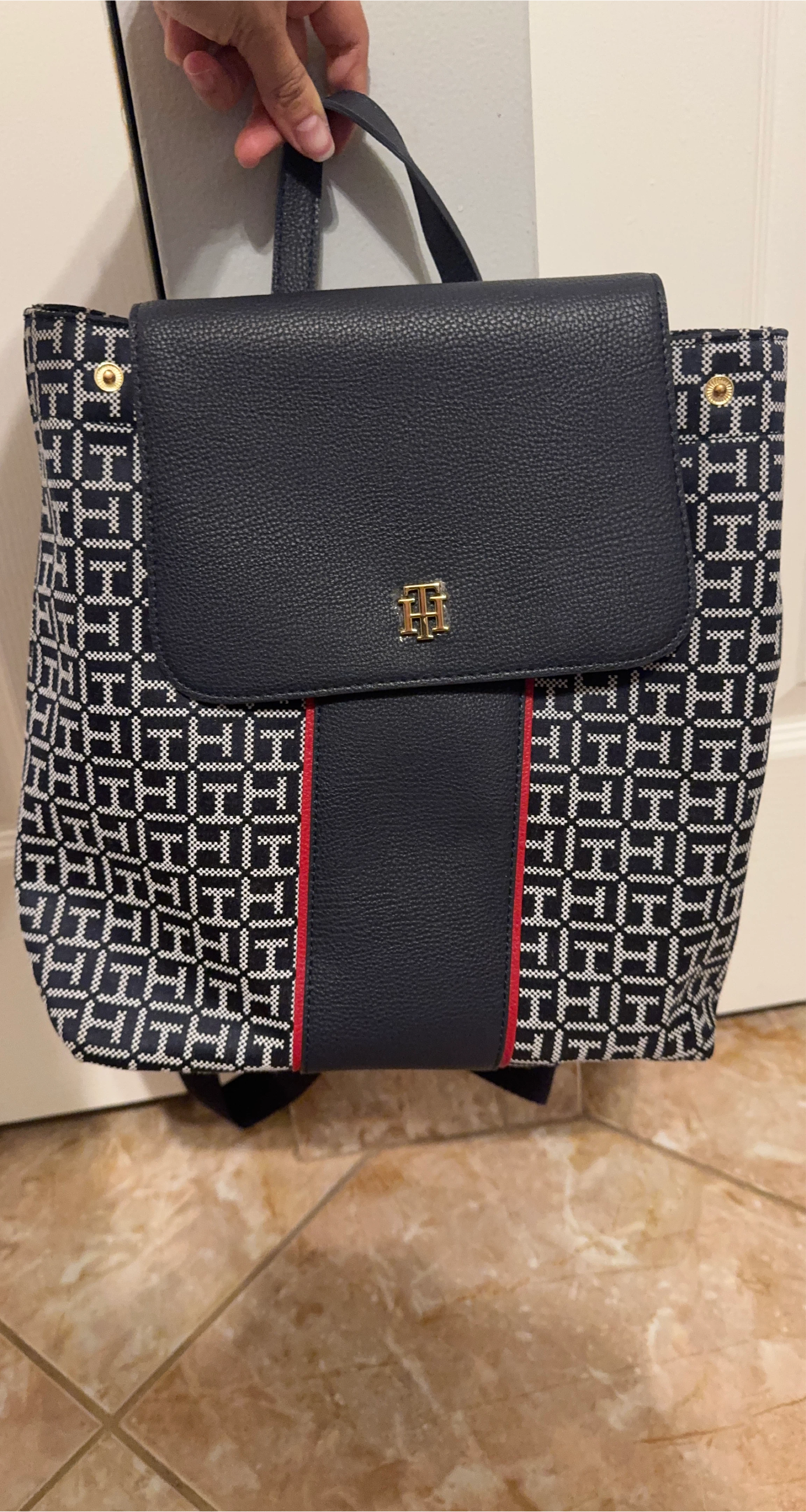 10Tommy Hilfiger backpack with the signature logo pattern. It features a navy blue flap and a vertical stripe of navy blue with red accents. Great for everyday use