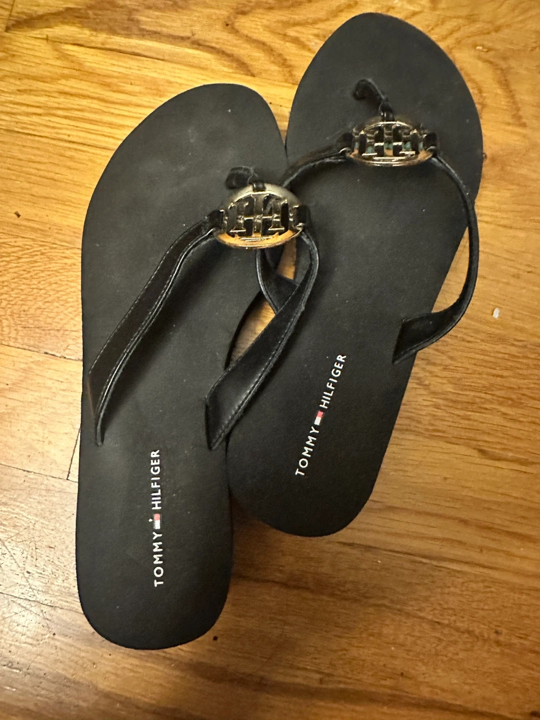 10Tommy Hilfiger black flip flops with the Tommy Hilfiger logo on the side and a gold accent on the strap