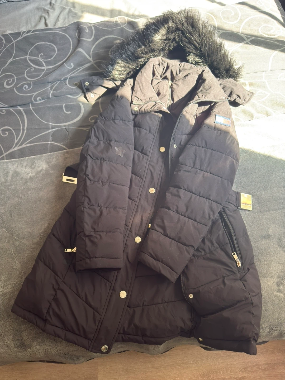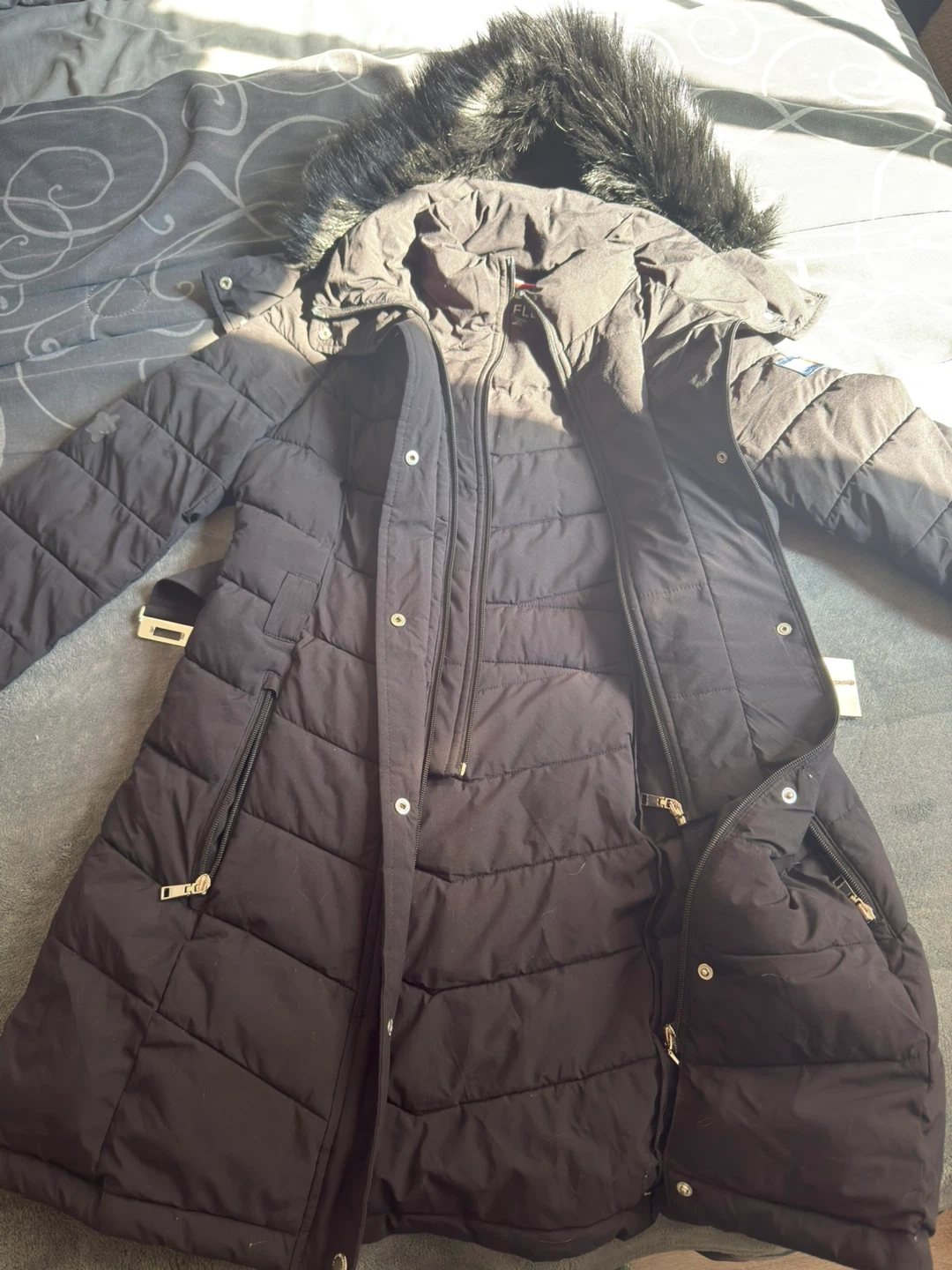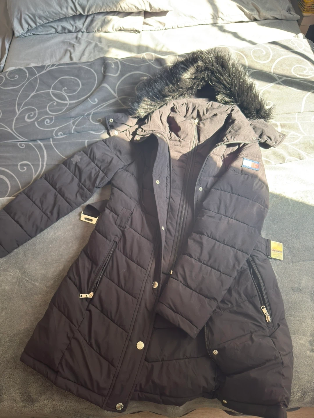 Tommy Hilfiger black puffer coat with a faux fur hood. It's in great condition and ready to keep you warm this winter!