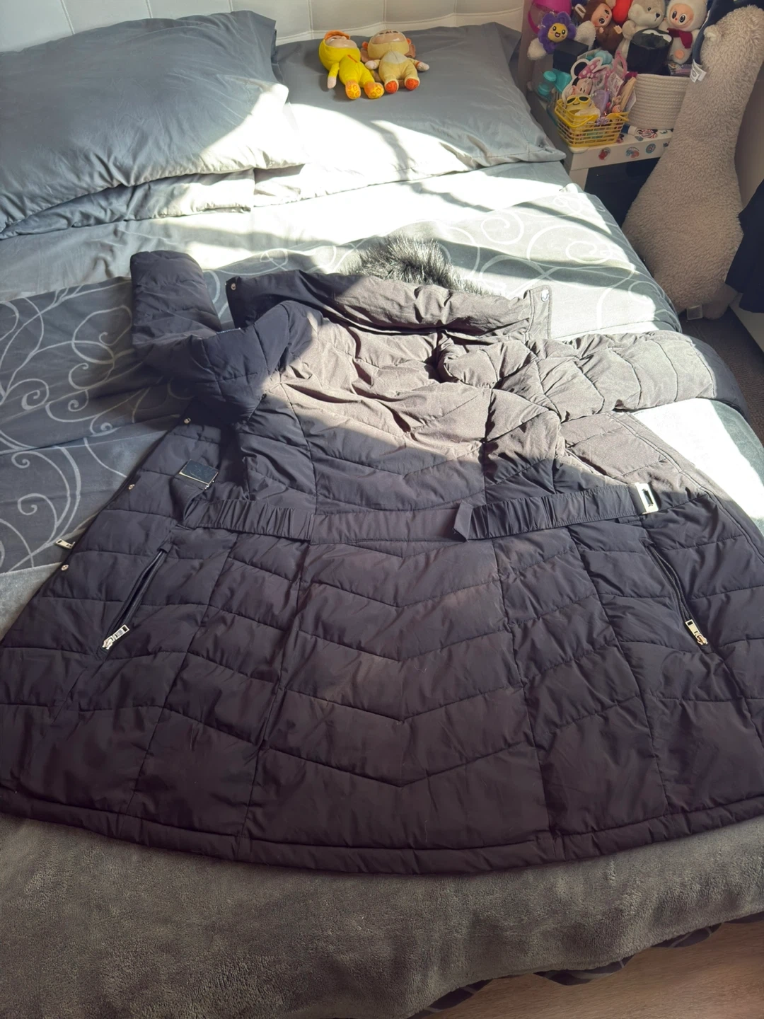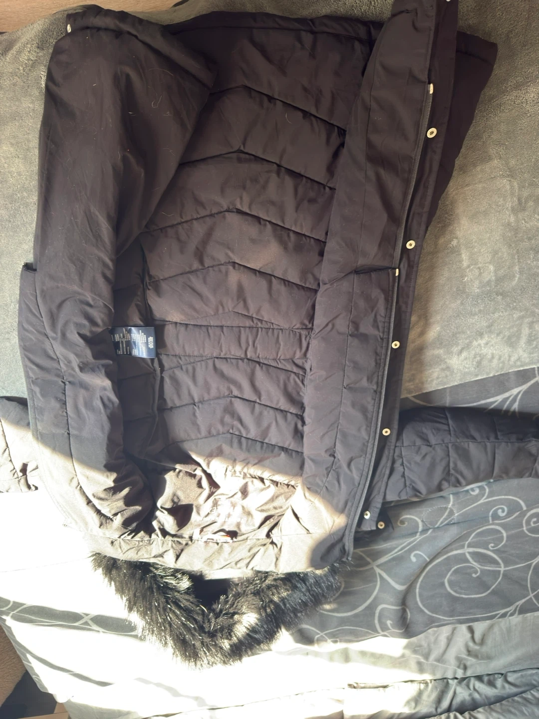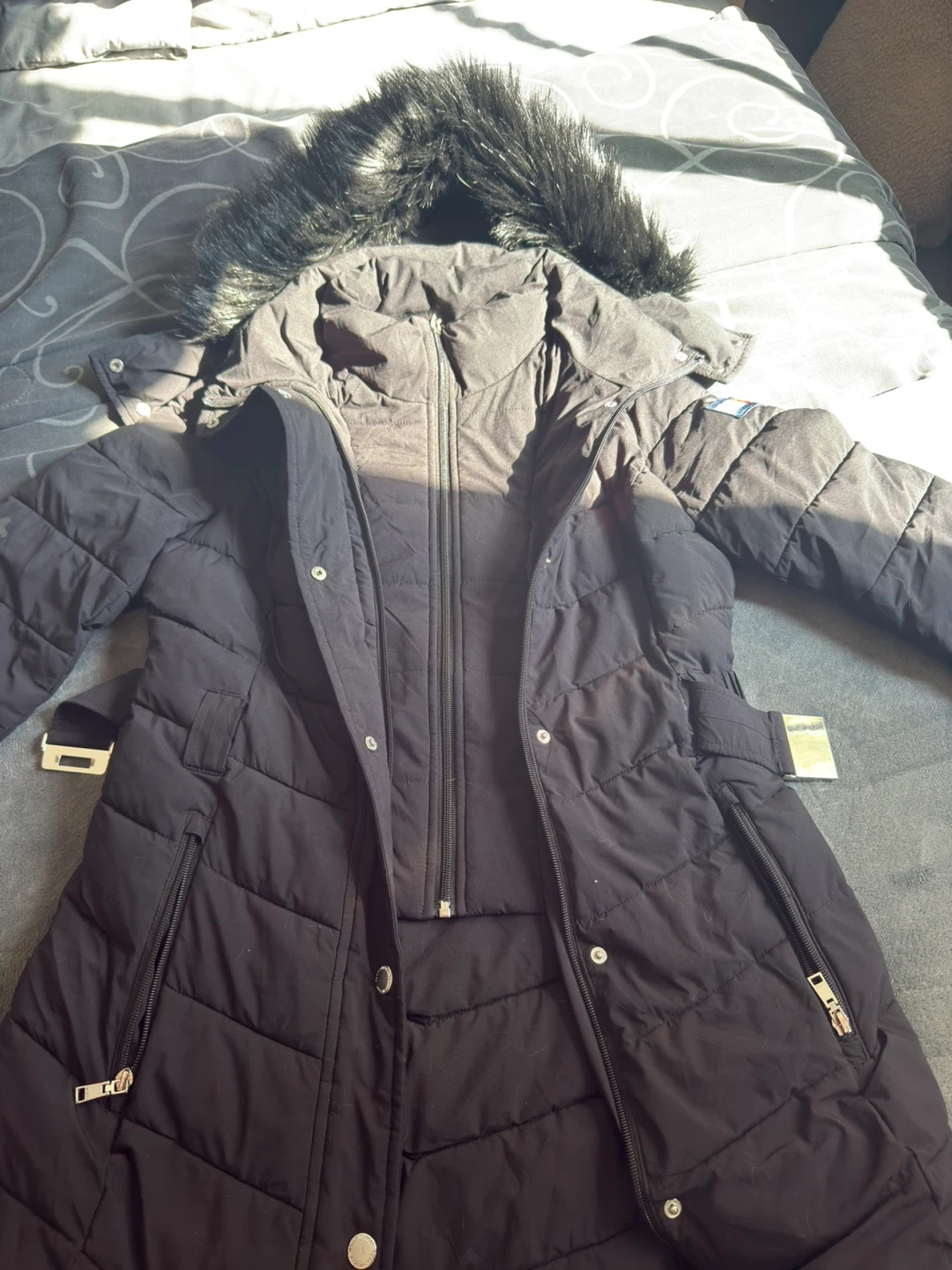 Tommy Hilfiger black puffer coat with a faux fur hood. It's in great condition and ready to keep you warm this winter!