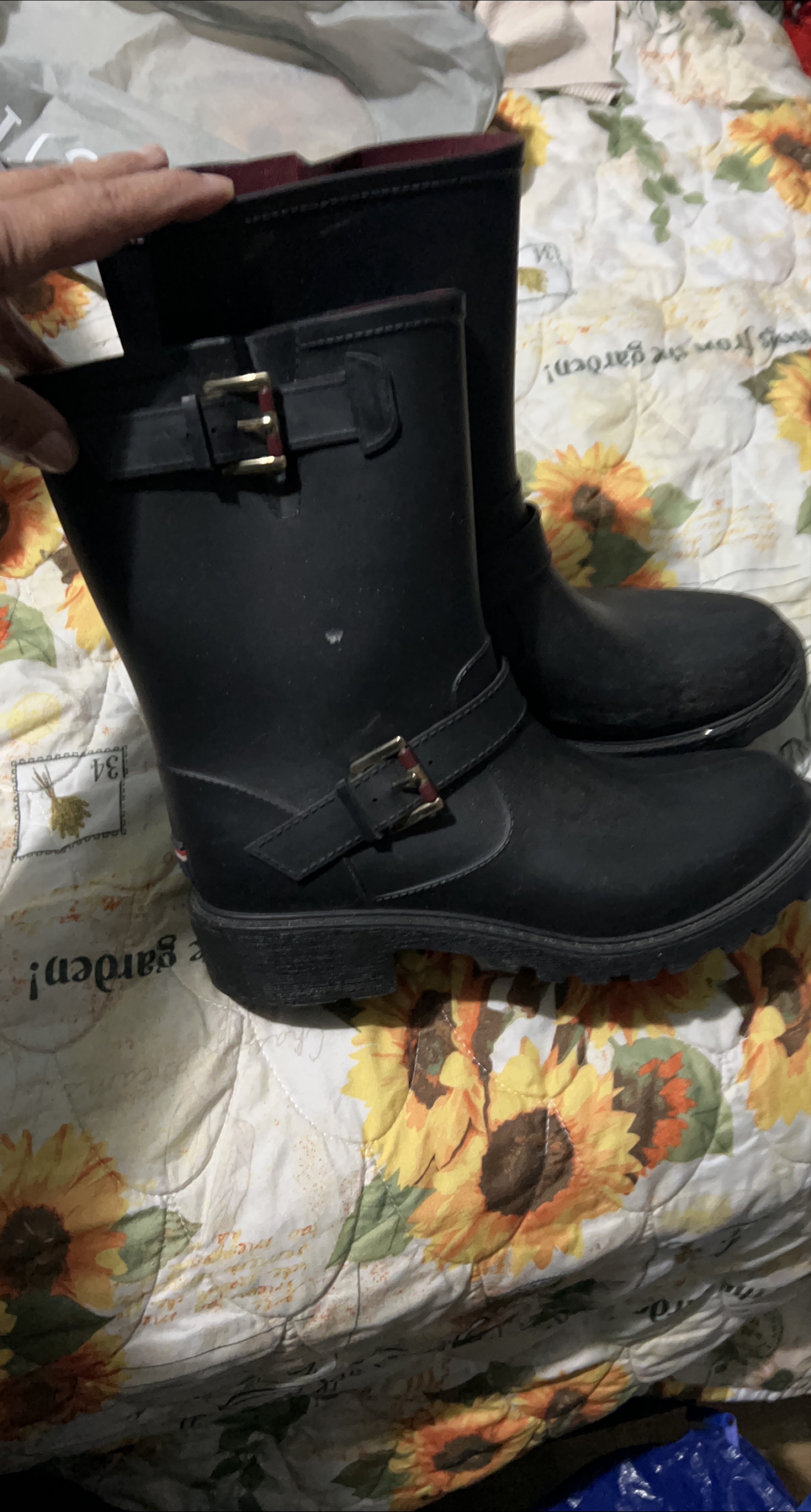 Selling a pair of Tommy Hilfiger rain boots in black. They have buckle details and are in good condition