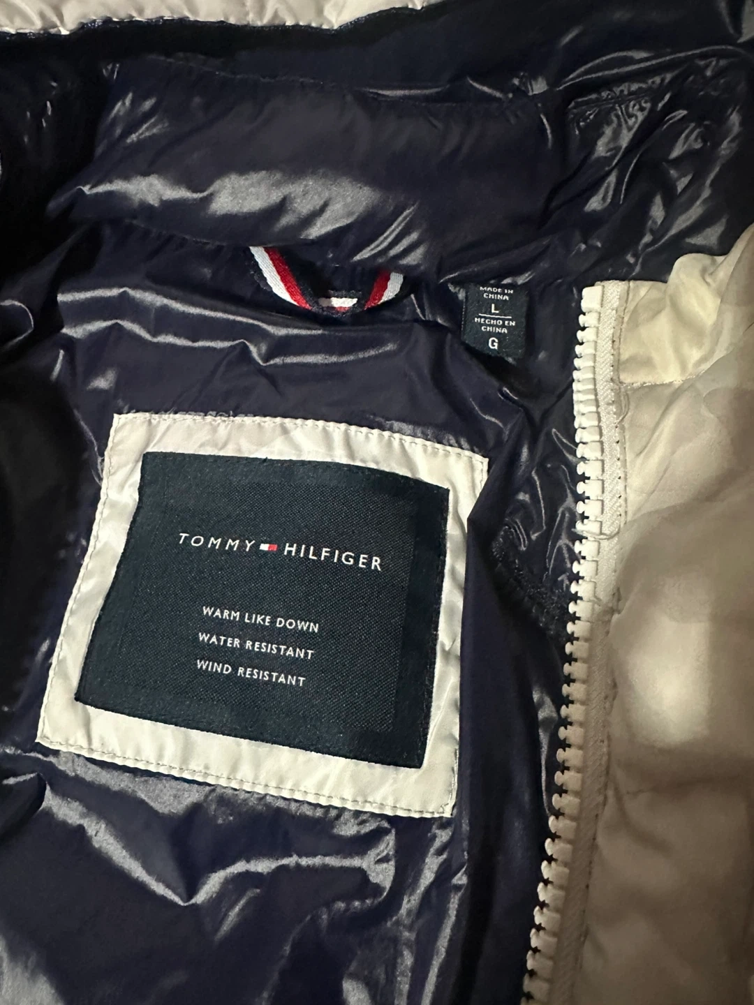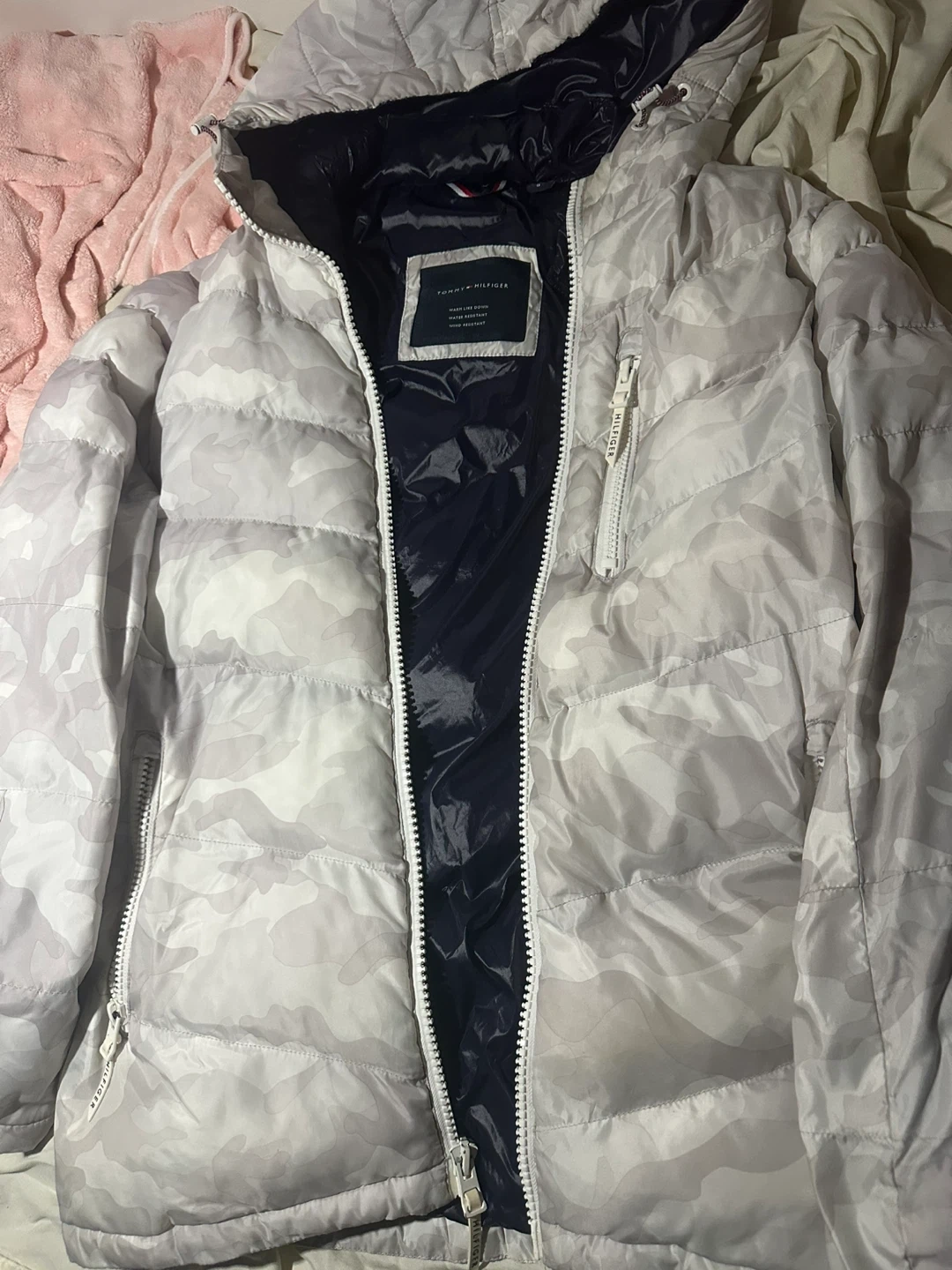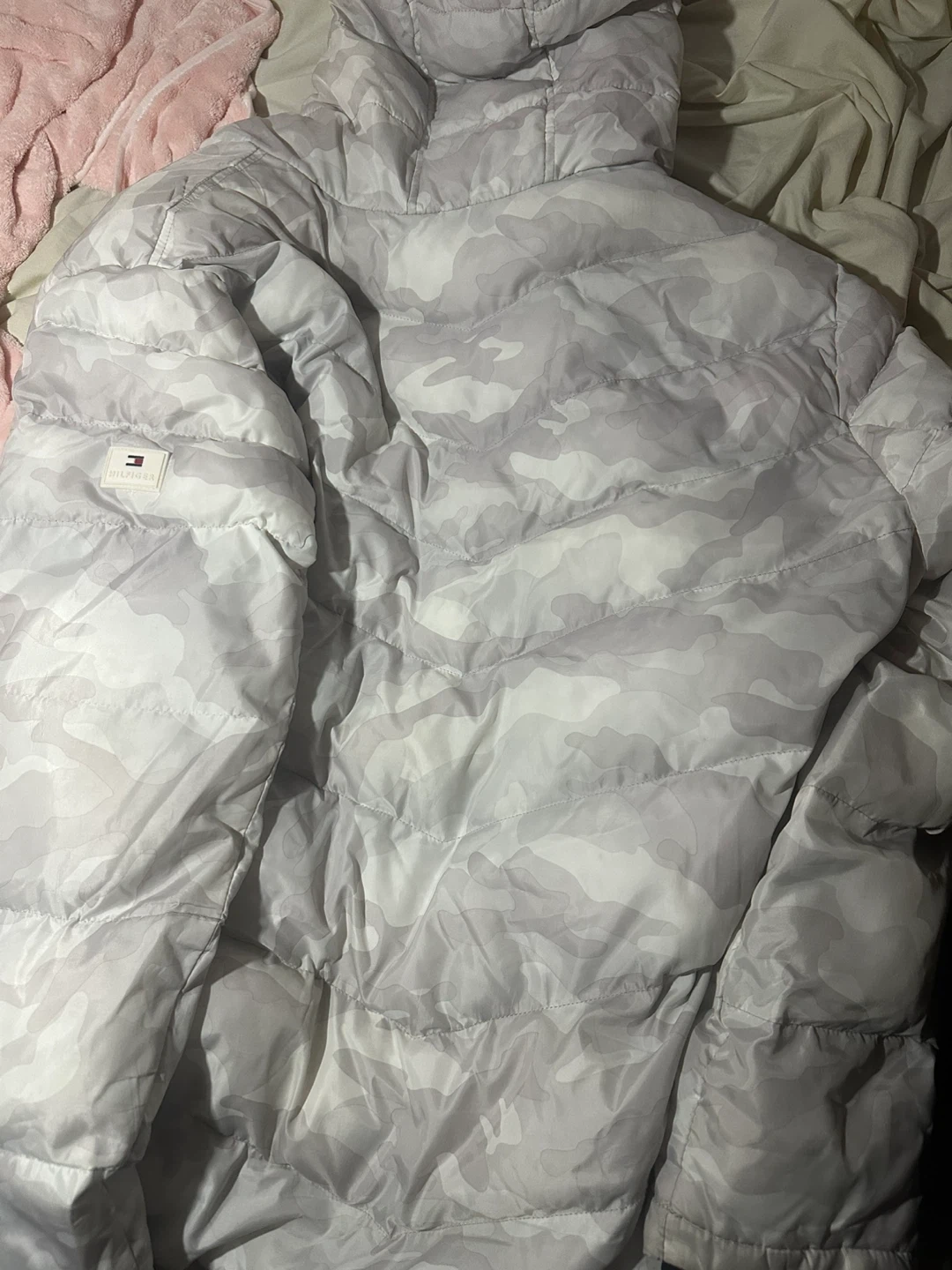 83Tommy Hilfiger puffer jacket featuring a stylish camo design! It's marked as size G Large. The jacket is warm like down, water-resistant, and wind-resistant, perfect for colder weather!