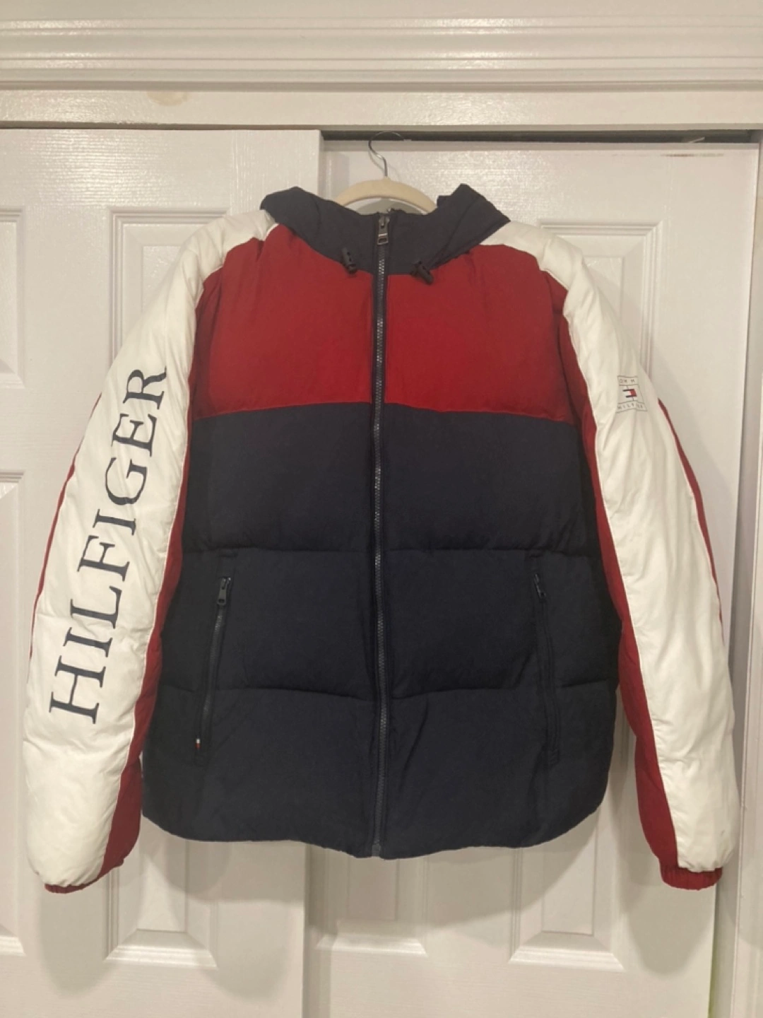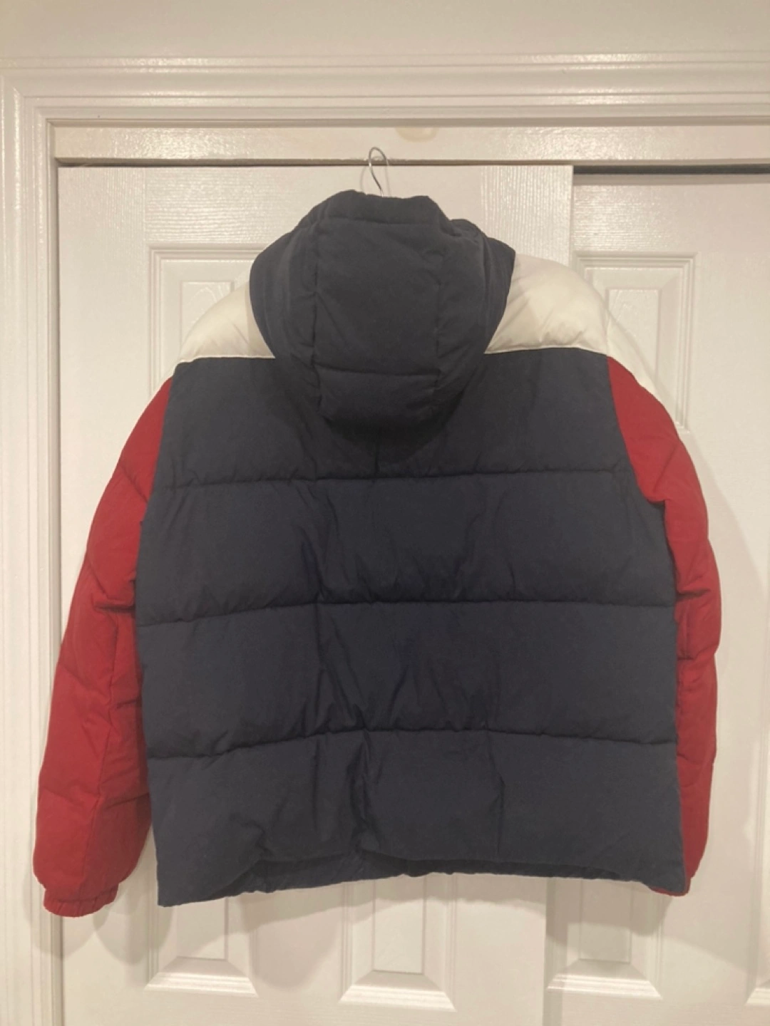 Men's jacket literally new, worn a couple of times because unfortunately I bought the wrong size. Stylish colorblocked puffer jacket. Features a navy, red, and white color scheme, includes a hood, zipper closure, side pockets. Cash only.
