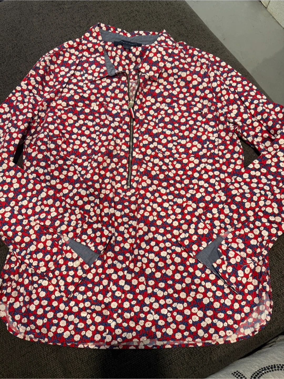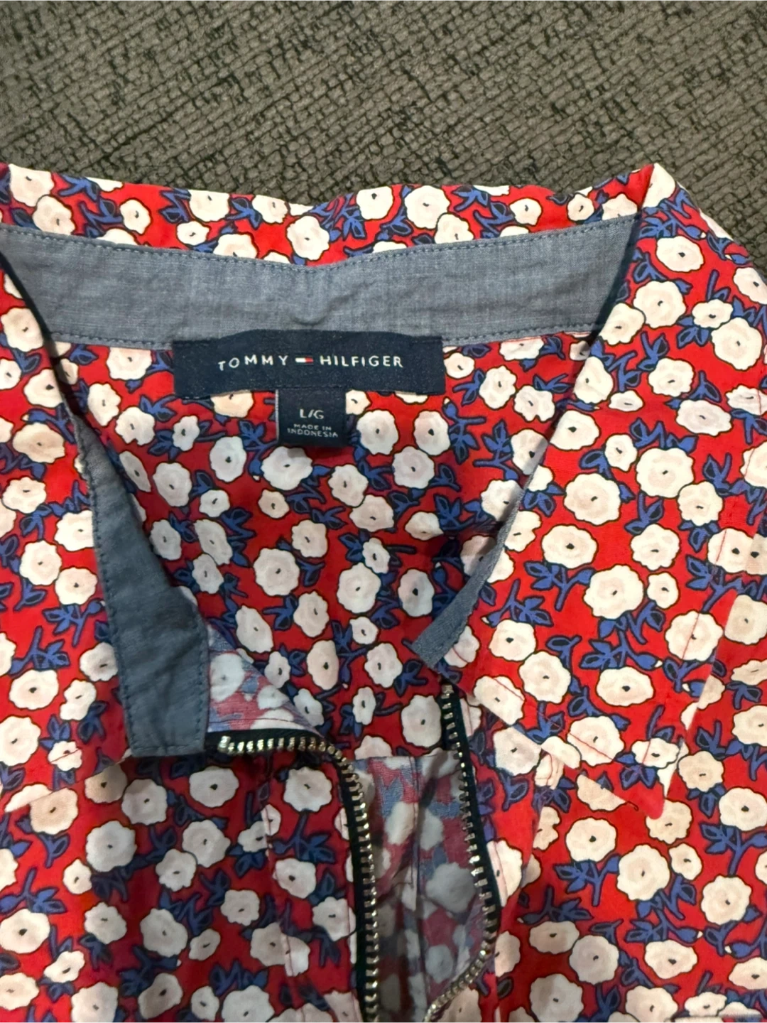 60Cute Tommy Hilfiger top with a fun floral print! It's a size L/G and features a quarter-zip neckline. The red, white, and blue floral pattern is eye-catching and perfect for adding a pop of color to your wardrobe