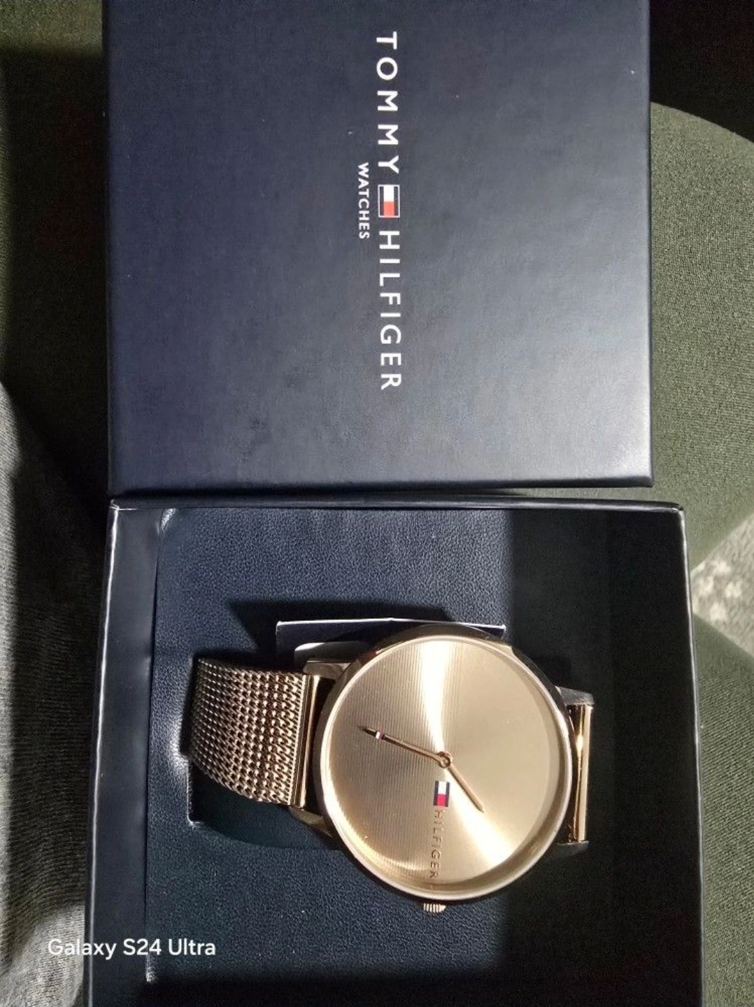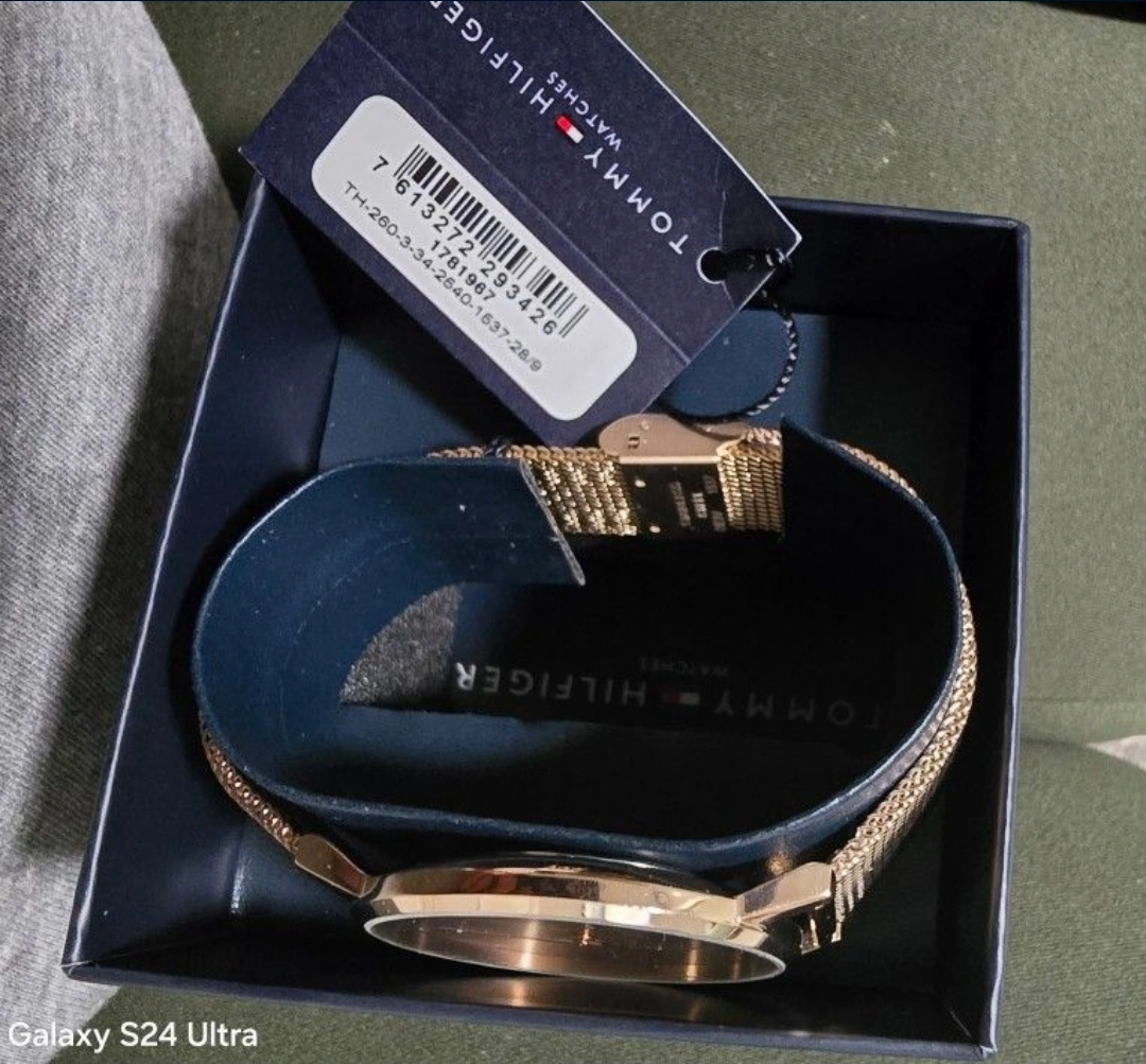 Selling an unisexTommy Hilfiger watch in gold. It comes with its original box. The watch has a mesh band and a minimalist design. It's in great condition, new condition and ready for a new owner!