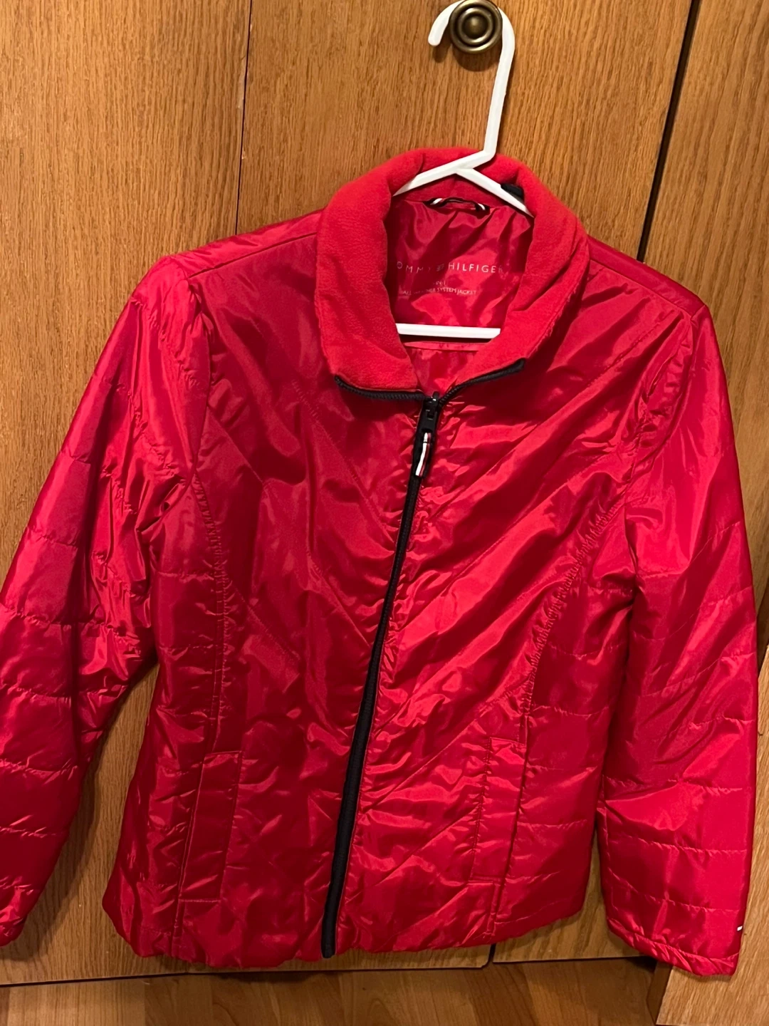 10Tommy Hilfiger puffer jacket in red! It's in great condition and ready for a new home. Perfect for staying warm and stylish during cooler weather