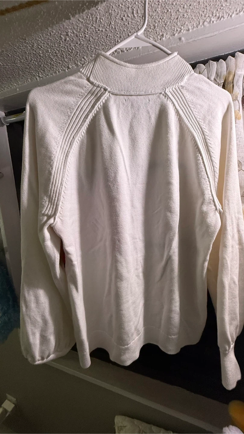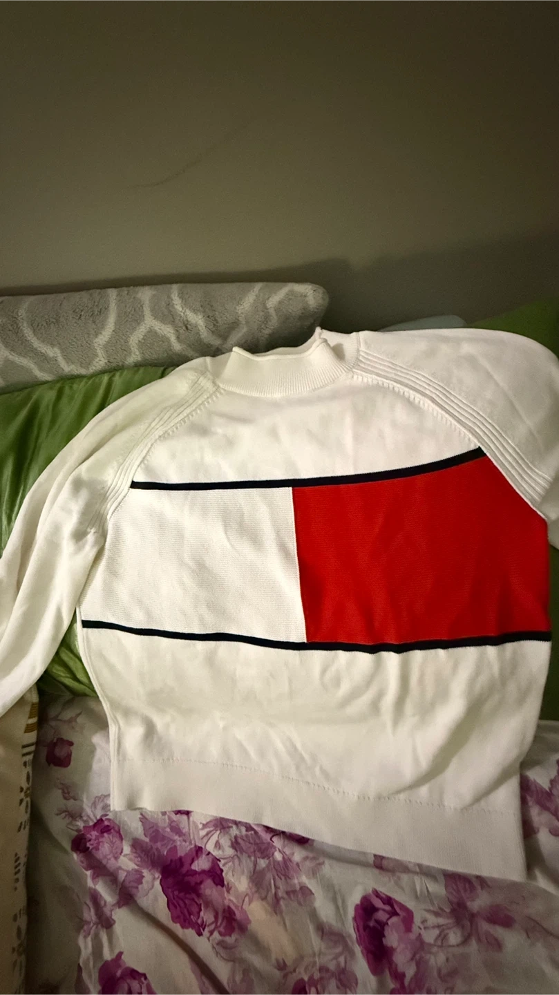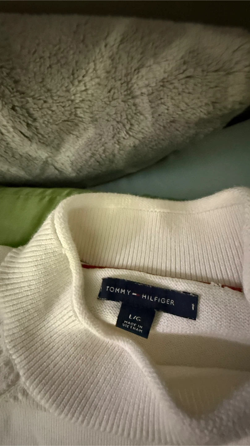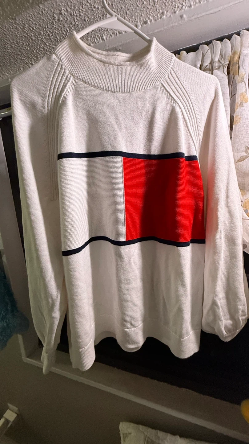 60Selling a Tommy Hilfiger white sweater in size large. It features the classic Tommy Hilfiger flag design. Perfect for a casual look!