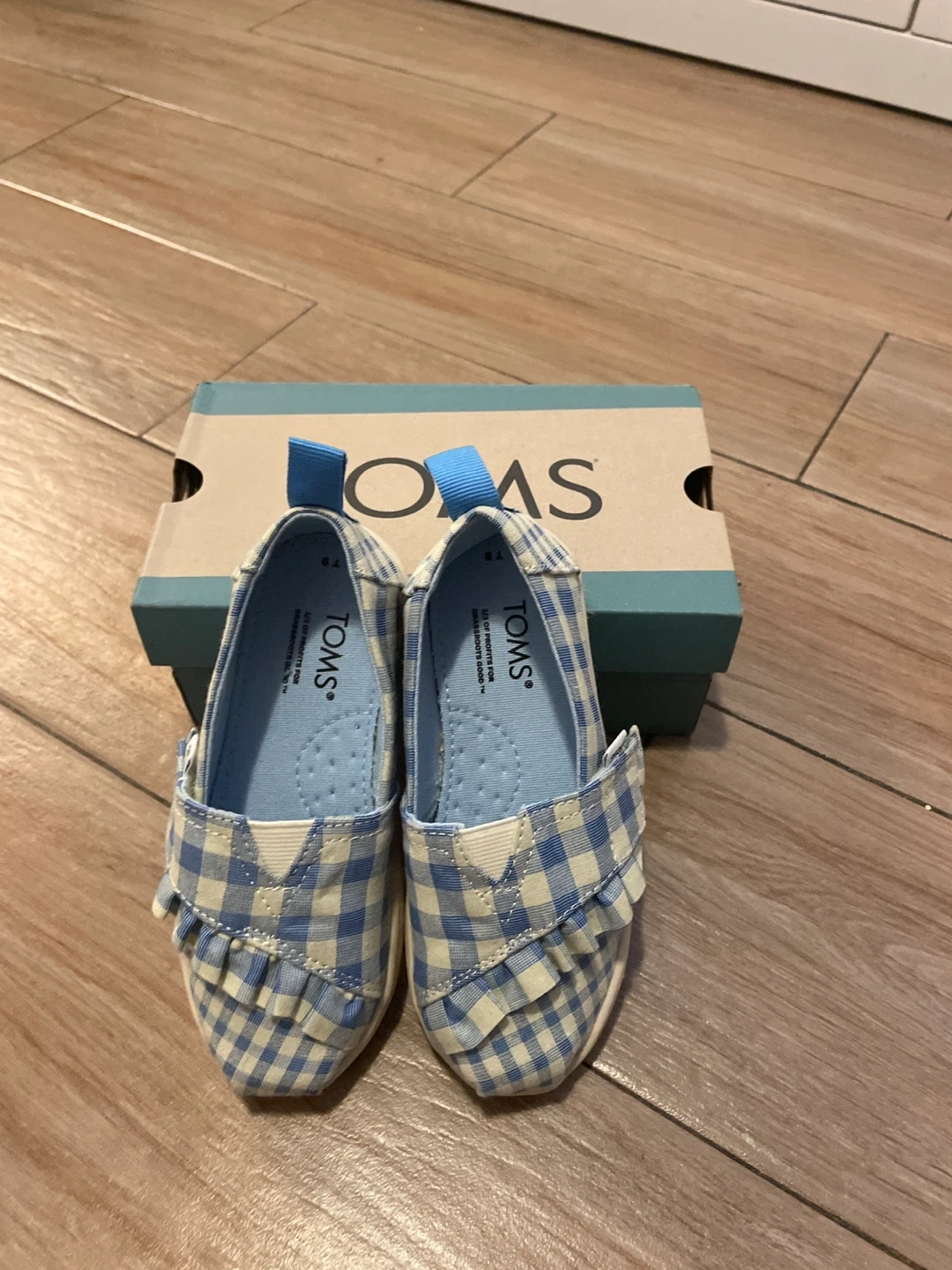Selling a pair of TOMS shoes with a cute blue gingham ruffle design! They come with the original box. Perfect for adding a touch of style to any outfit
