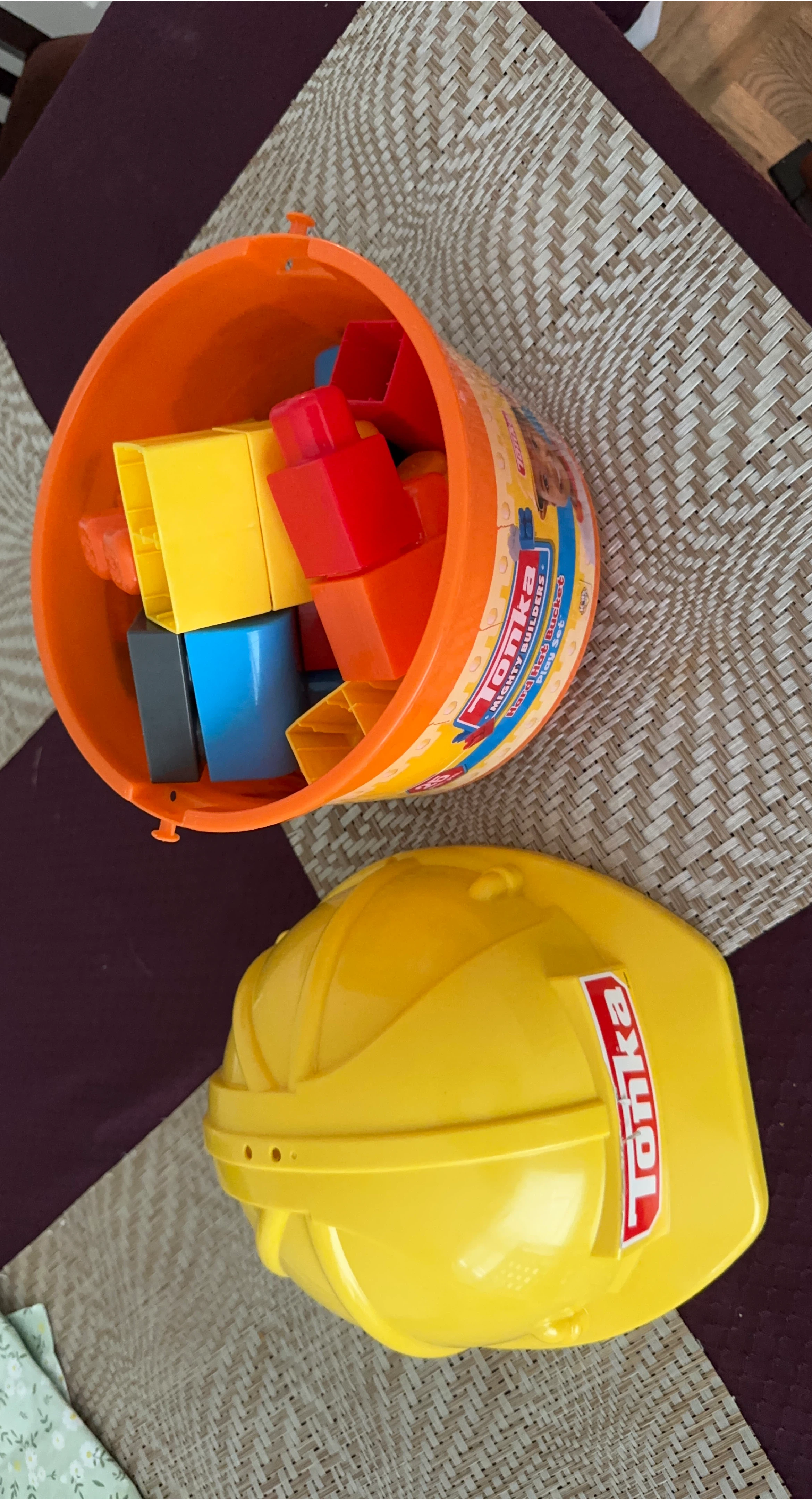 Tonka Mighty Builders Hard Hat Bucket Play Set includes a yellow hard hat and a bucket filled with colorful building blocks! The bucket is orange and the blocks are red, yellow, blue, and gray. Perfect for imaginative play!